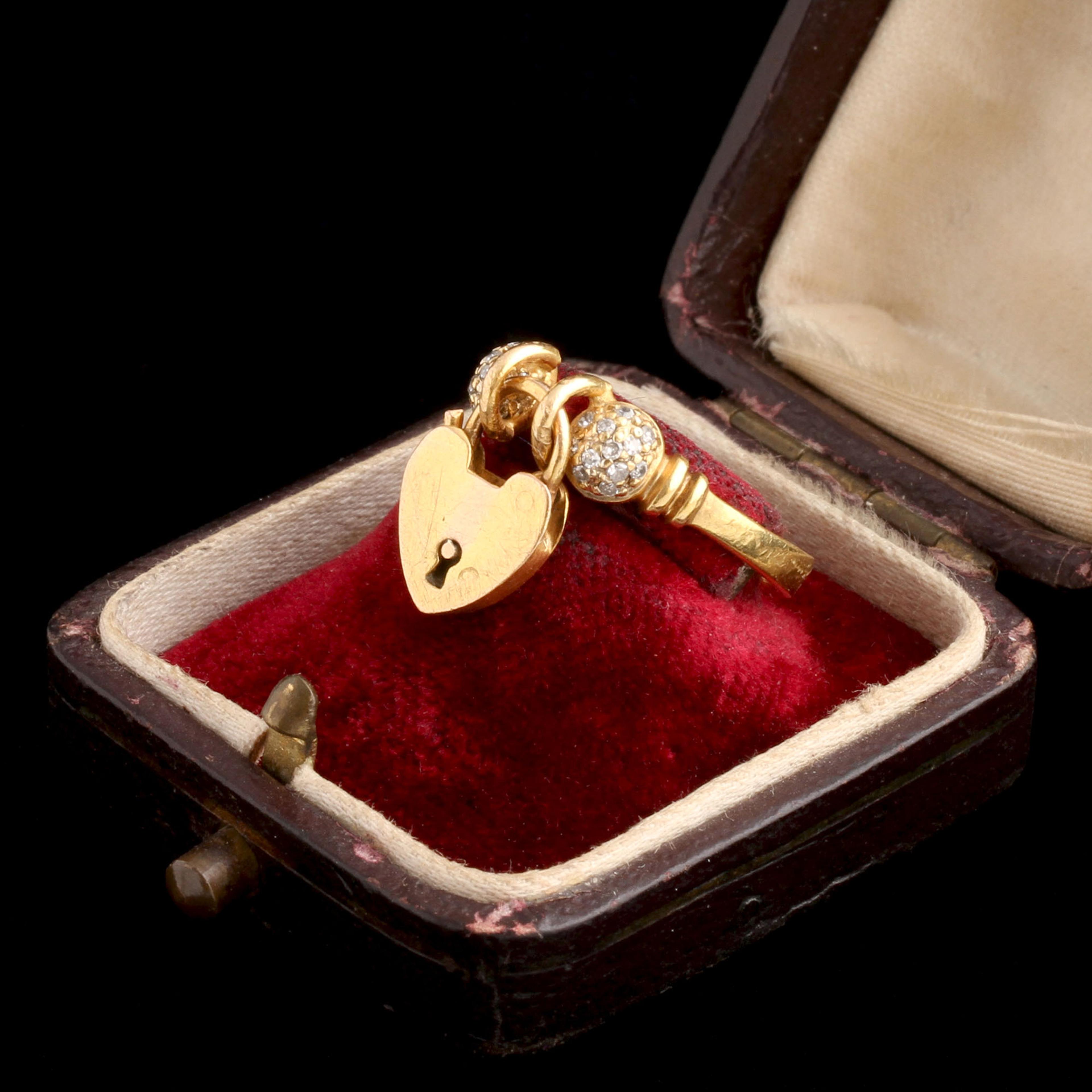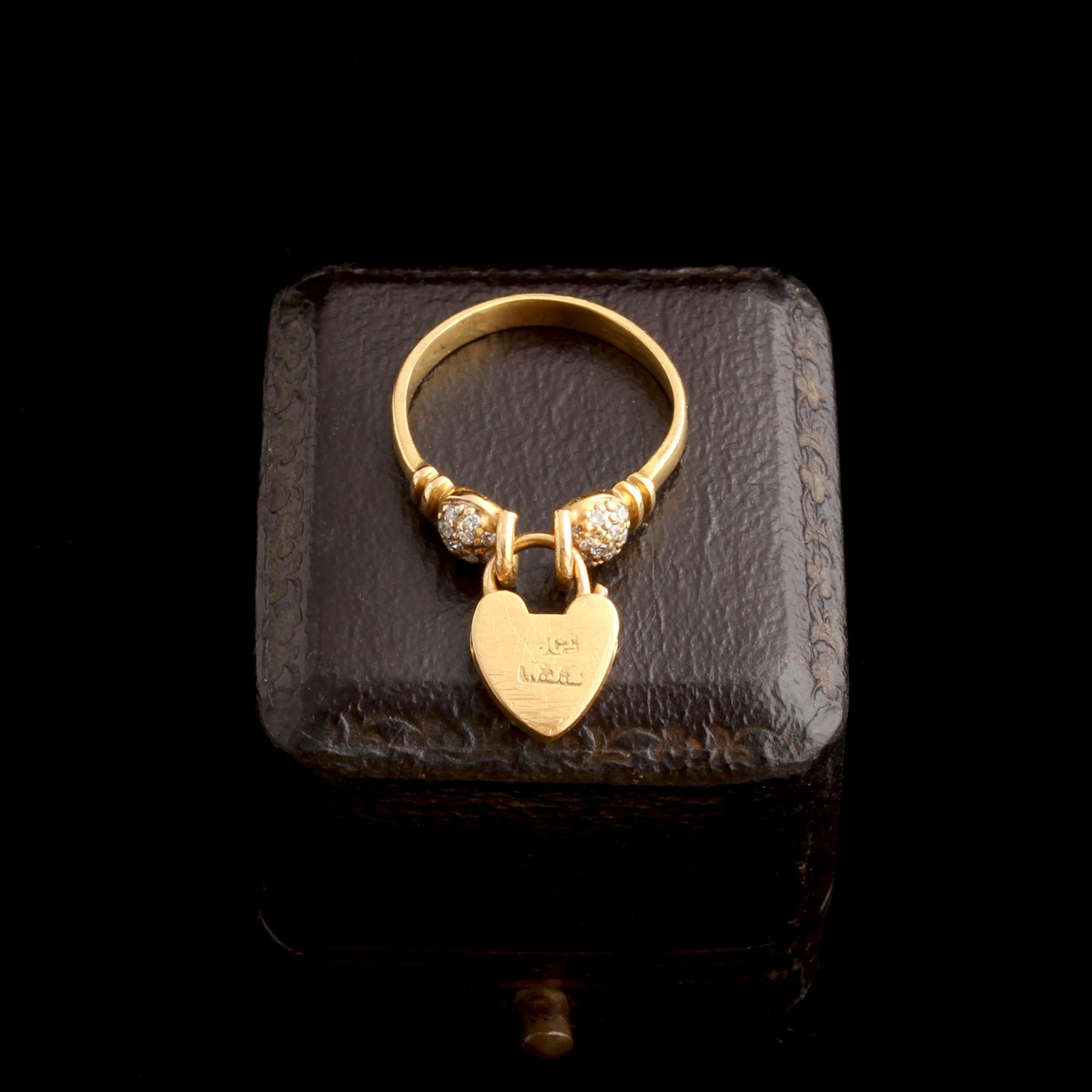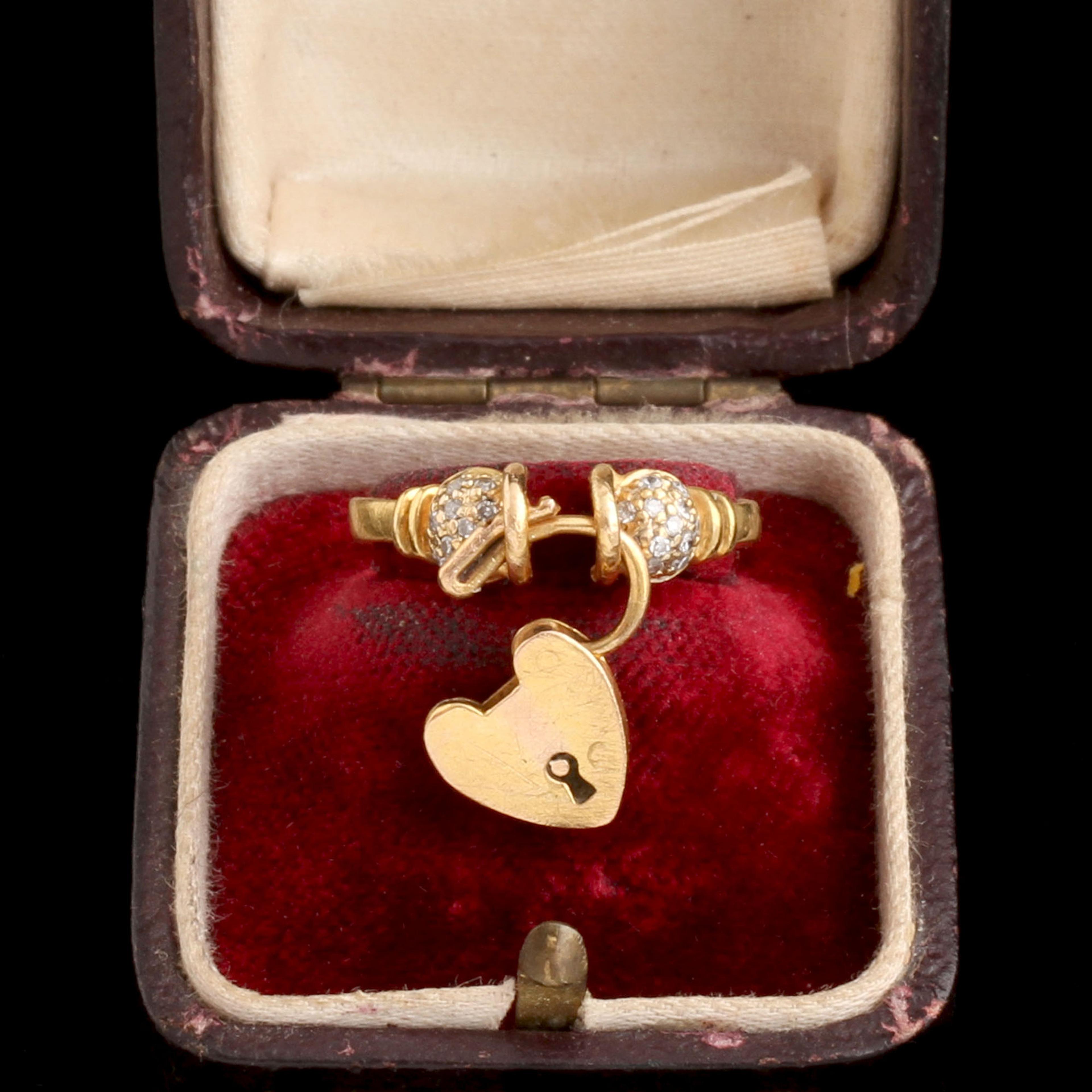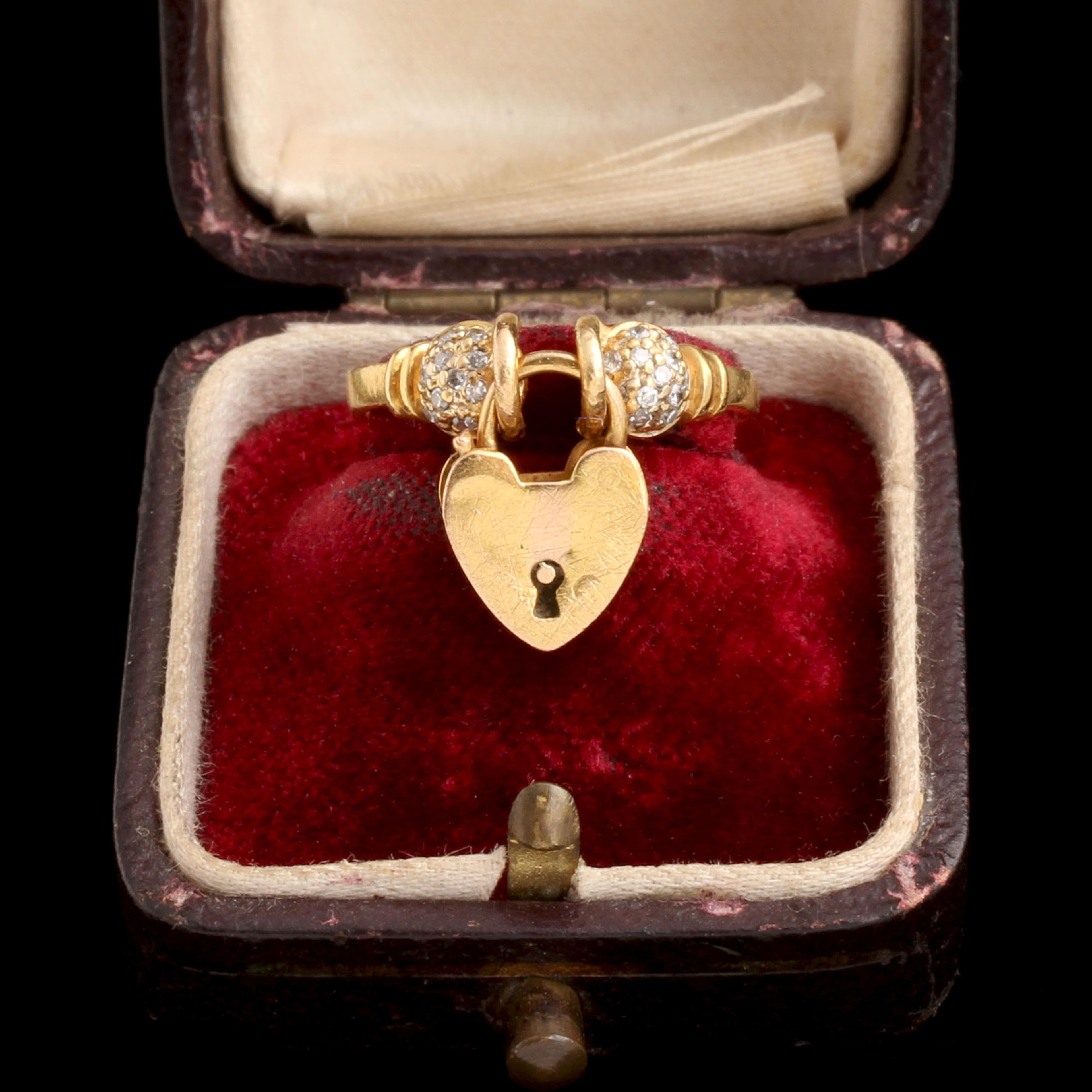 We've seen many of these tiny padlocks fasten an antique bracelet closed, but the ring variations are less common. The symbolism is not particularly subtle - a commitment, a promise, a love that has been locked in. The lock - still in working order - is flanked by two spheres studded with single cut diamonds.