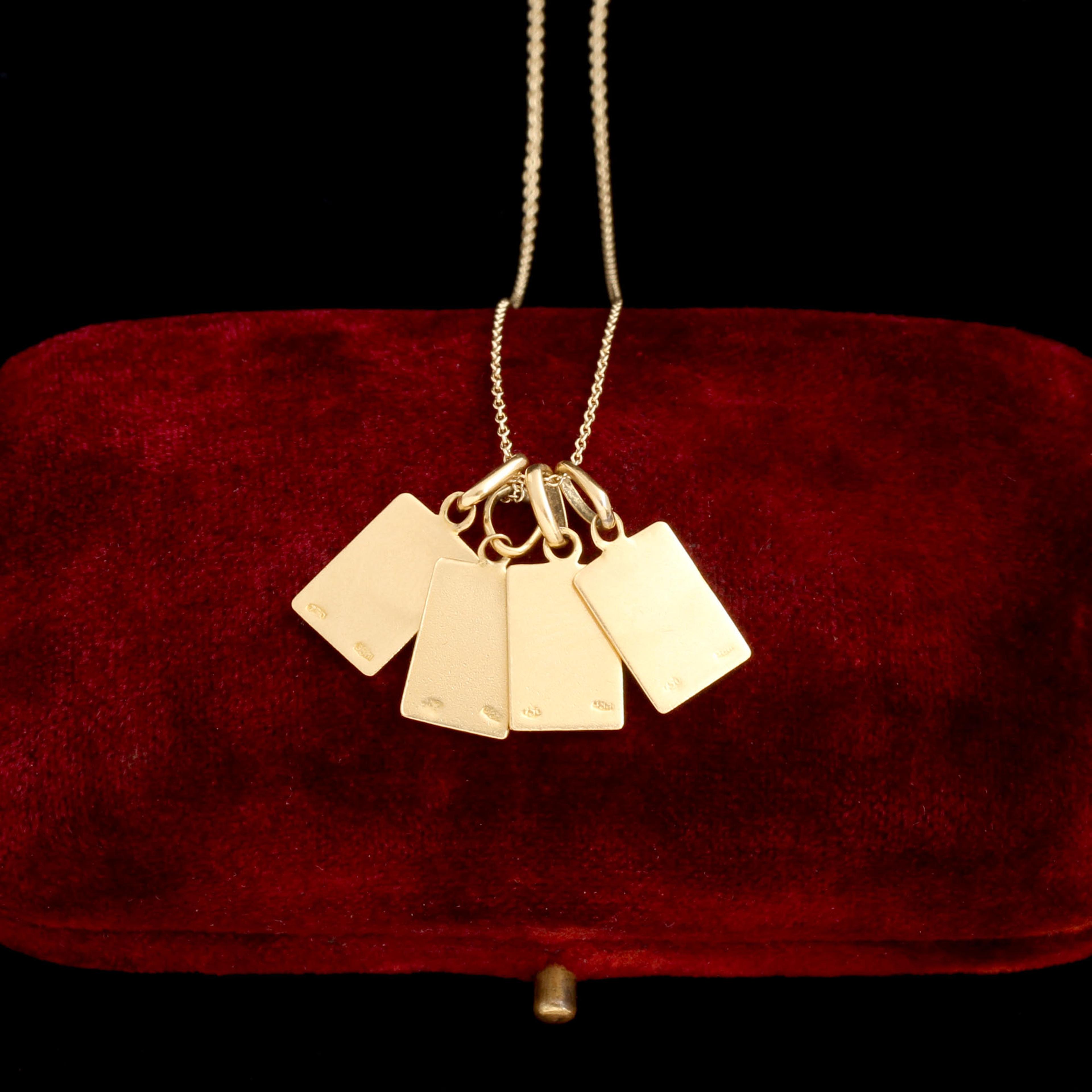 THIS SET OF four Italian ace charms—spade, heart, diamond, and club—was made in 18k gold with enamel detailing and bears Milan assay marks dating to 1938. Each miniature playing card is a symbol of chance and fortune, but together they form a gambler’s dream: four of a kind. Whether worn solo or as a stacked set, these Retro-era talismans carry the thrill, risk, and hope of a lucky break.
