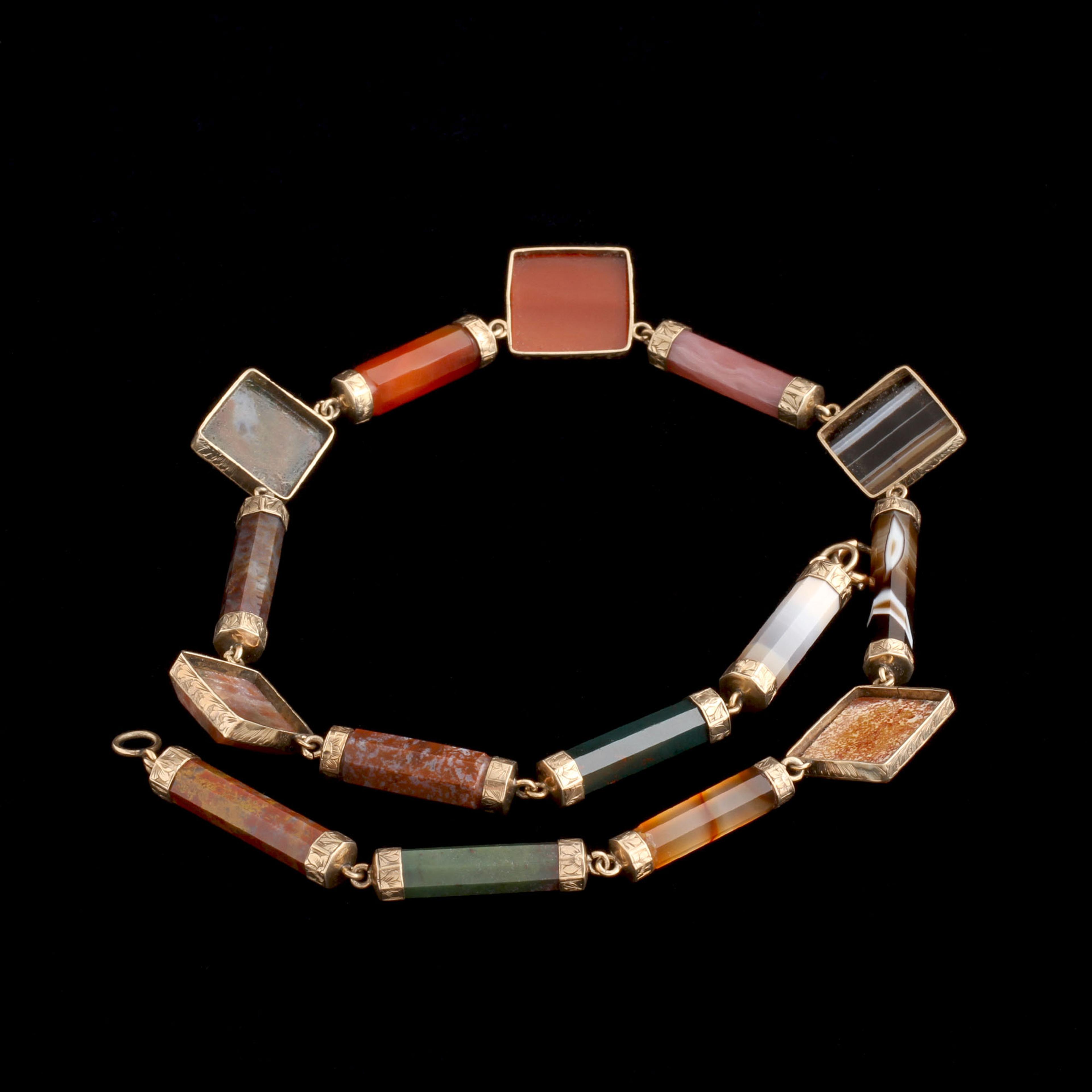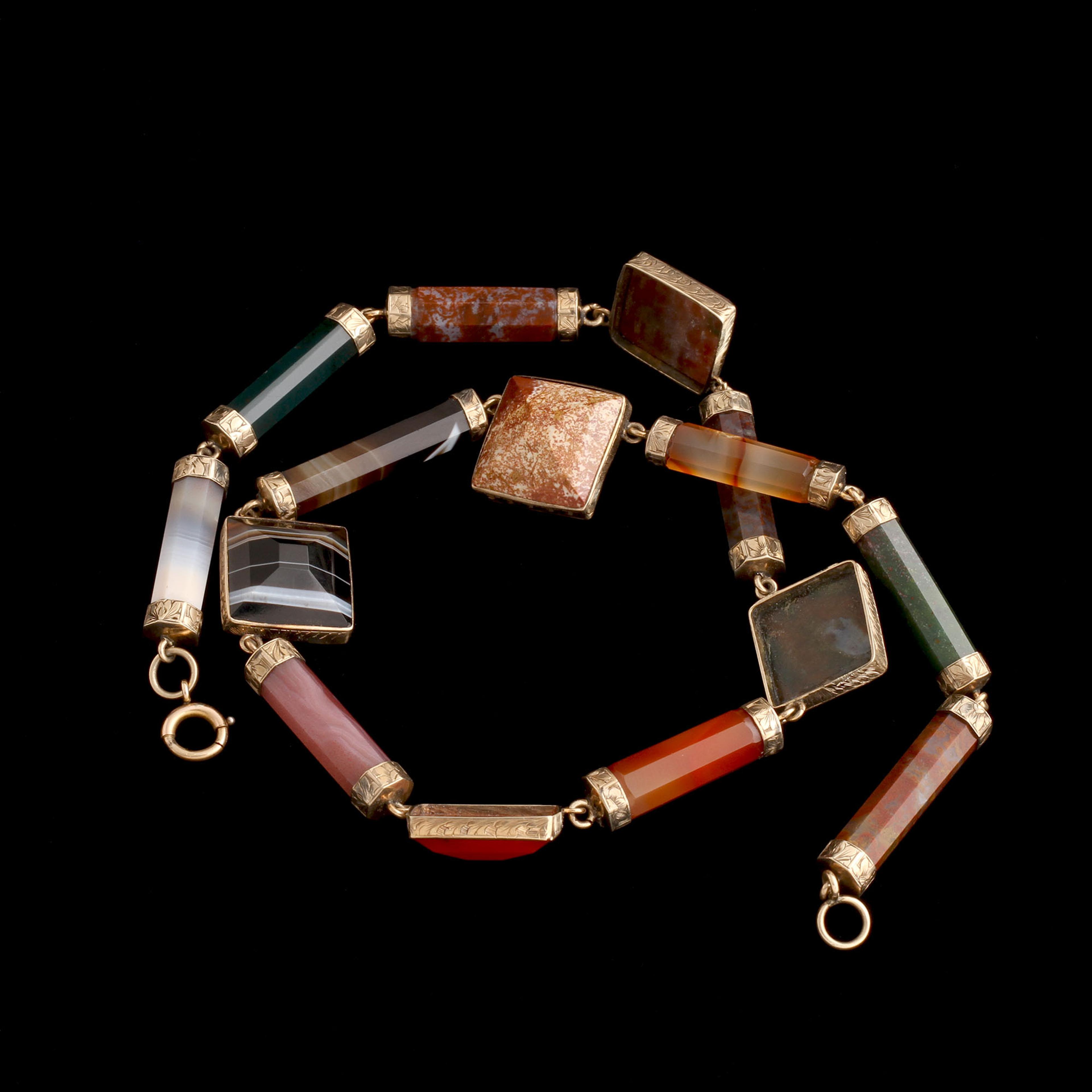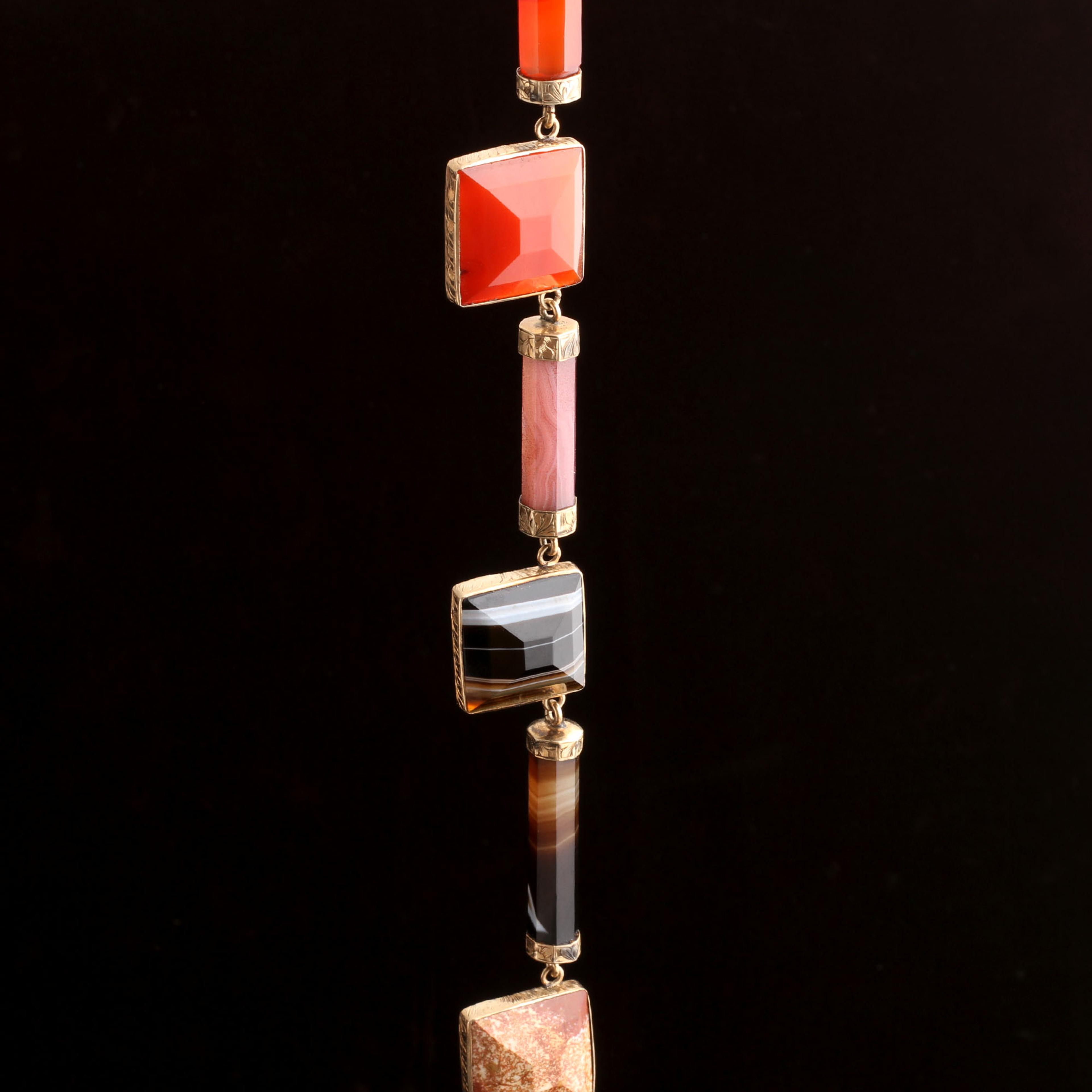 This necklace showcases the geological pride of Victorian Scotland. Agate and jasper, often quarried locally, were prized across the UK and beyond for their saturated colors and wild patterns. Queen Victoria helped popularize the trend of using native Scottish stones in jewelry after falling in love with the landscape around her country home, Balmoral. The world followed her lead. Scottish hardstone jewelry wasn't meant to be private. It loudly expressed your heritage and your love for Caledonia, even if you weren't Scottish, or had never been there.