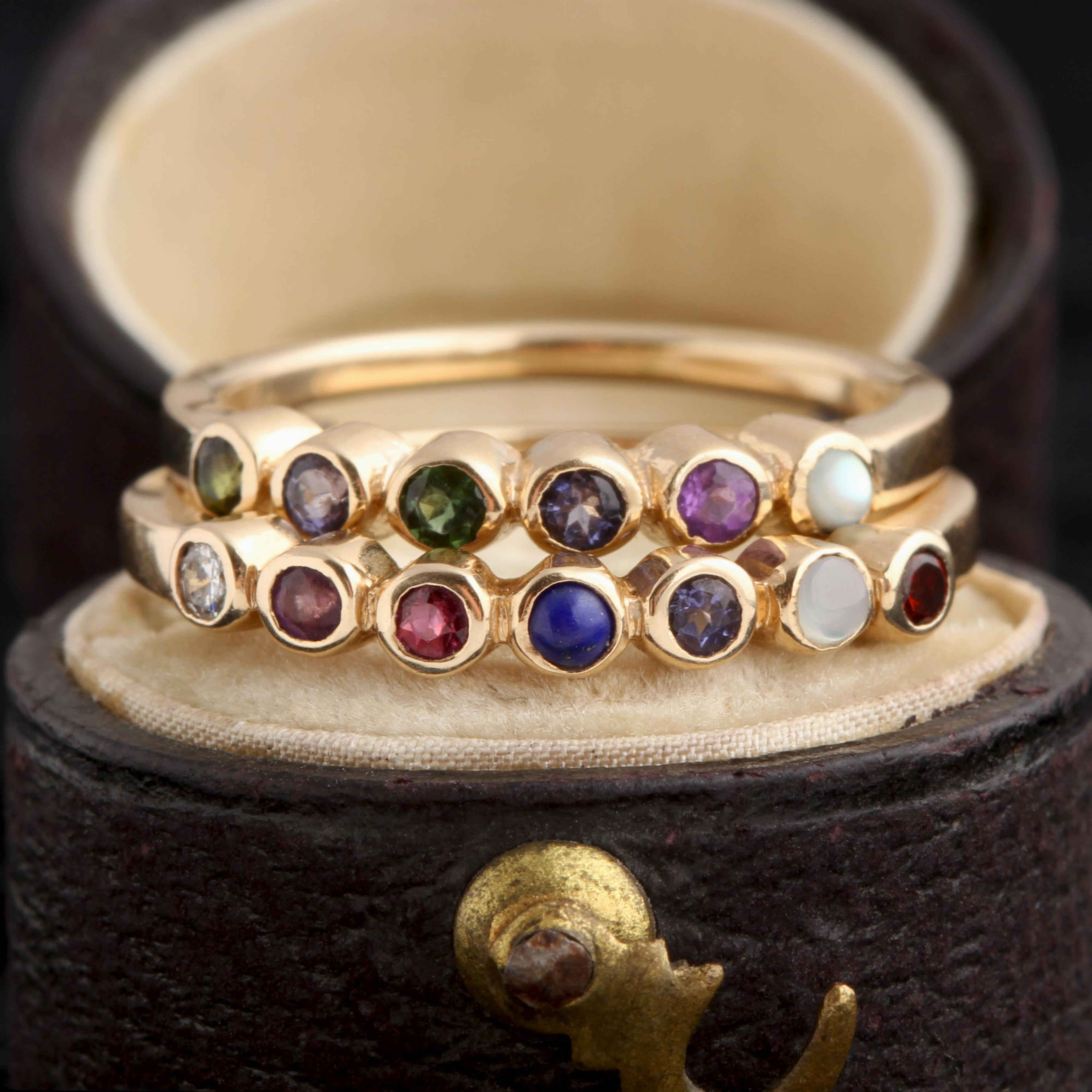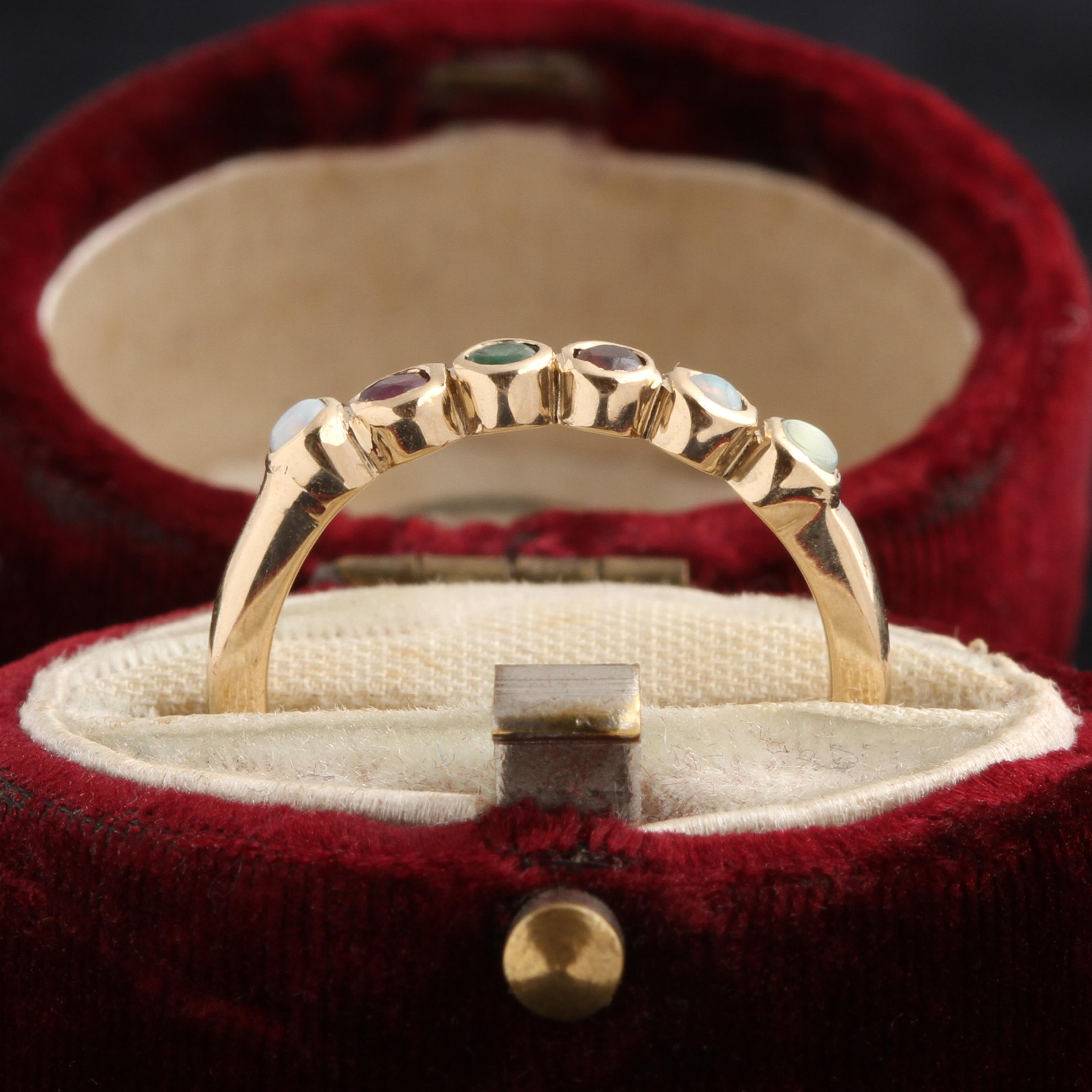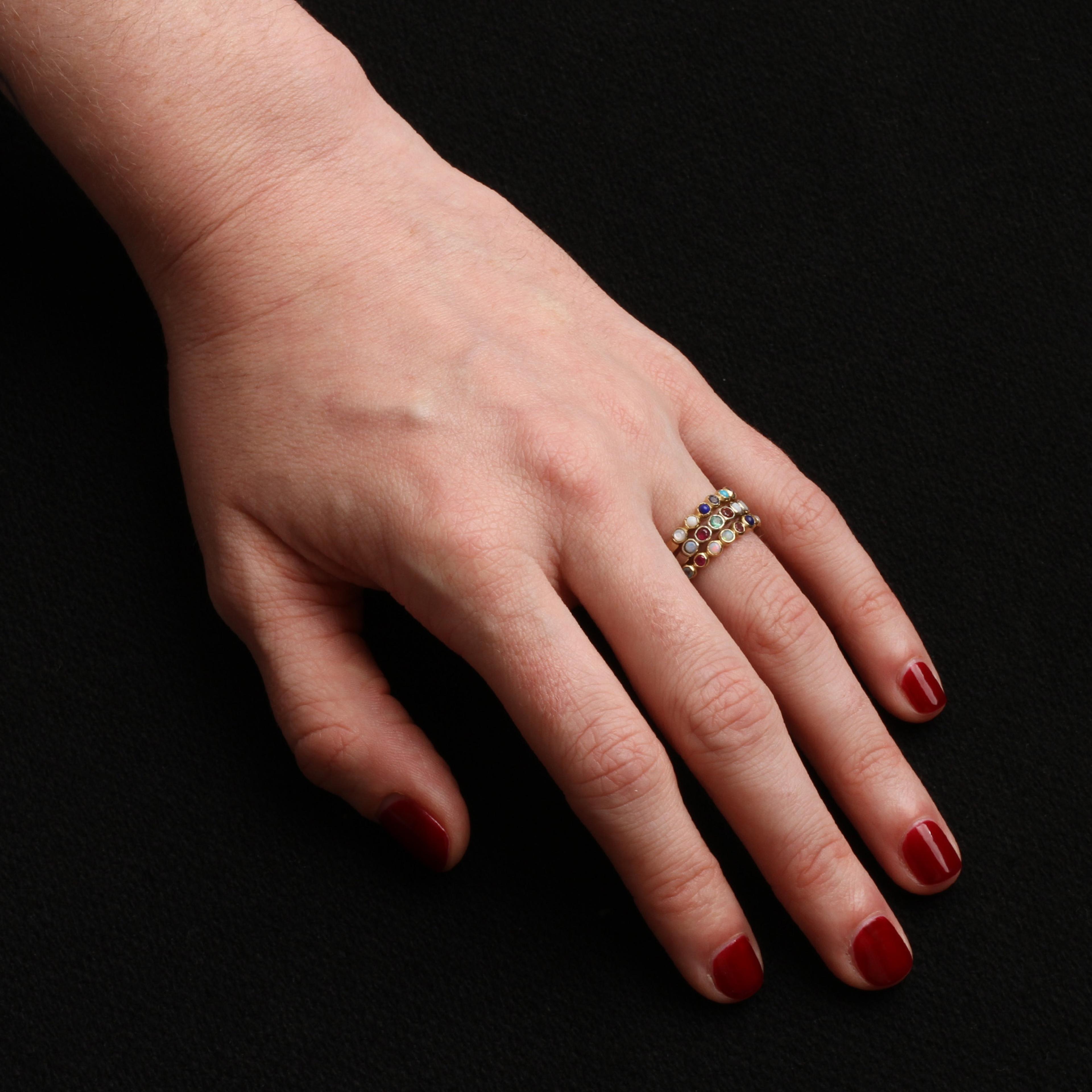 Now available in white, rose, or yellow gold! Intimate, colorful, and encoded acrostic jewelry first appeared in the early 1800's. Each letter of the alphabet was made to correspond with a different precious gemstone, and the so-called "secret language of gems" was born. For example, a Victorian favorite combo, "DEAREST", would be "spelled" this way: Diamond, Emerald, Amethyst, Ruby, Emerald, Sapphire, Turquoise. Get it? Our acrostic ring is a completely personal way to celebrate an important event, express a sentiment, or wear a loved one's name. Customize yours using our interactive stone-picker - we won't tell a soul what it says.
