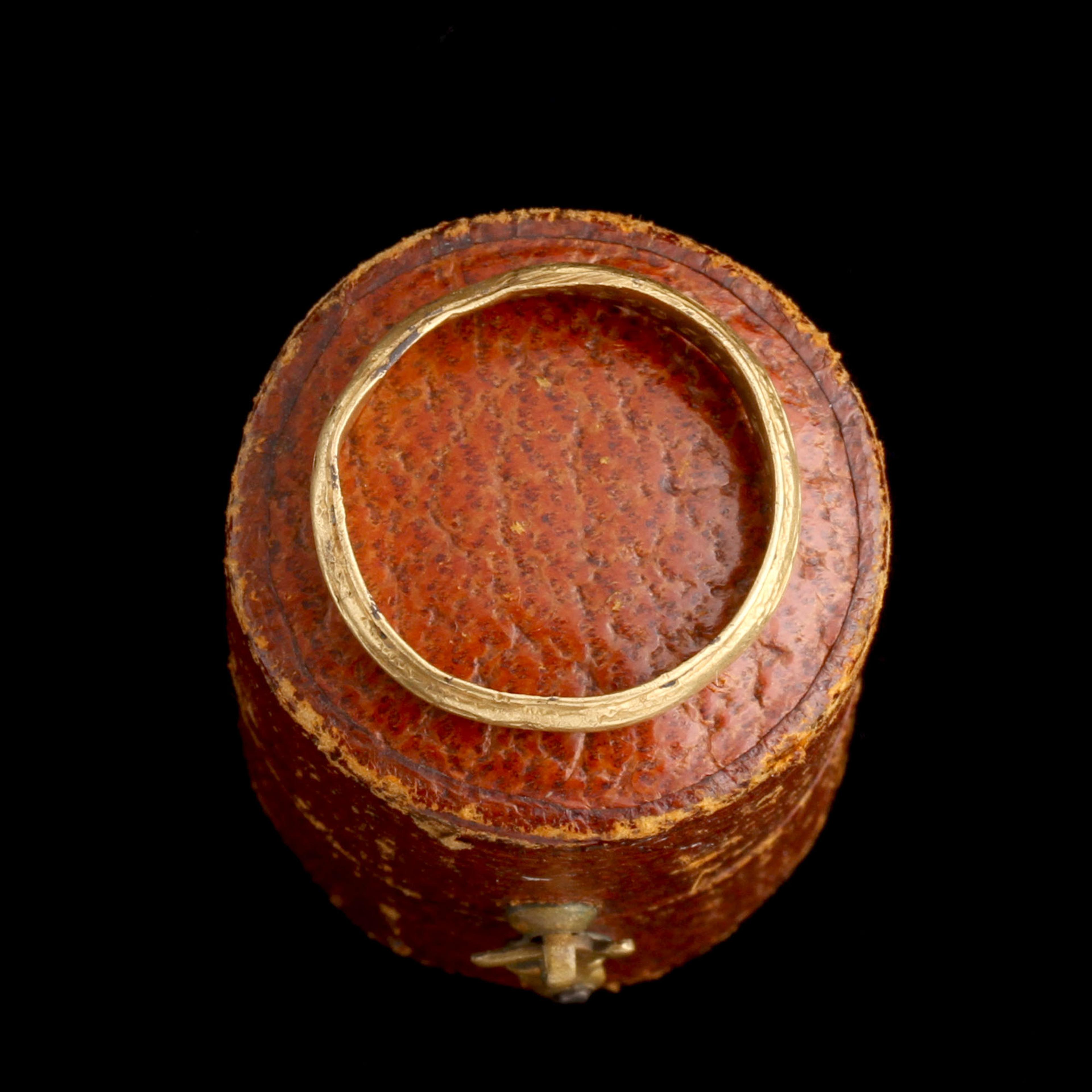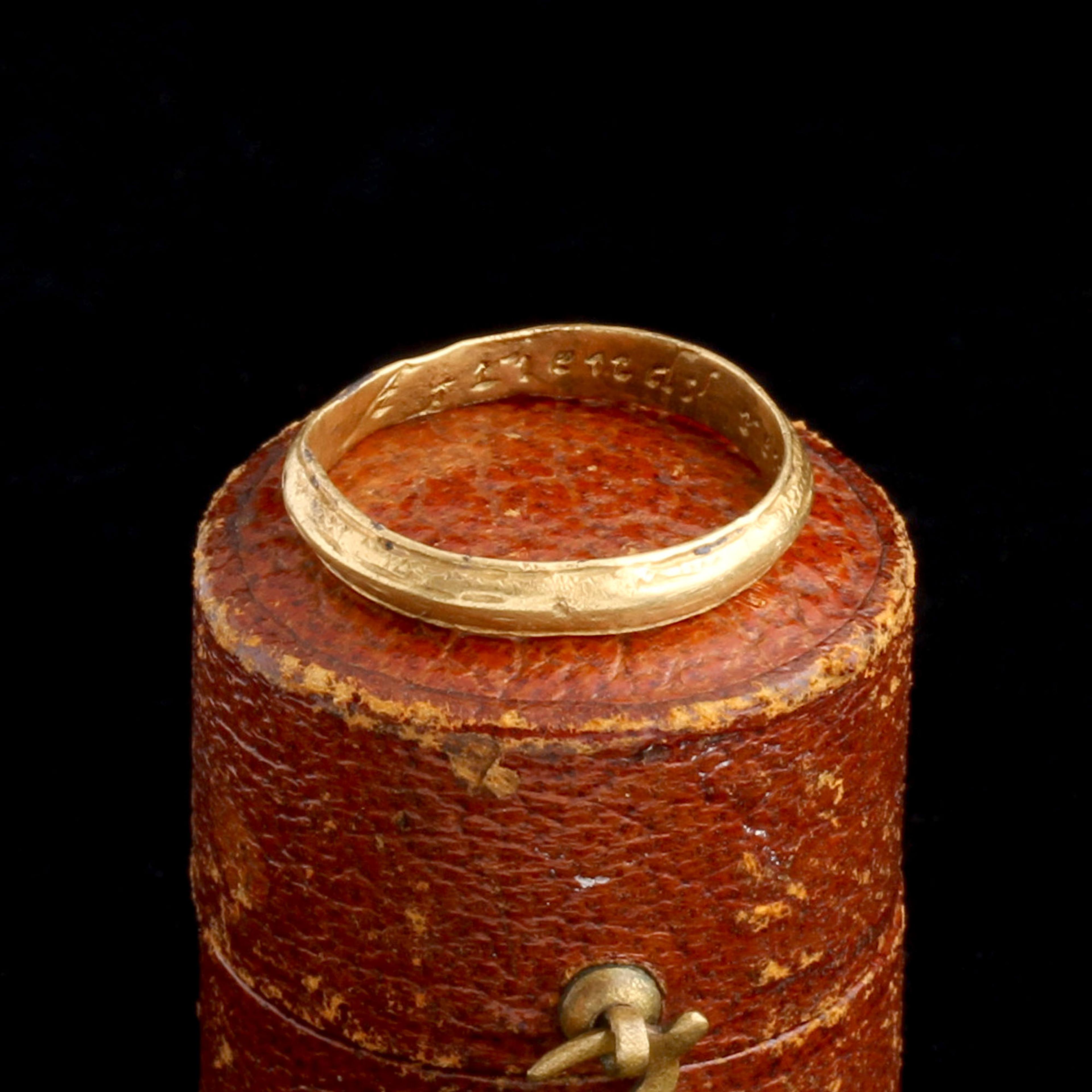 Charles II was restored to the throne in 1660 after years of exile during the English Civil War, ushering in the "Restoration" period. His extravagant court and infamous womanizing earned him the nickname "The Merry Monarch." However, his reign was also marked by major events like the Great Plague and the Great Fire of London. This ring, crafted during his reign, bears the inscription "A friends remembrance" inside and is stamped with a "B" maker's mark to identify the jeweler. Discovered in an English field by a metal detector, it remains unpolished to preserve its intricate surface details.