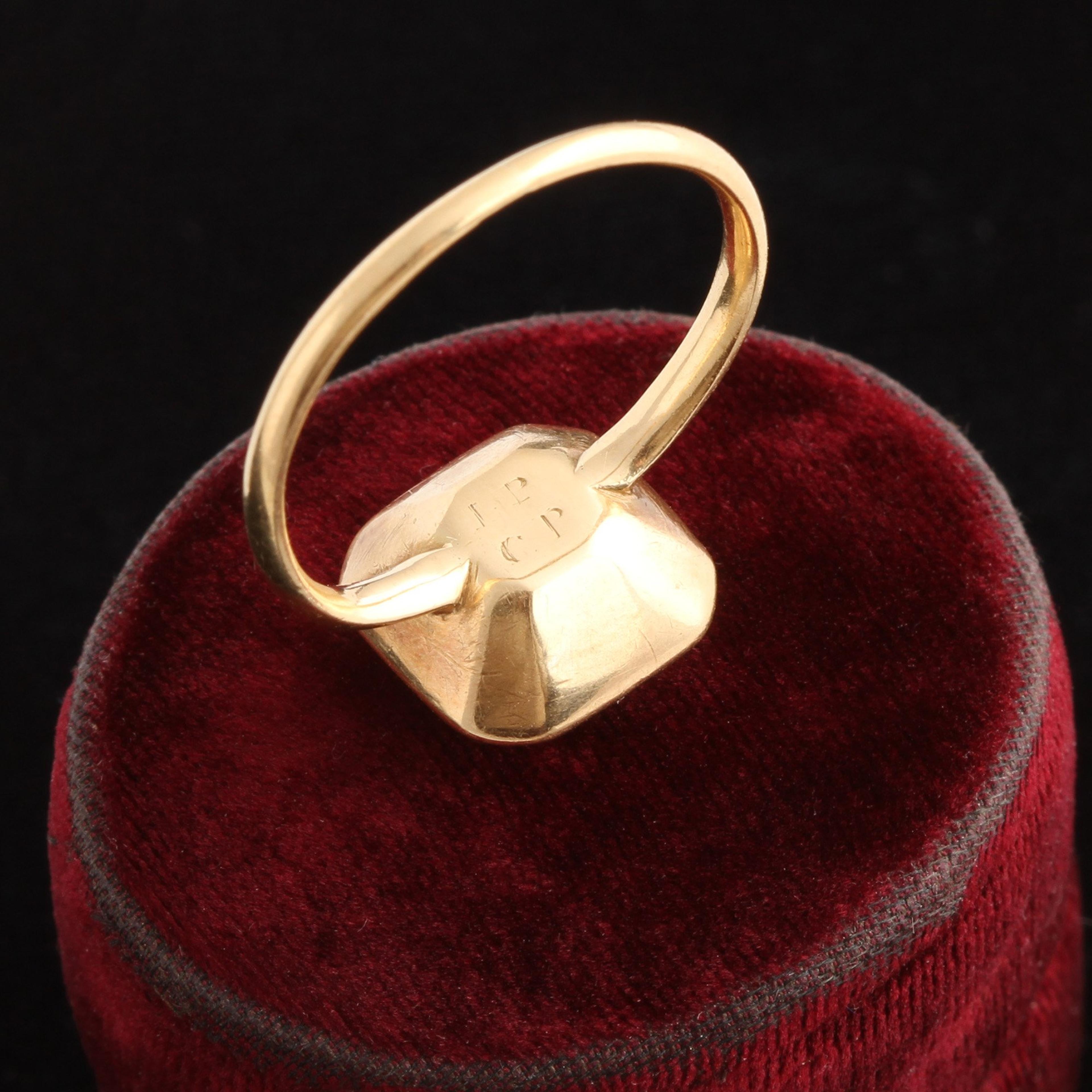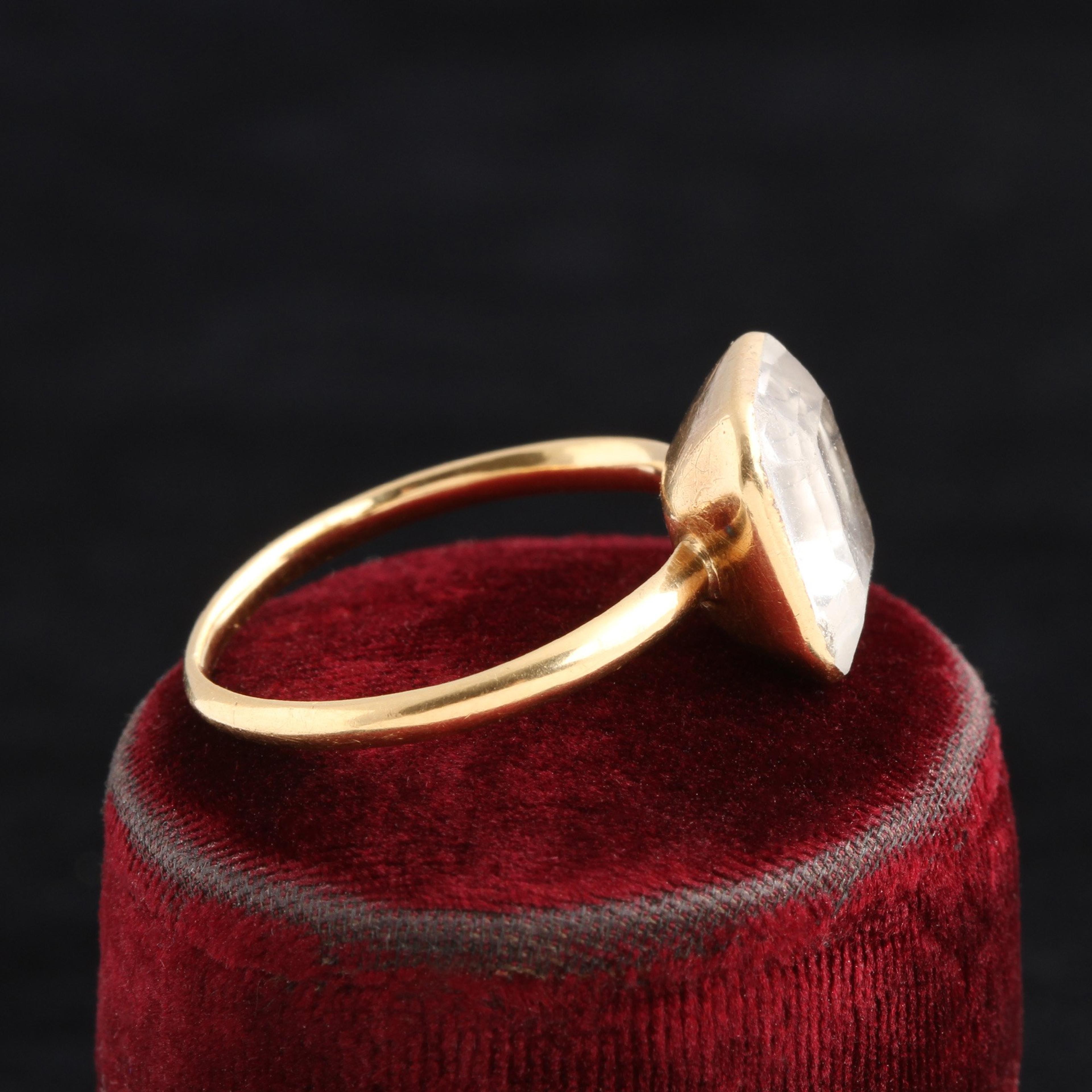 Stuart crystals are faceted rock quartz crystal jewels which originated as a form of mourning (or protest) jewelry after the execution of King Charles I of the House of Stuart in 1649. The first Stuart crystals were pendants or rings and featured the initials of the king or a portrait of him done in miniature under a rock crystal top. Later variations included cufflinks, buttons, earrings, and slides, in addition to the original pendants and rings. Some of these 18th century versions, like this lovely ring, featured a simple hair work background. This piece is extra special because the underside of the head is engraved with two sets of initials: "IP" and "CP".
