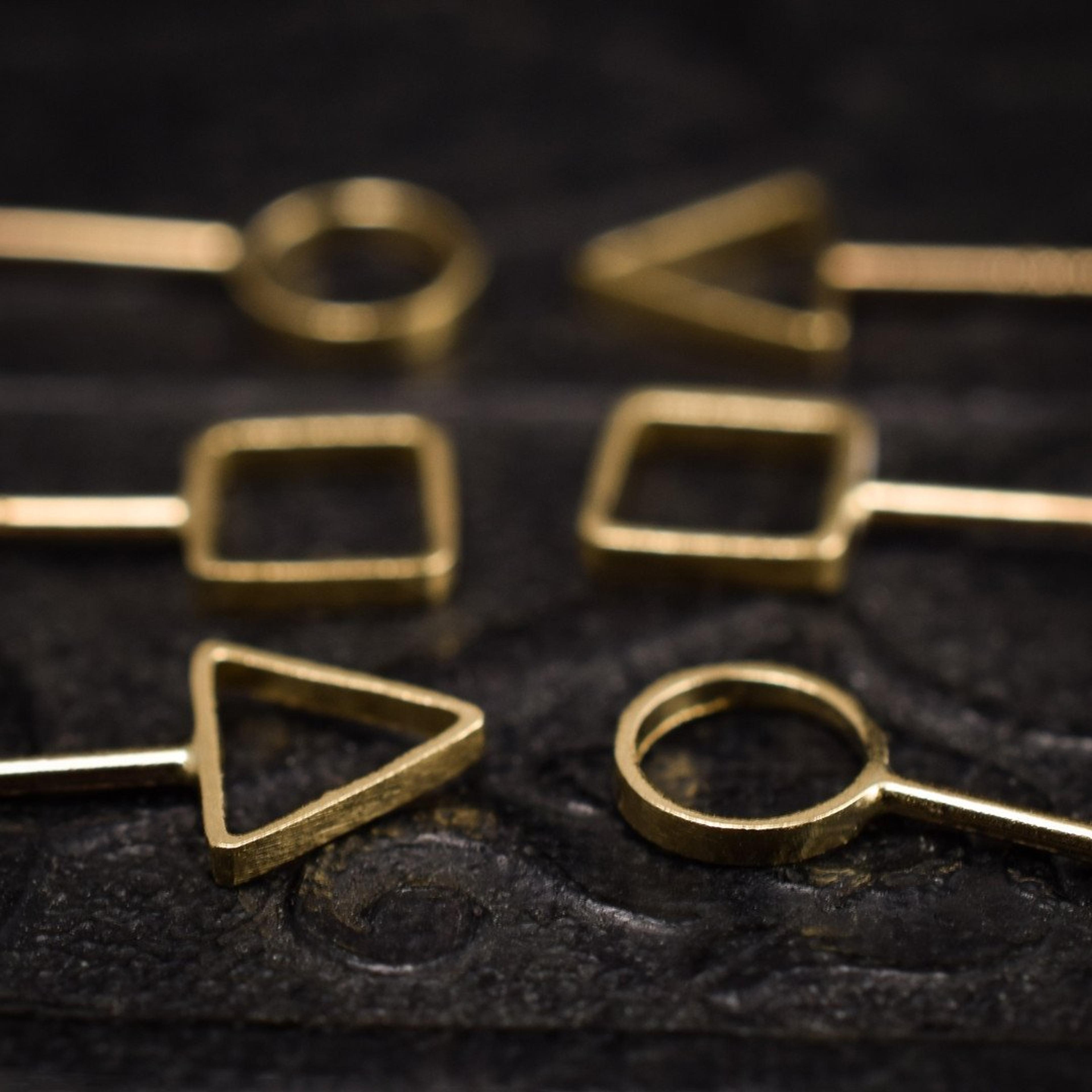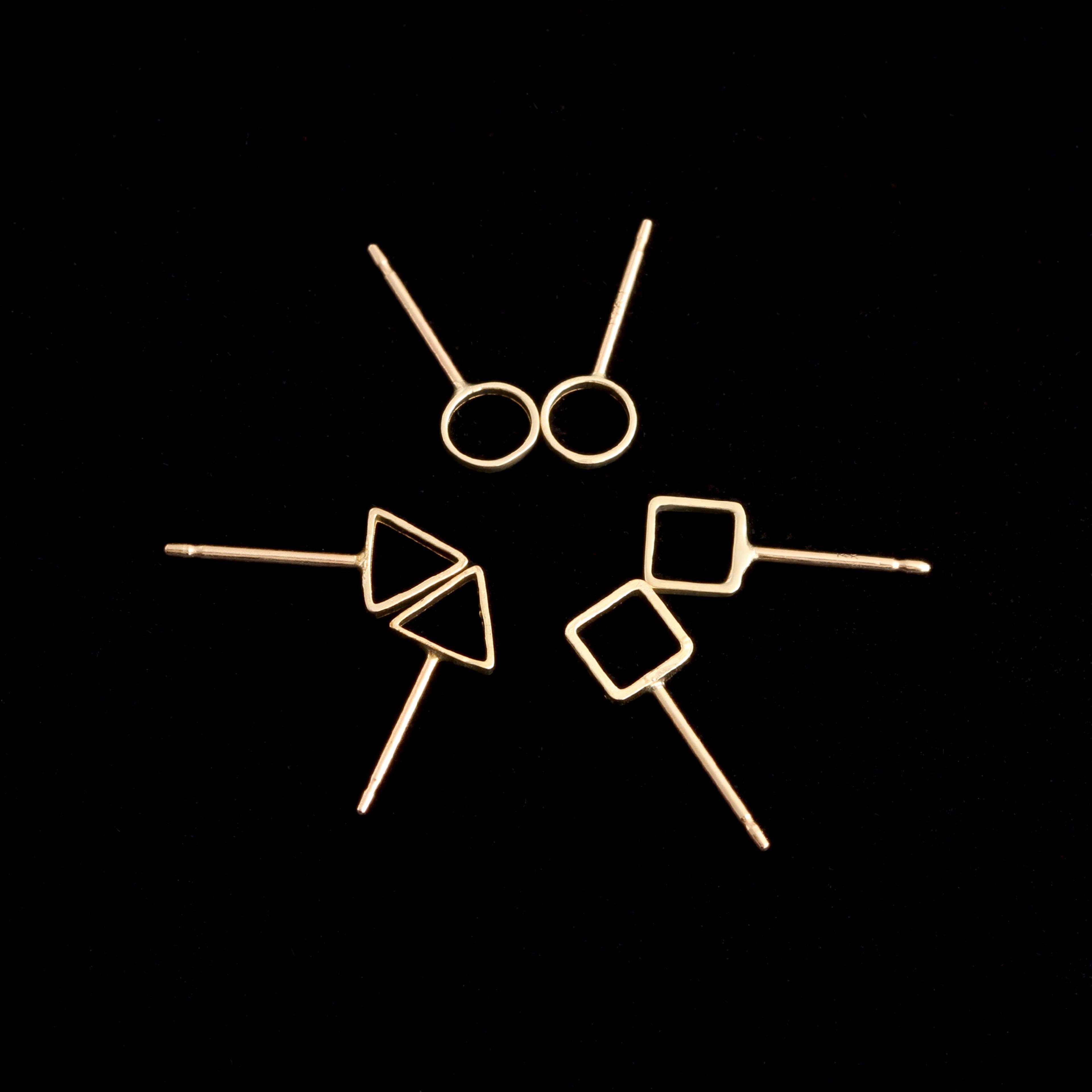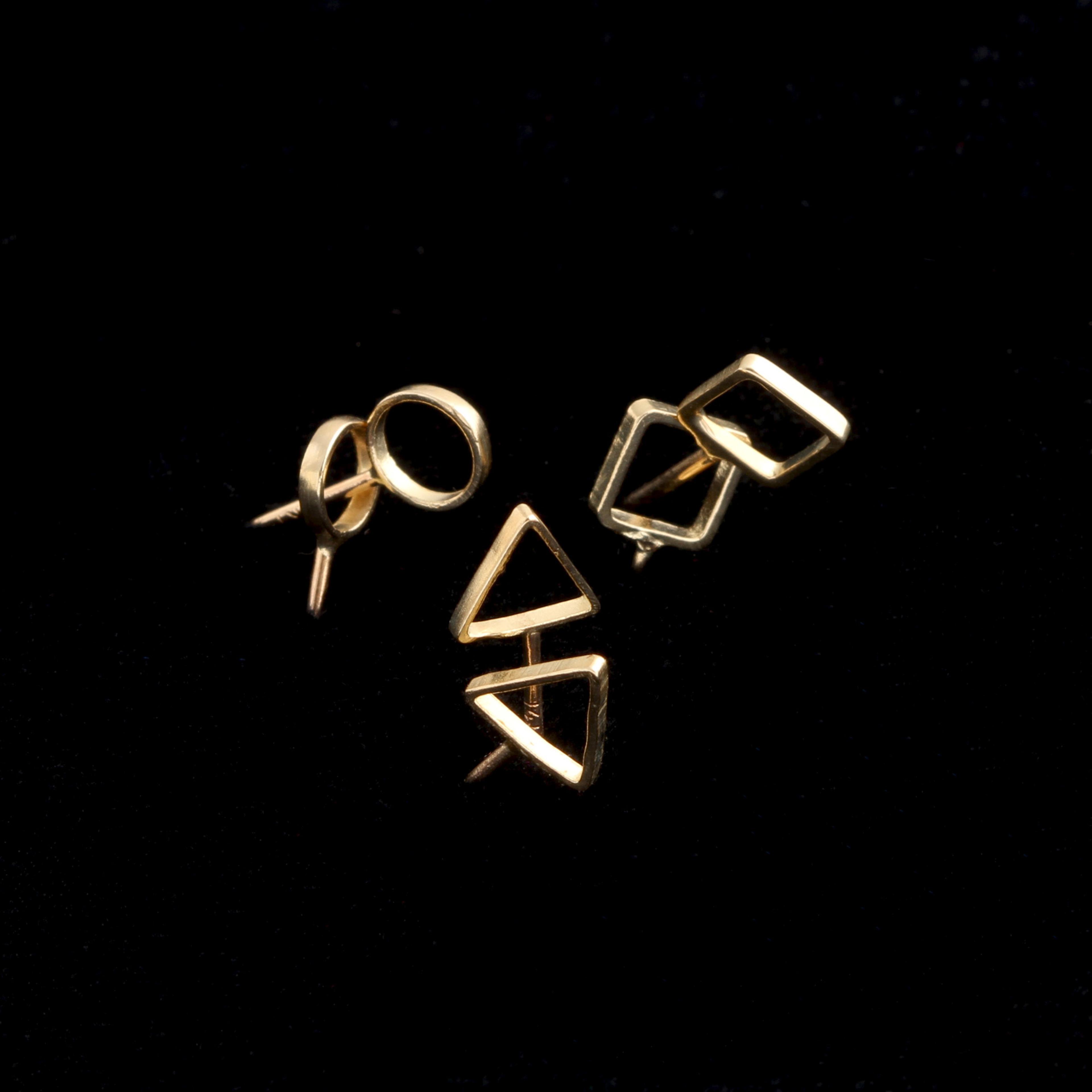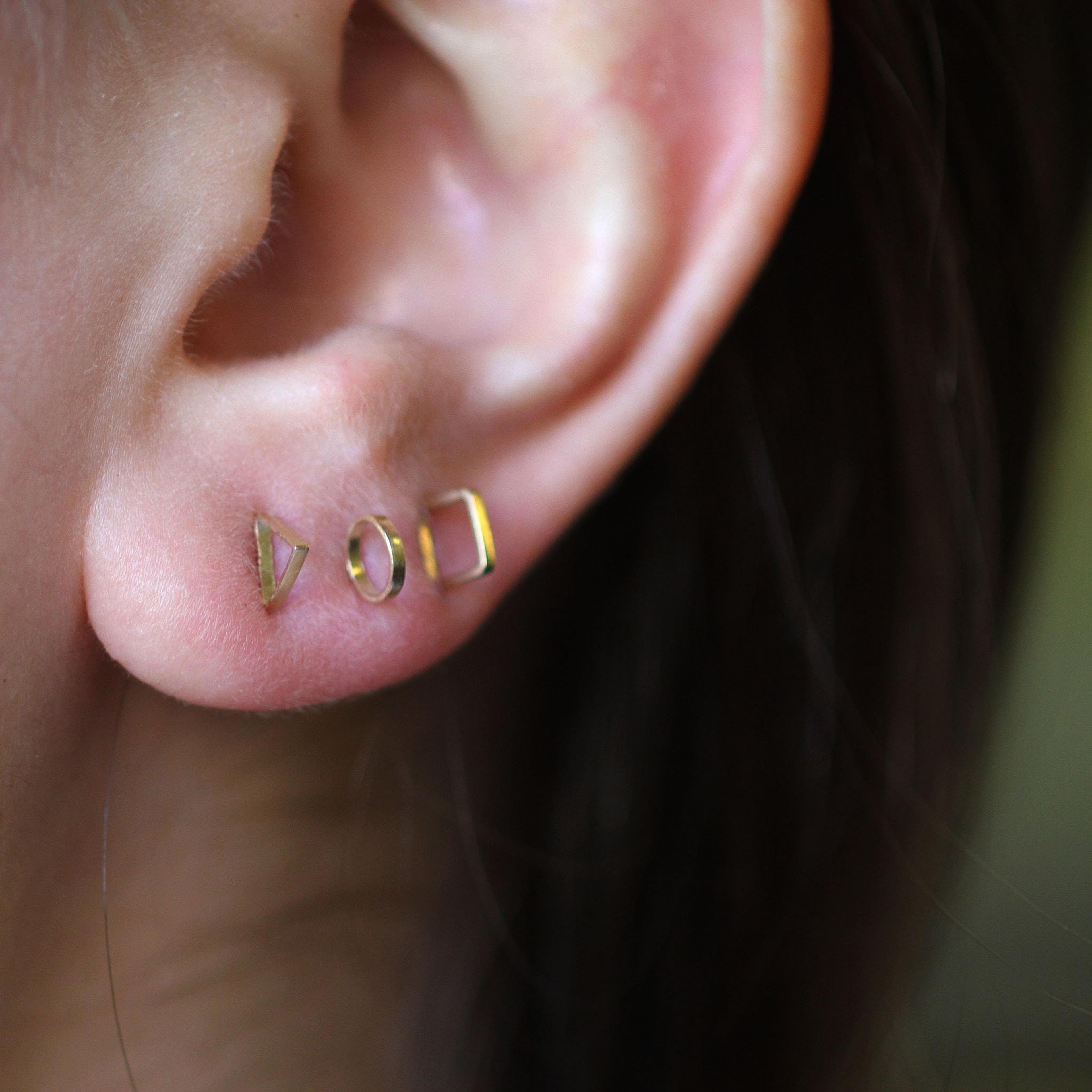 Precise triangles, circles or squares stand out straight from your ear. A perfect addition to your stack of studs, made in warm 14k gold. Sold in a pair with rubber backs.