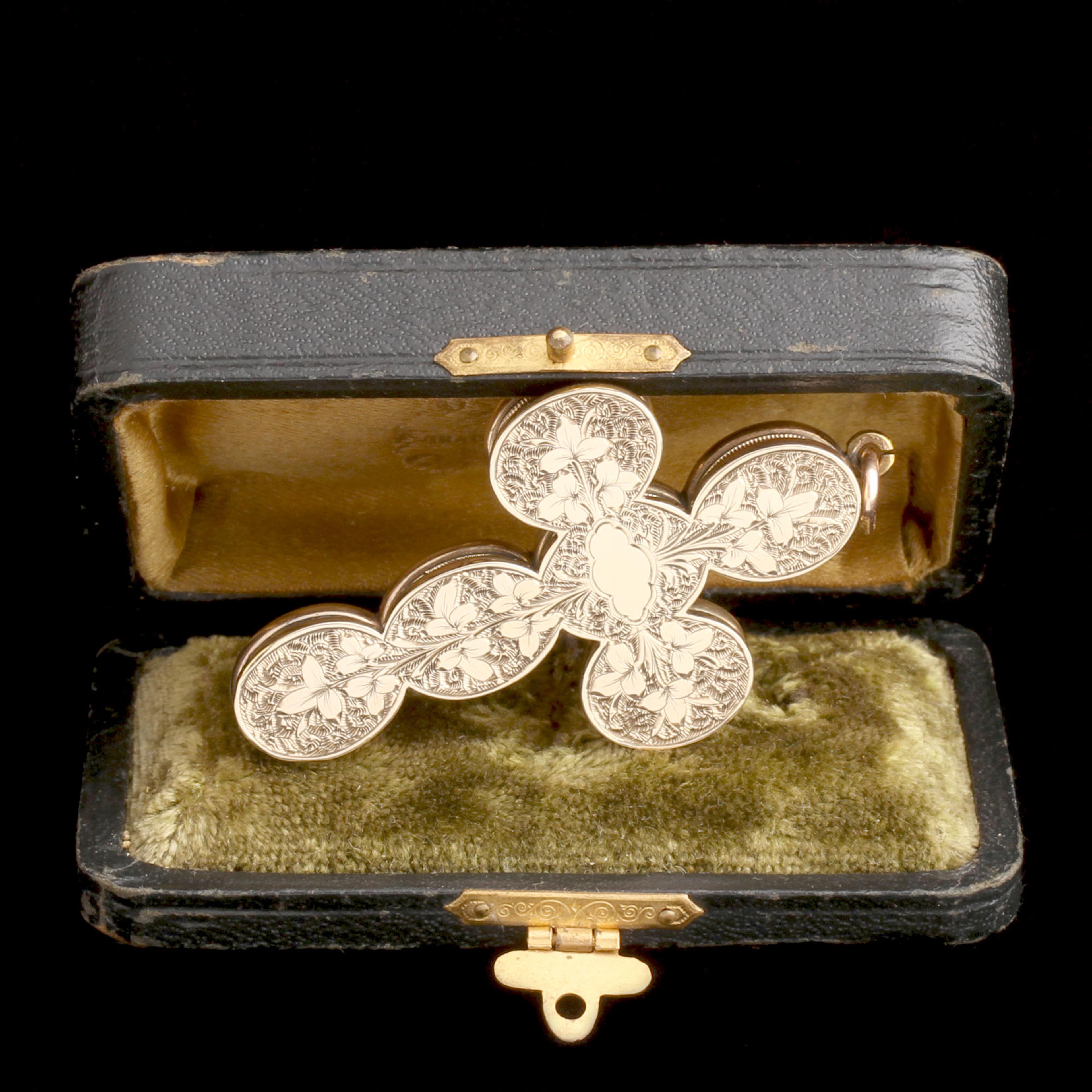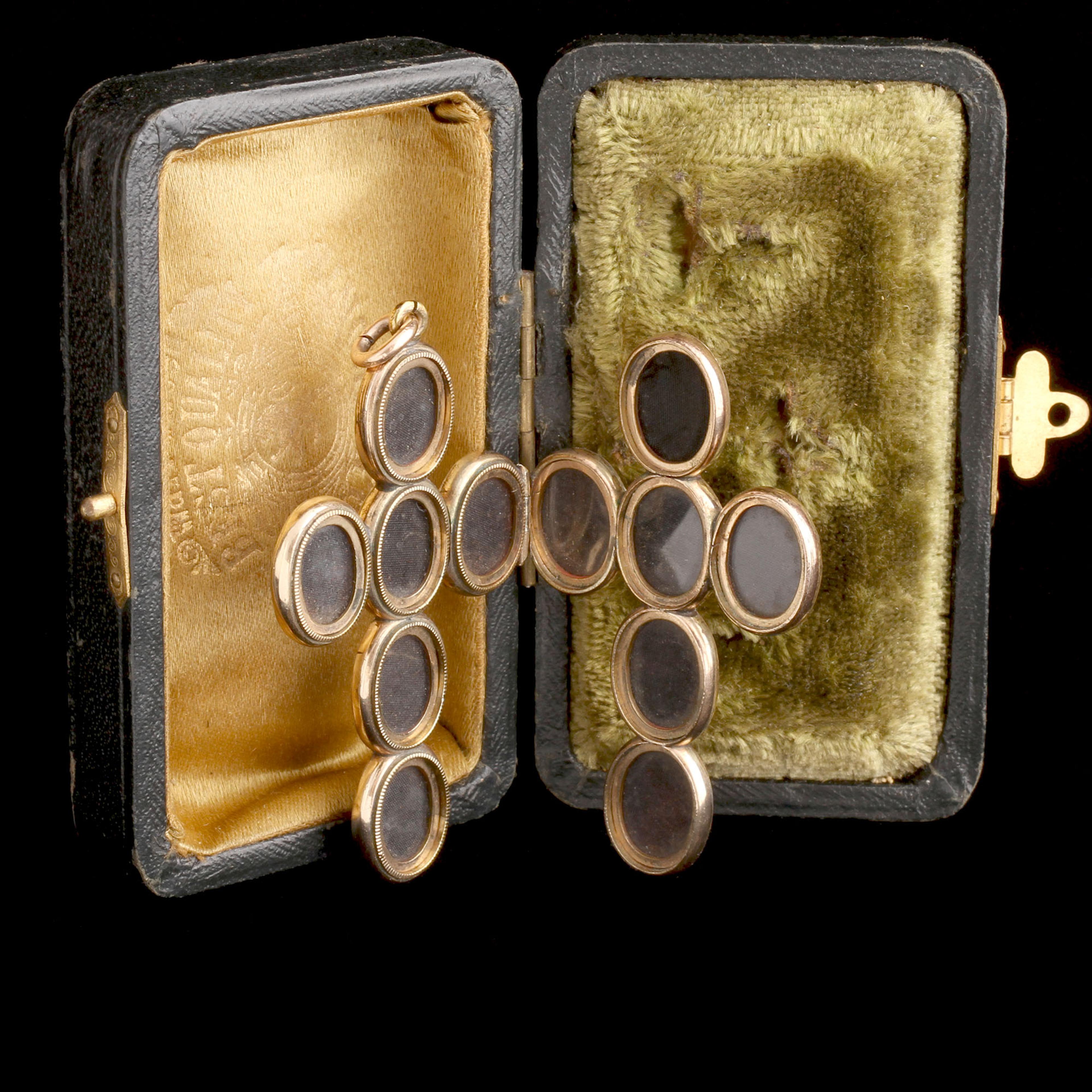 THIS UNUSUALLY large Victorian cross locket conceals twelve compartments behind oval glass panels - each one once meant to hold a portrait, lock of hair, or relic. The engraved front is a dense tangle of symbolic flora, abstract and stylized, depicting what I believe are ferns, lily of the valley, and ivy. Each of these plants held layered meaning in Victorian floriography and in Christian art. Ivy represented fidelity. Lily of the valley, associated with the Virgin Mary, stood for humility, purity, and the return of happiness after sorrow. Ferns symbolized sincerity and secret bonds, a fitting motif for a locket designed to hold hidden mementos. The cross form connects this intimate memorial piece with Christian notions of resurrection and everlasting life.