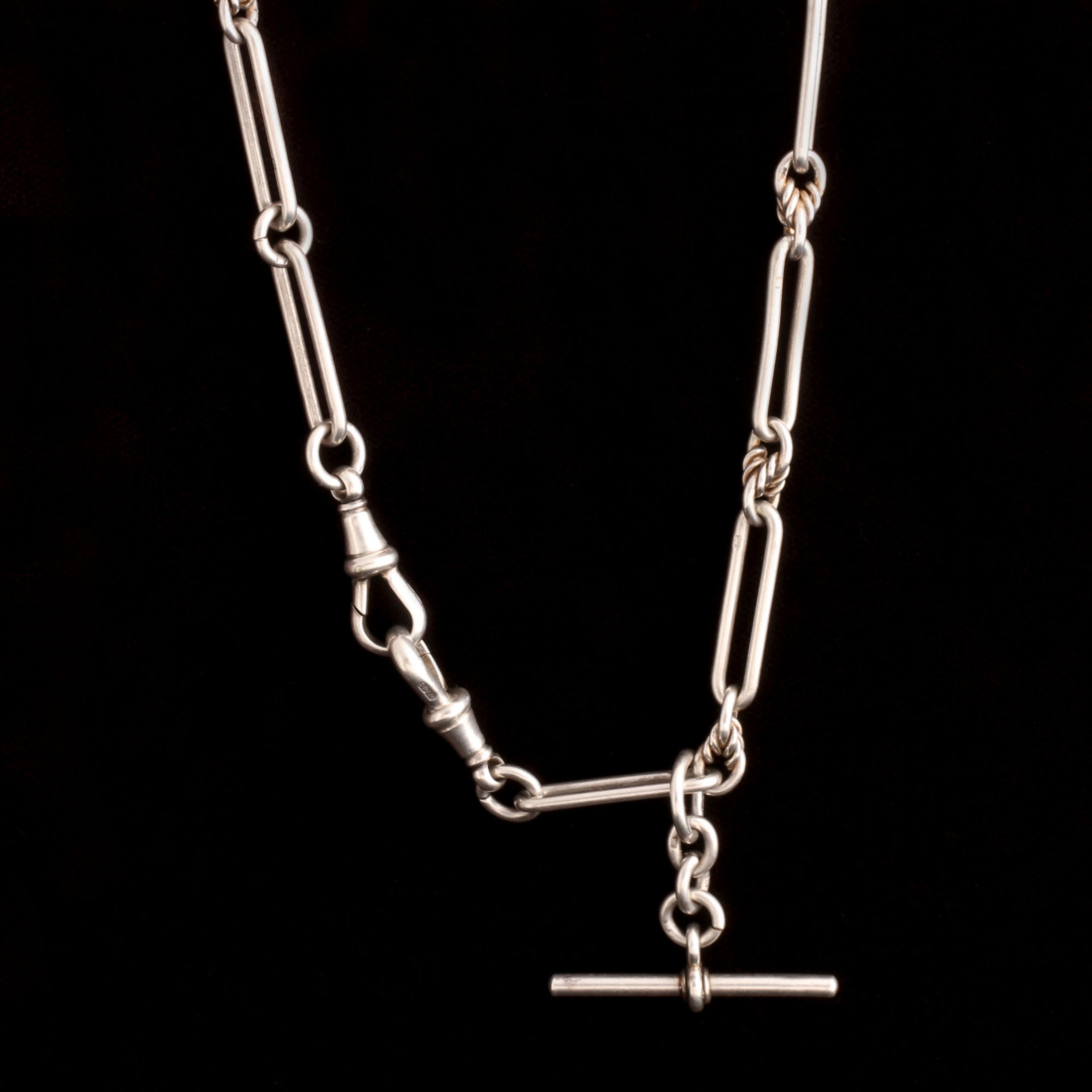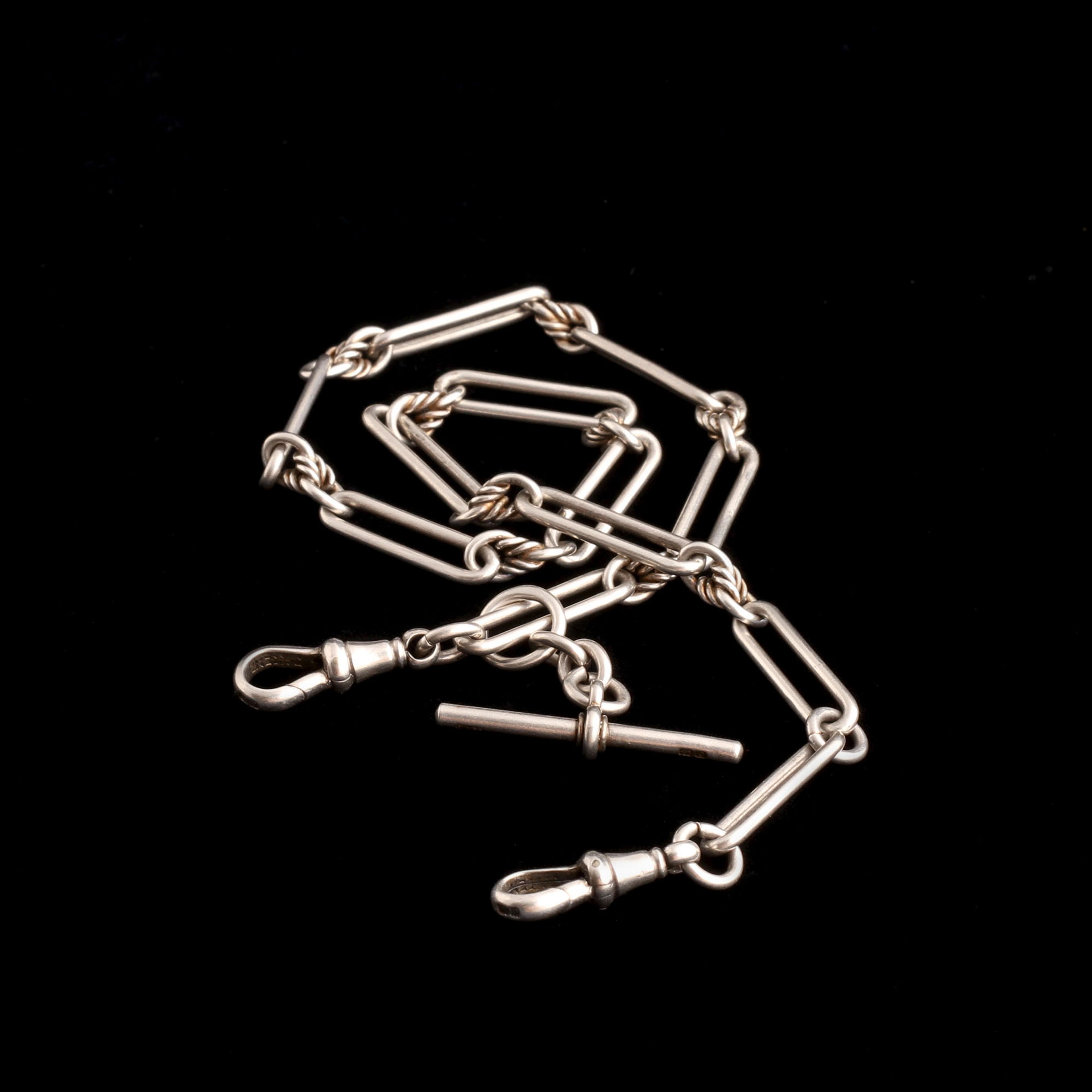 A late Victorian trombone link fob chain modeled in sterling silver and measuring a very wearable 15 3/4".