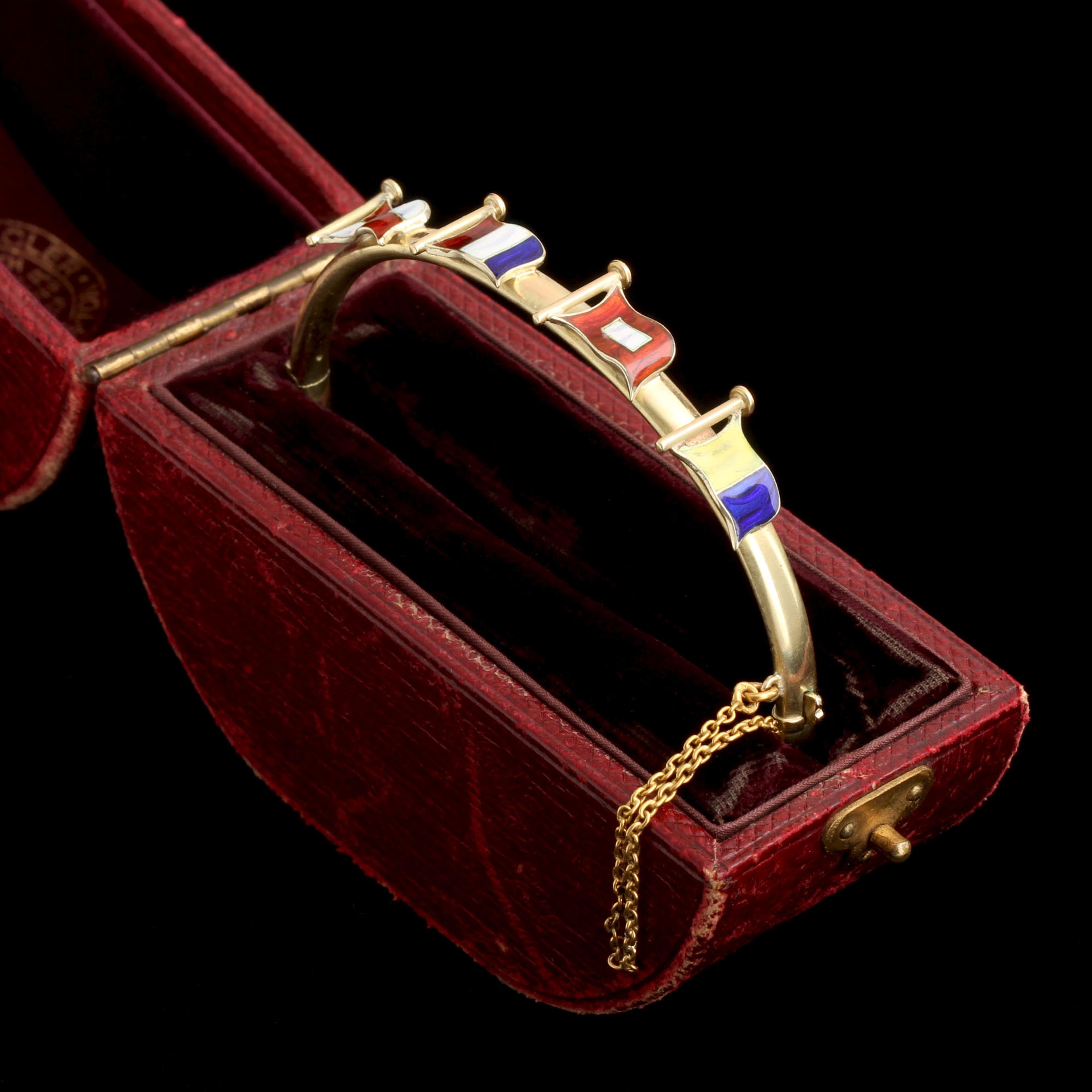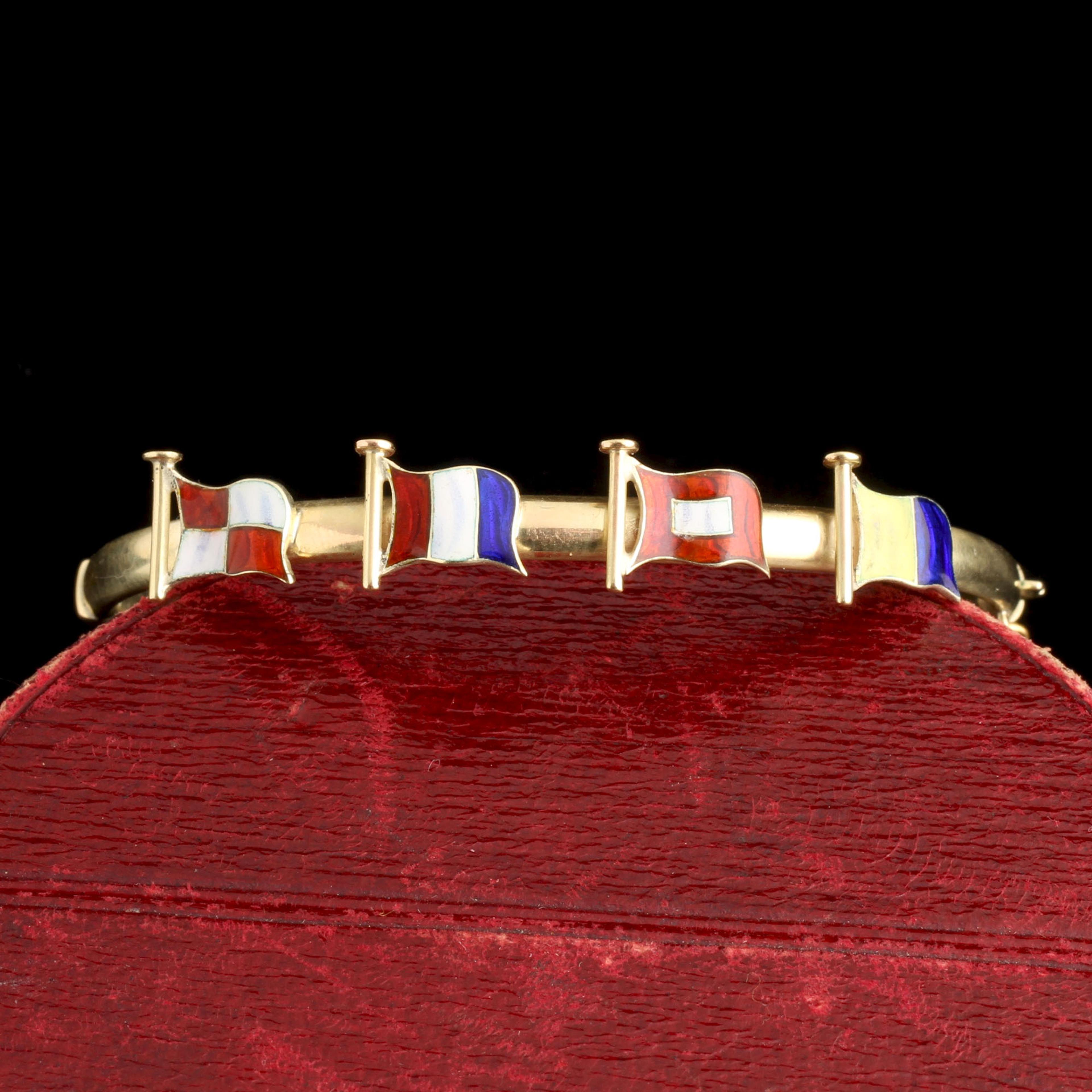 Nautical signal flags are part of an international visual language developed so ships could communicate across long distances. Before radio was invented, ships needed a way to "speak" to each other. By the 19th century, these flags were standardized, and using them in jewelry encodes a private message in plain sight for those who could read it. From one maritime traveler to another, these four colorful flags represent the numbers 1,8,9, and 6: a year significant for reasons known only to the owner and giver.