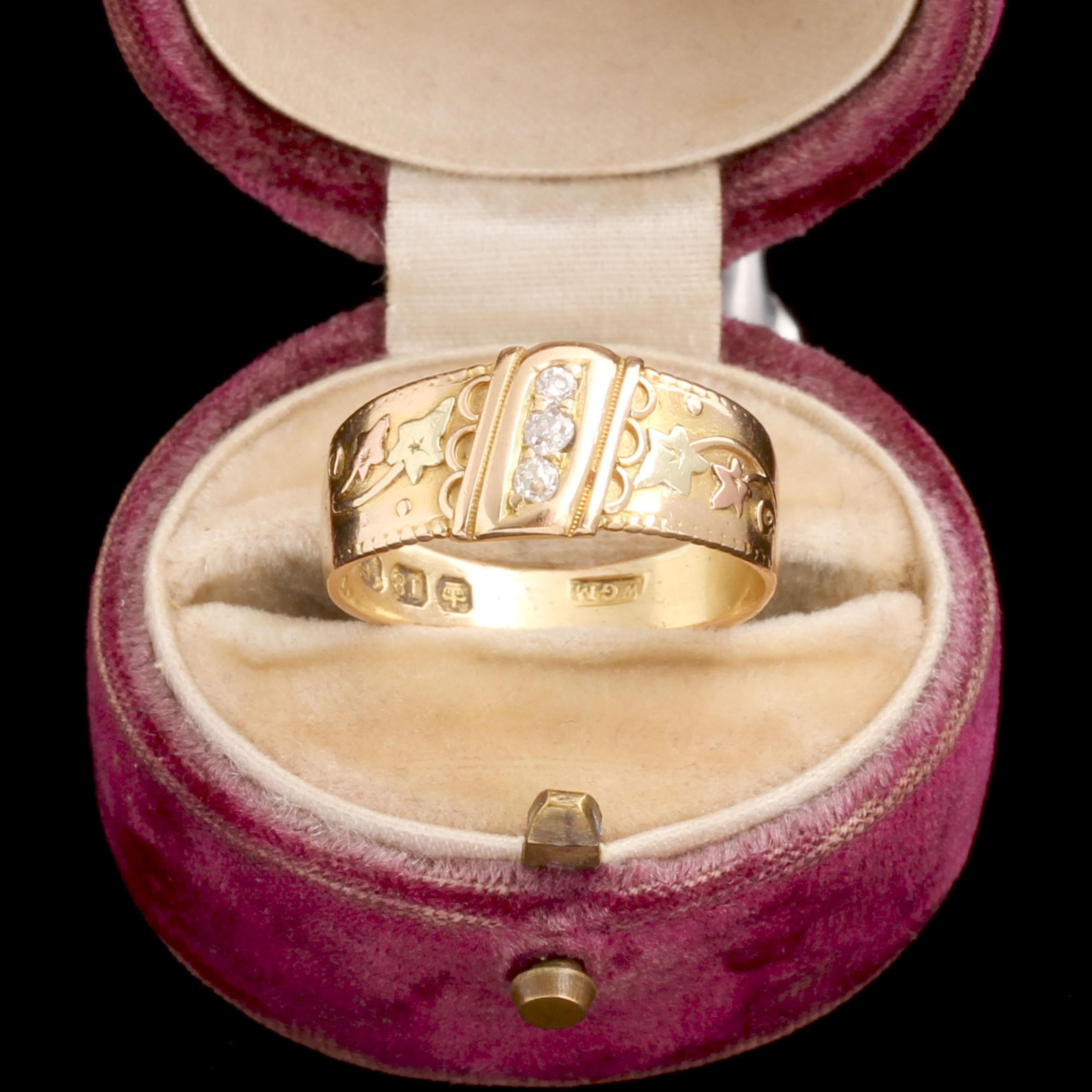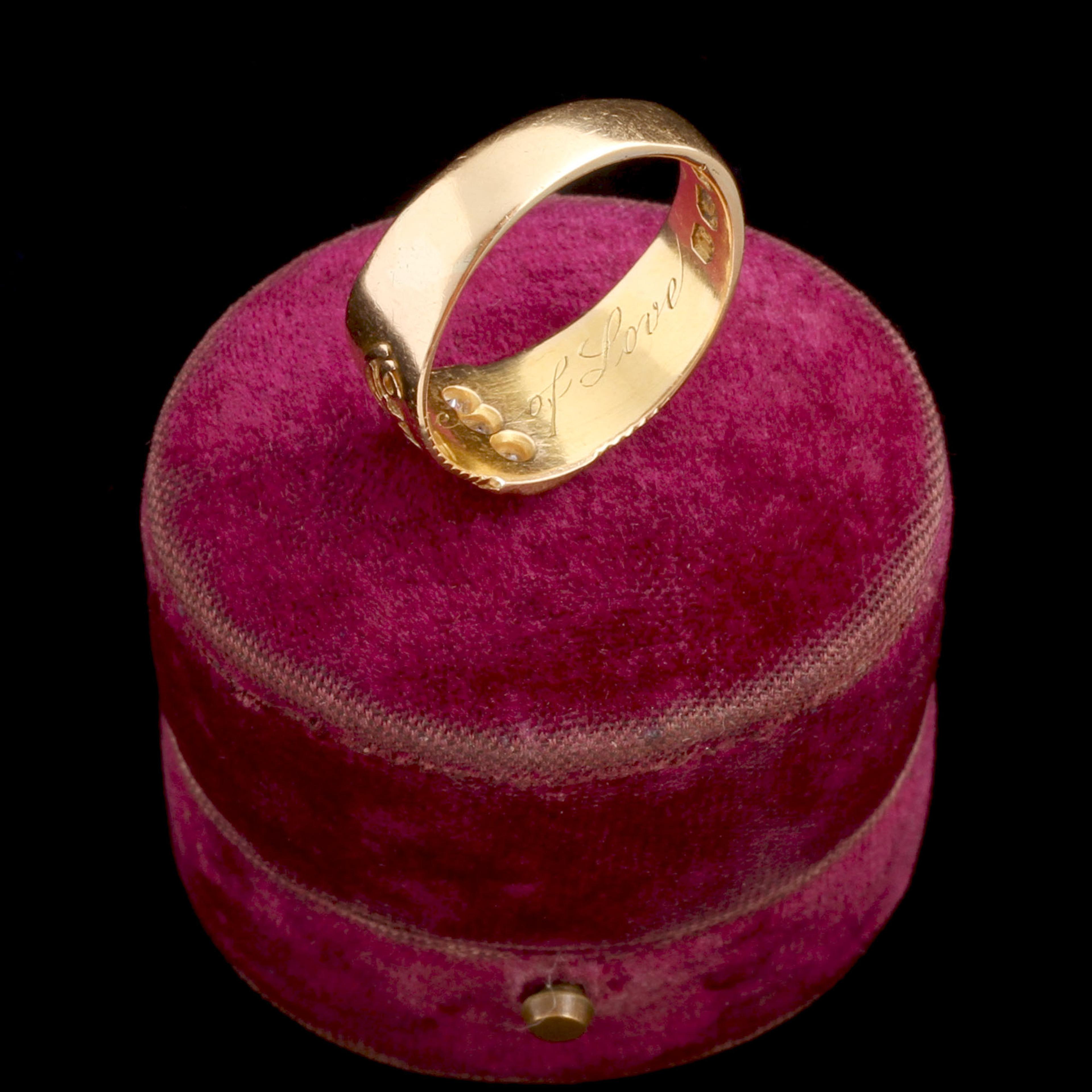 In 1891, an oath was made, secretly. "A pledge of love" was engraved inside this ring so that the wearer alone could feel the passion and promise of the words against their finger. It's a continuation of the tradition of posey rings, where an inscribed vow was believed to be amplified by skin contact. On the outside, ivy leaves drive home an affectionate message: in the language of Victorian floriography, these were known to mean "I cling to thee".