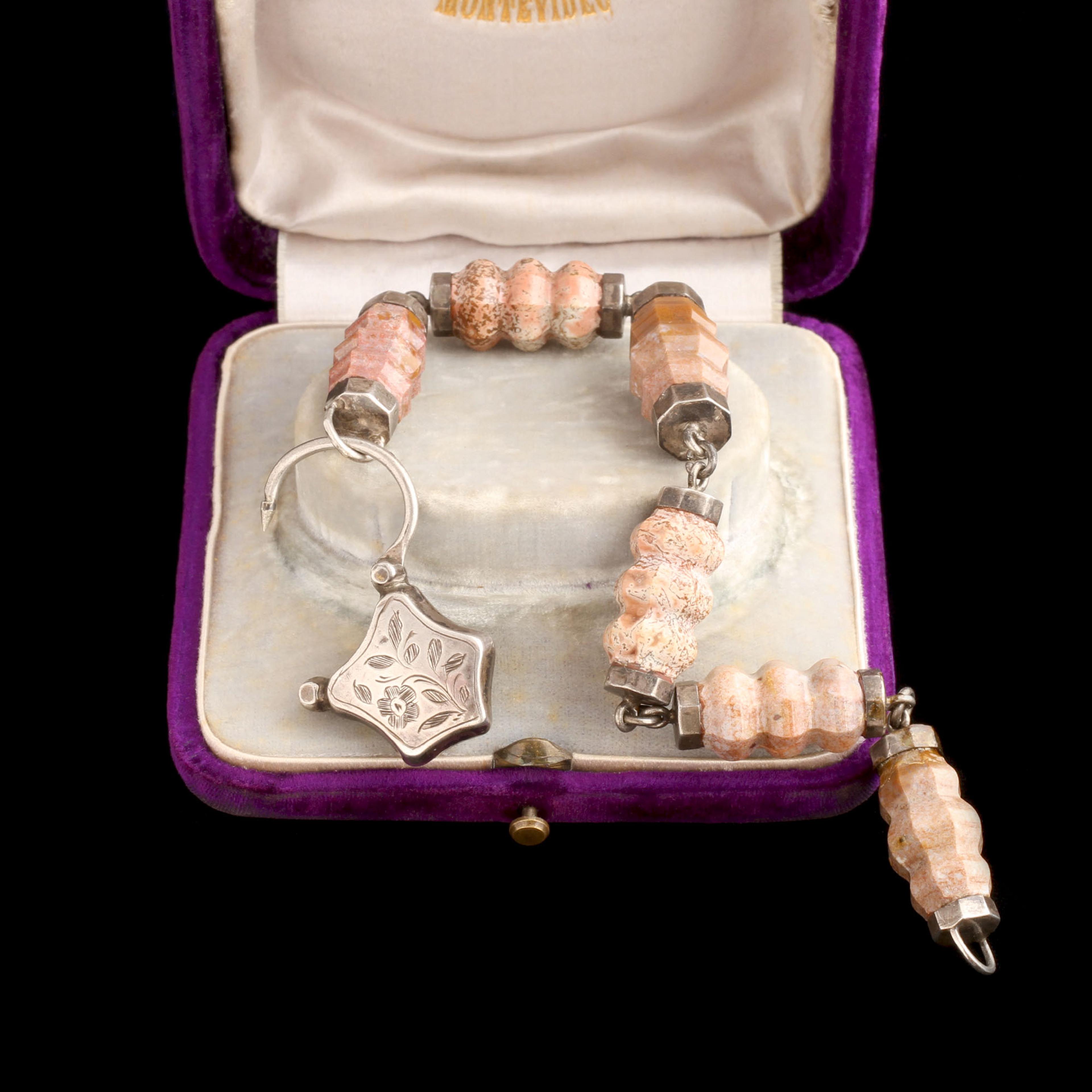 Queen Victoria and Prince Albert purchased Balmoral Castle in Scotland in 1852. The royal family spent a great deal of time at their Scottish estate and took to wearing the Royal Stuart plaid to special events. To accent her new northern attire, Victoria began collecting Scottish jewelry. Most often seen in silver, Victorian-era Scottish jewelry typically combines Celtic and natural motifs - like the famous highland thistle - with stones native to the region: granite, malachite, agate, and cairngorm. This c. 1880 sterling silver bracelet is a piece of the Scottish jewelry made so fashionable by the trendsetting, tartan-clad queen. The The bracelet features pink Aberdeen granite links with a padlock locket clasp.