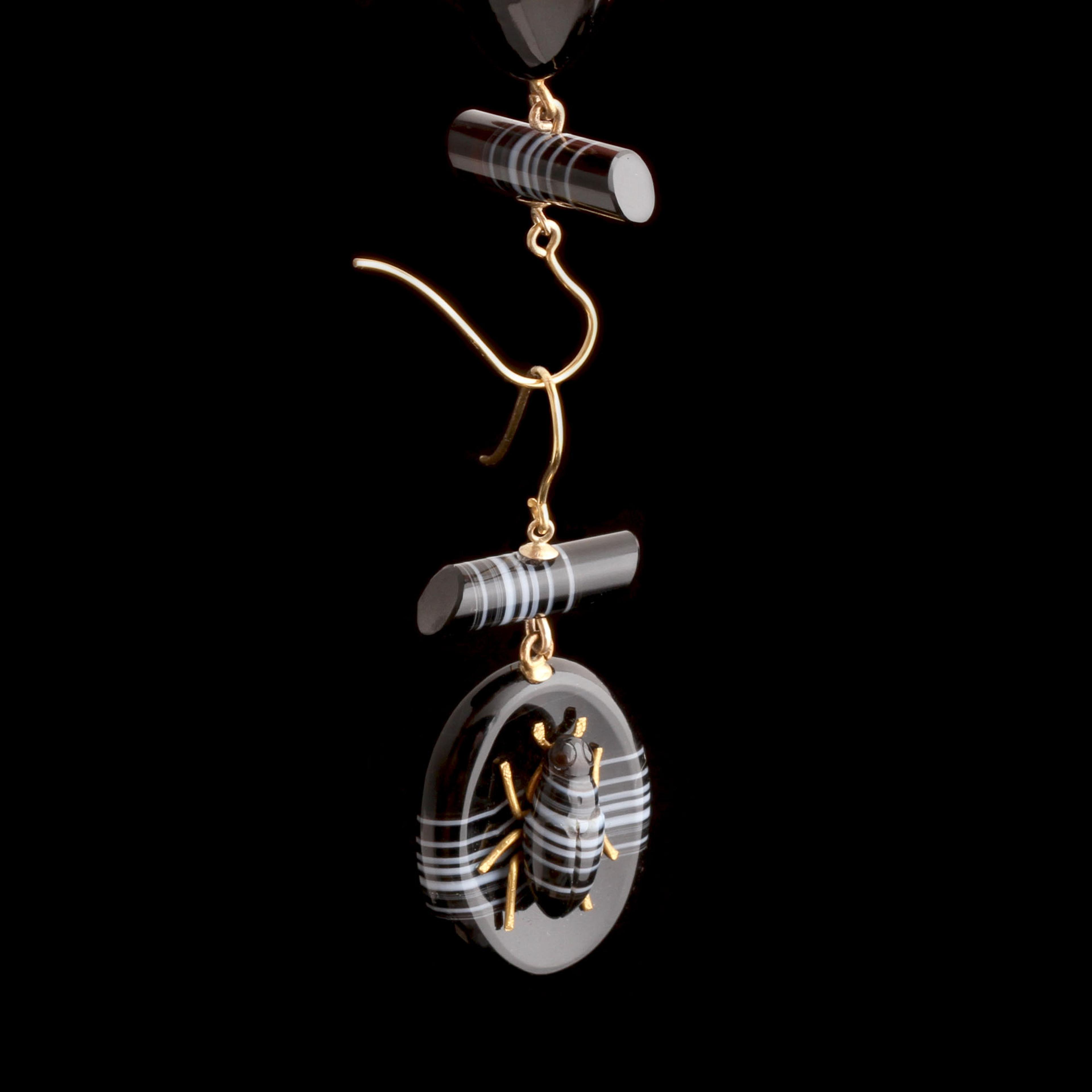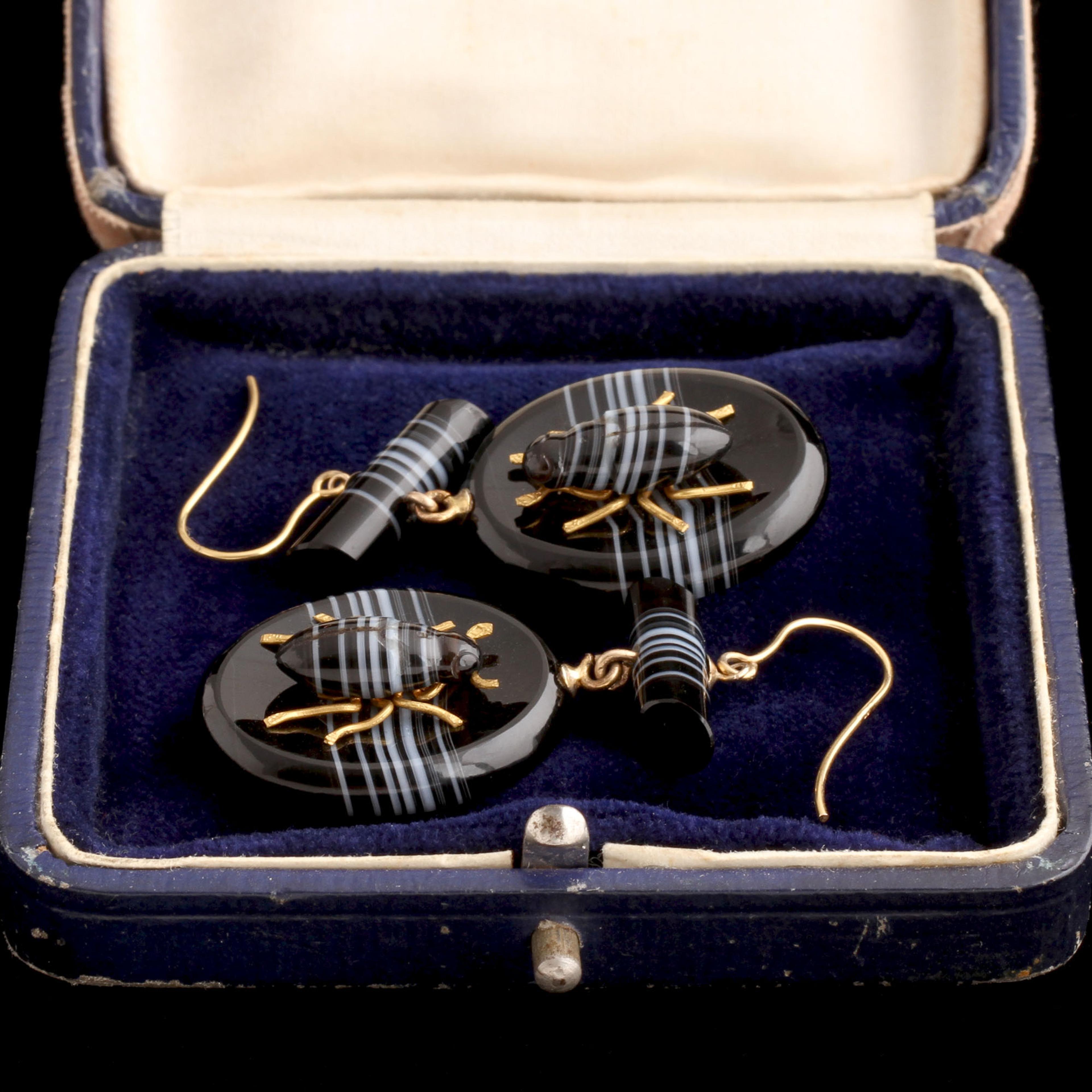 Crafted in striped agate and gold, these Victorian earrings are affixed with carved flies whose striped bodies match the stones they're perched upon.