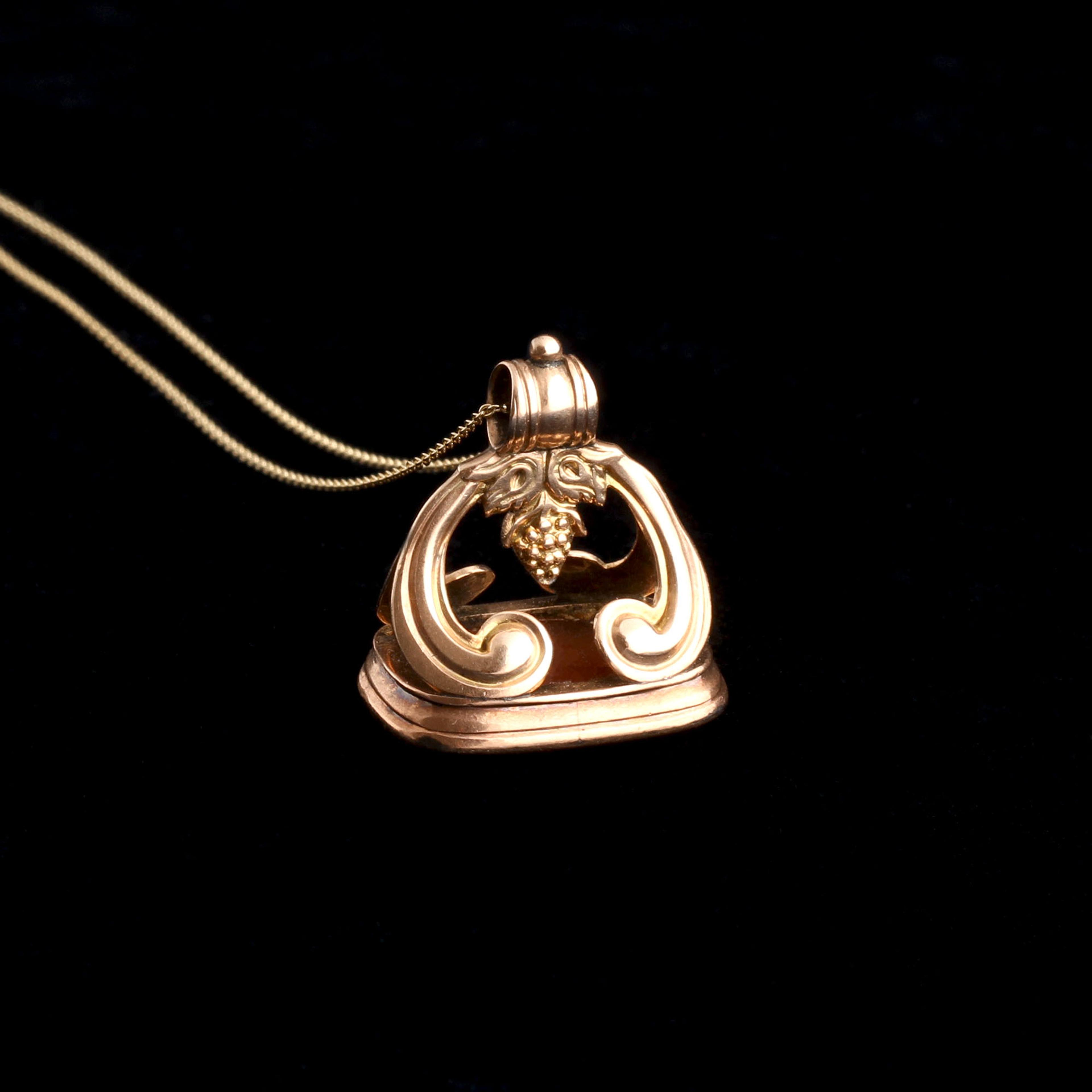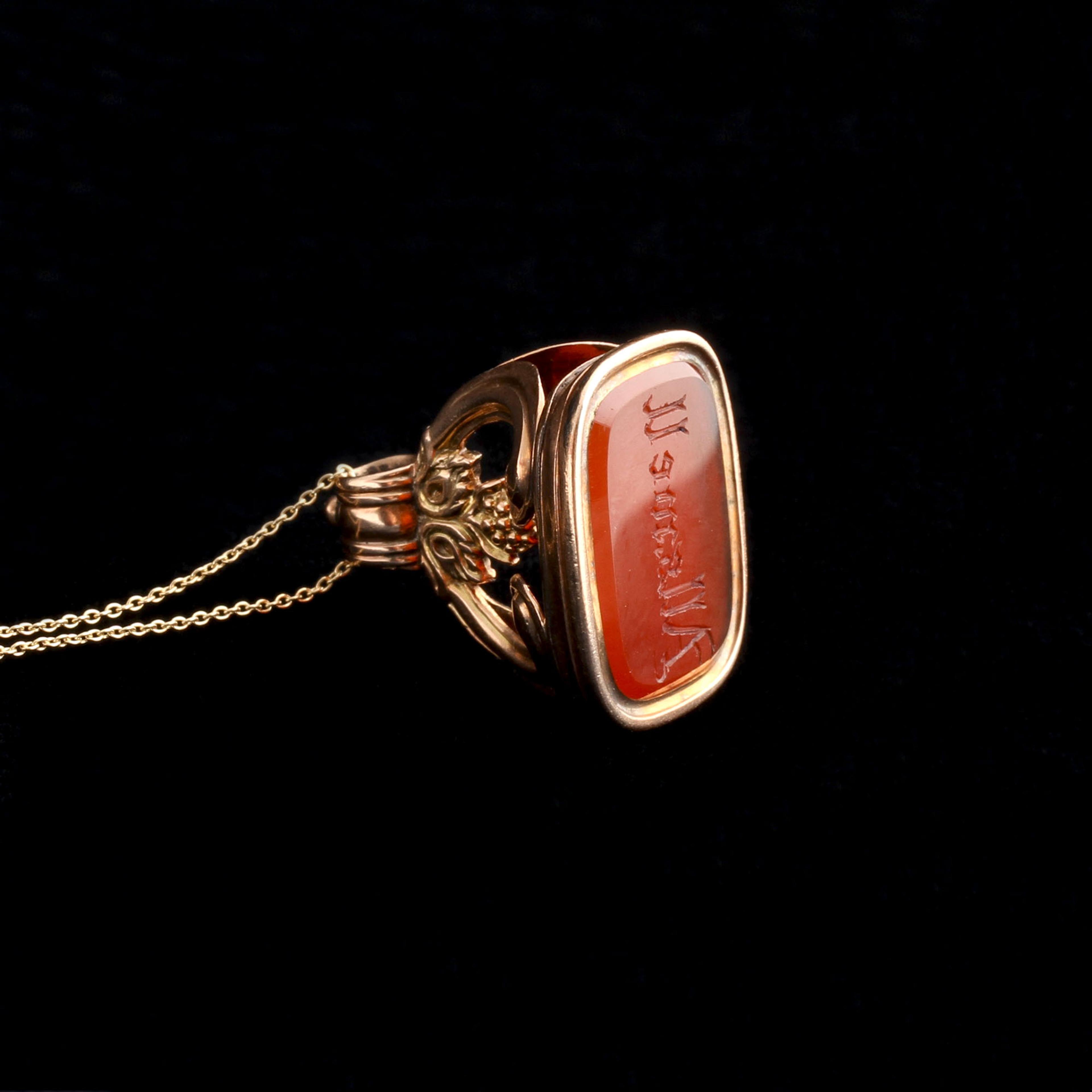 If you’re feeling like you’ve been through an ordeal but you’re still standing, the phrase “all’s well that ends well” might resonate. This early Victorian wax seal features an elegant gold mounting with a bunch of grapes suspended from the midpoint. The base holds a carnelian slab etched with the words “Alls well.”