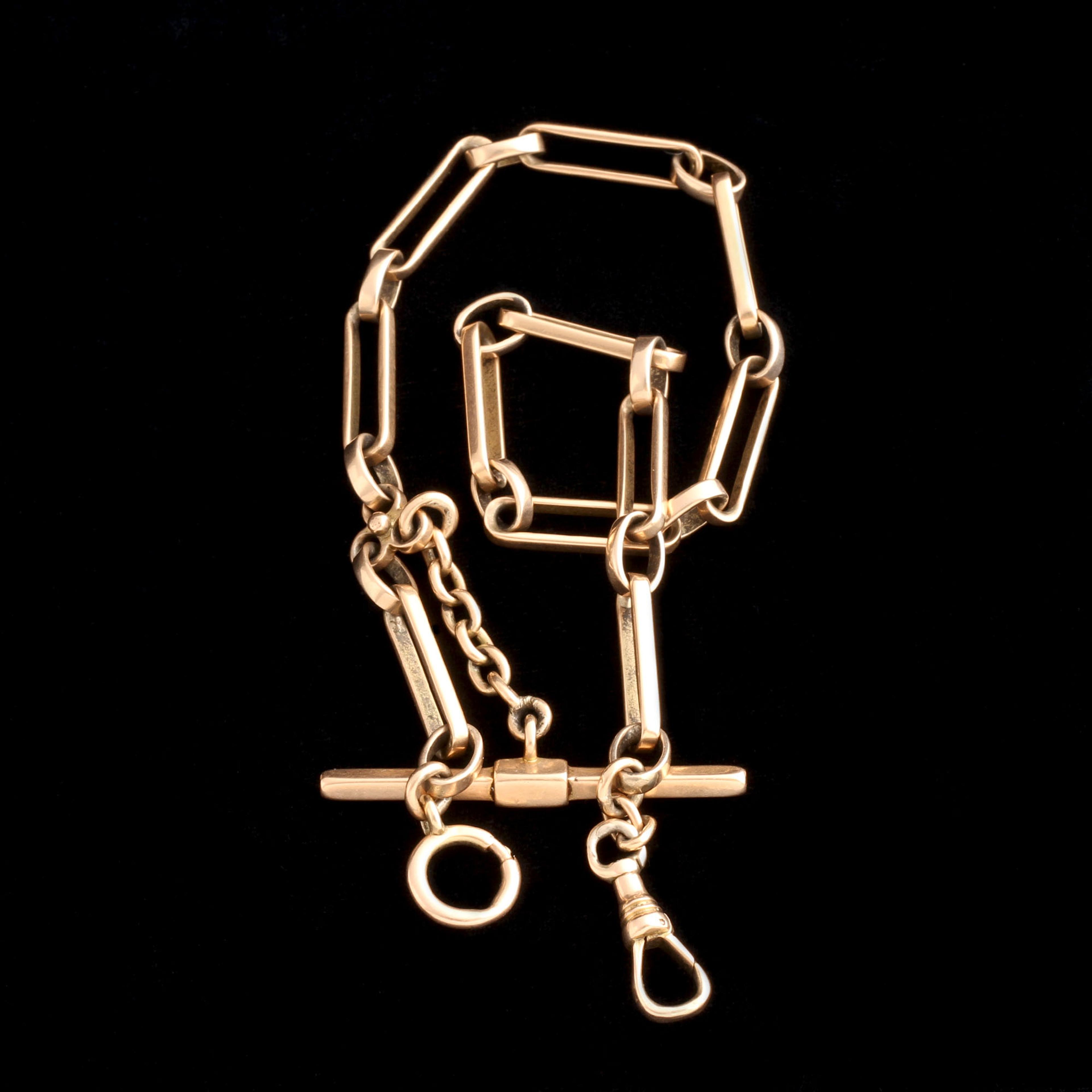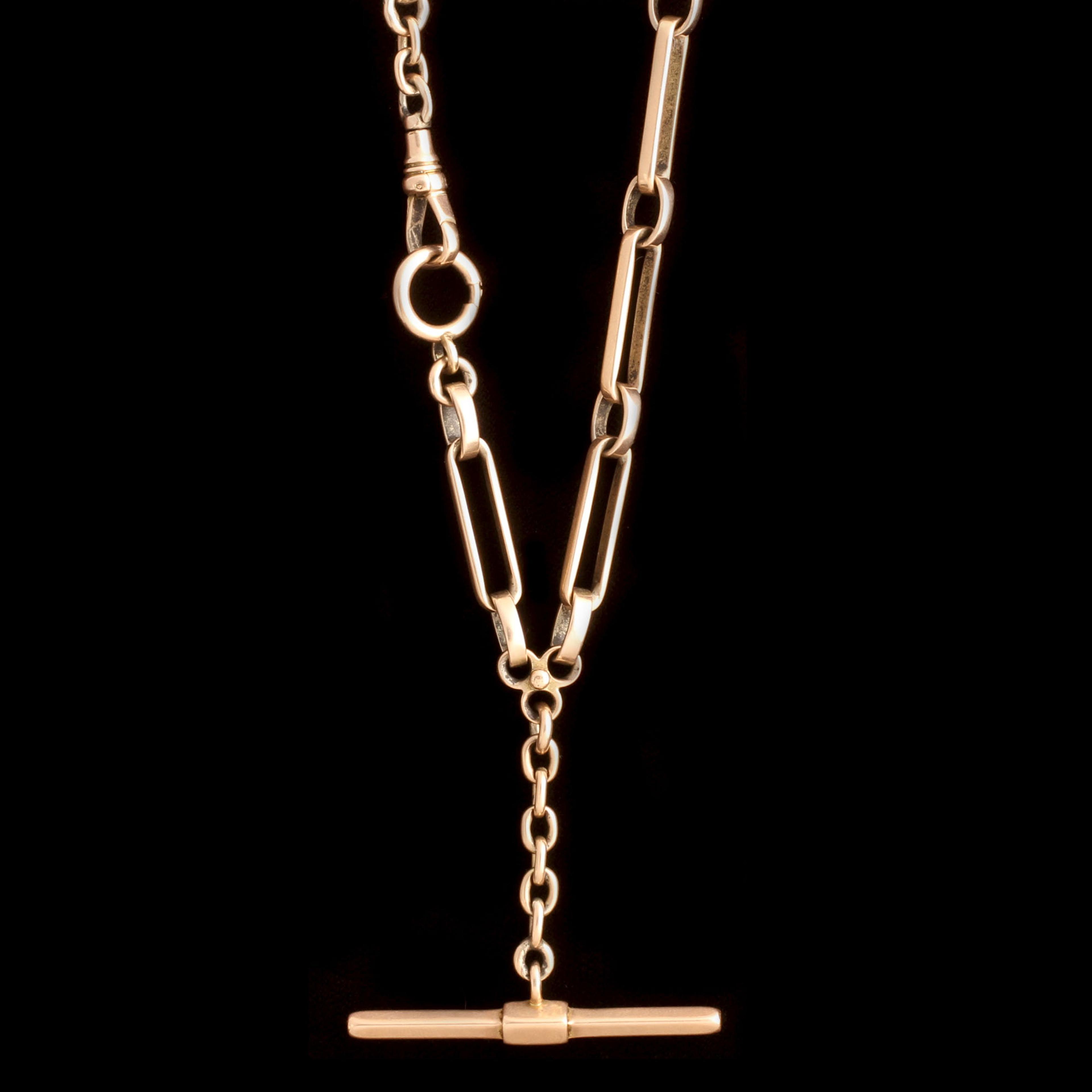 This heavyweight 10k gold watch chain is 14 3/8", long enough to be the shortest necklace in your stack. The dog clip, clasp and T-bar give you endless opportunities to style with charms and extenders. Made around 1890.
