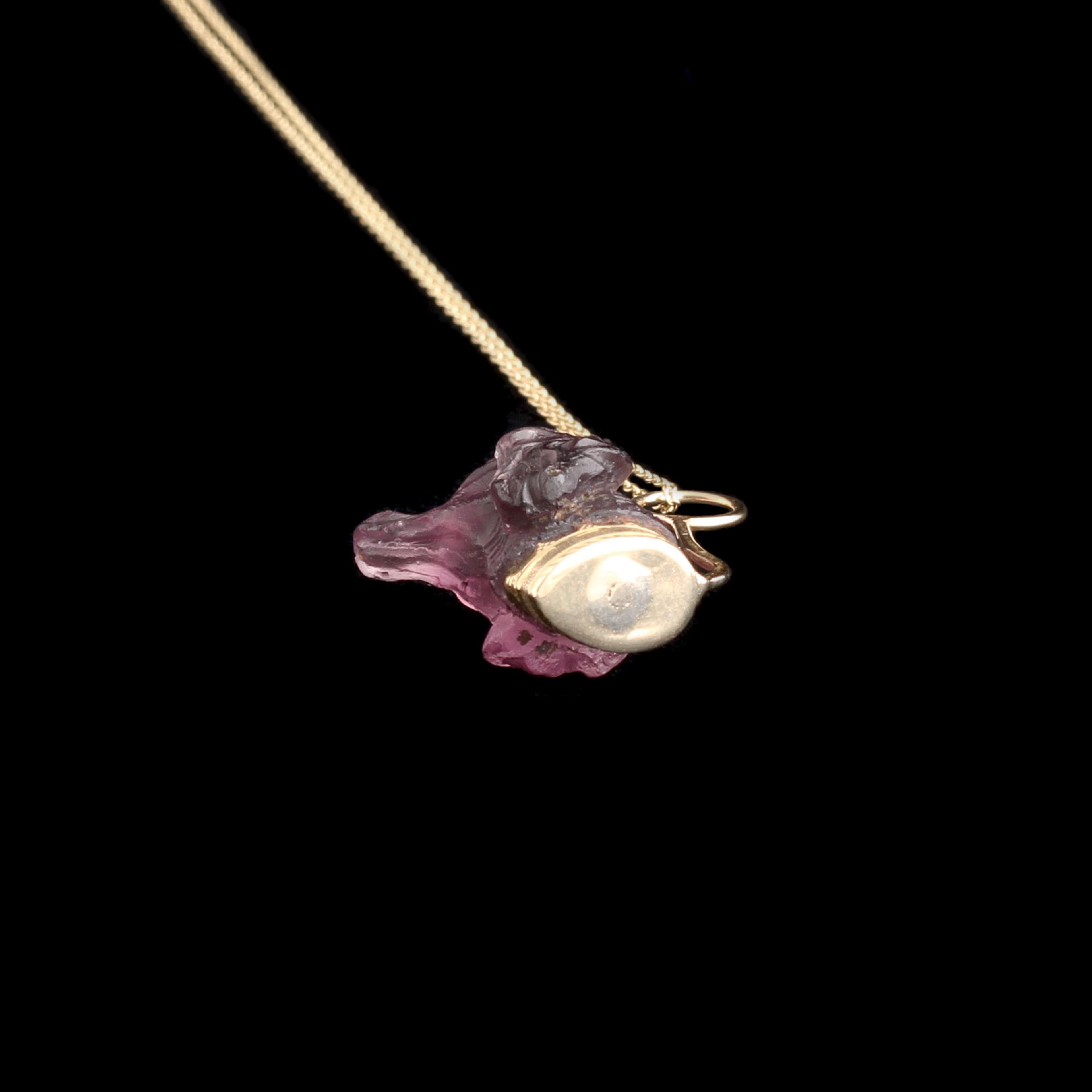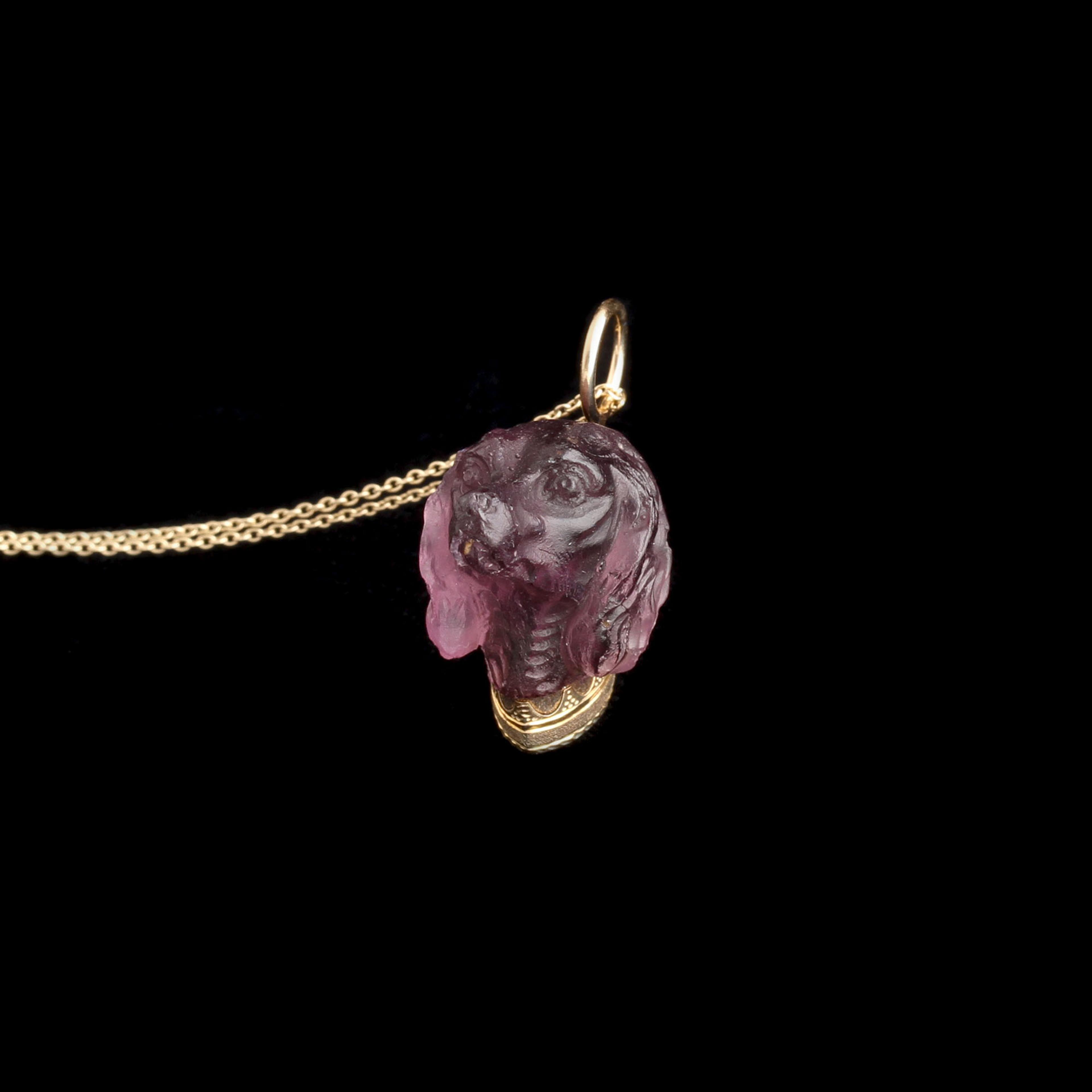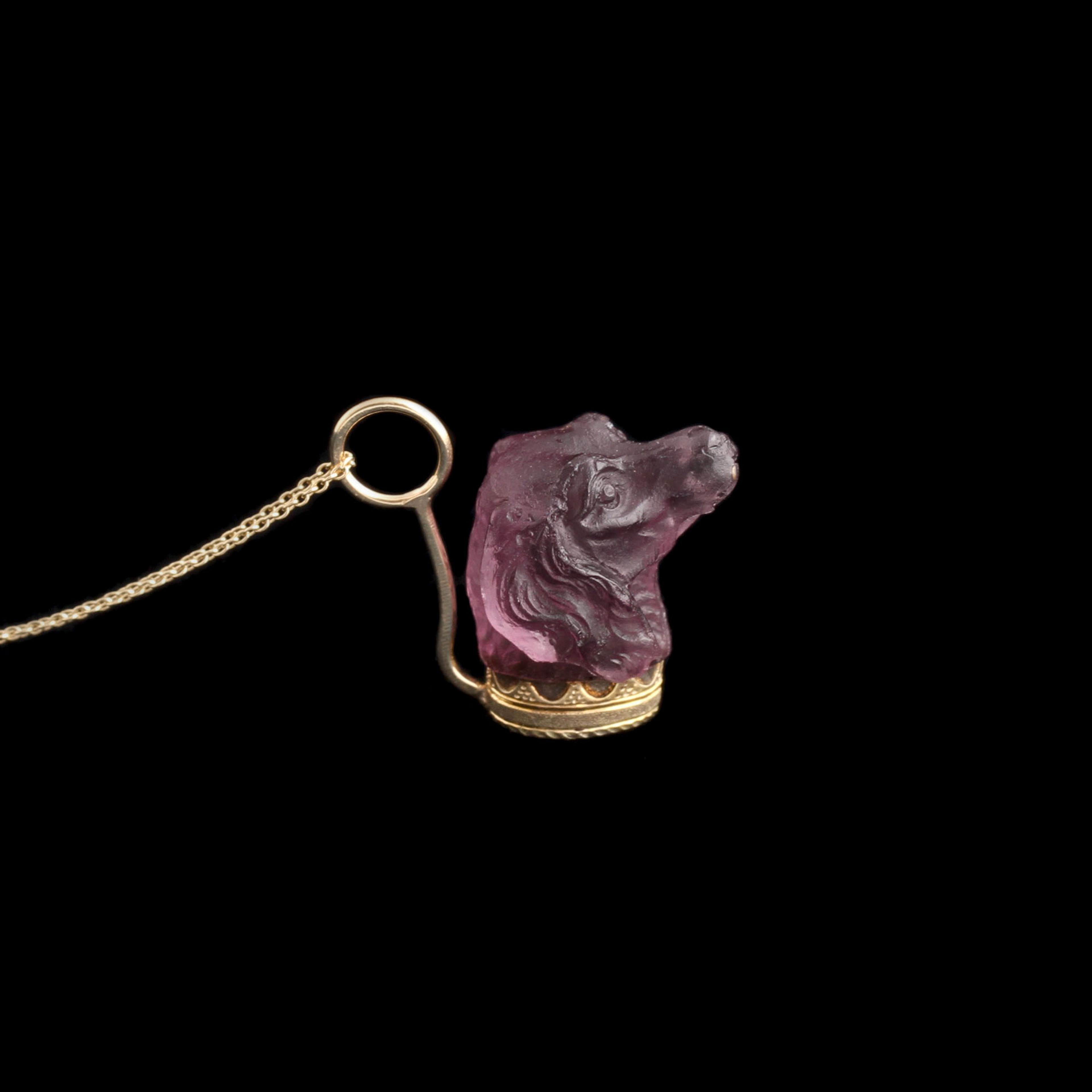 Originally the head of a stickpin, this loyal pressed glass spaniel has been reimagined as a pendant. With floppy ears and an attentive expression, it captures the affection and loyalty that made these dogs beloved 19th-century companions.