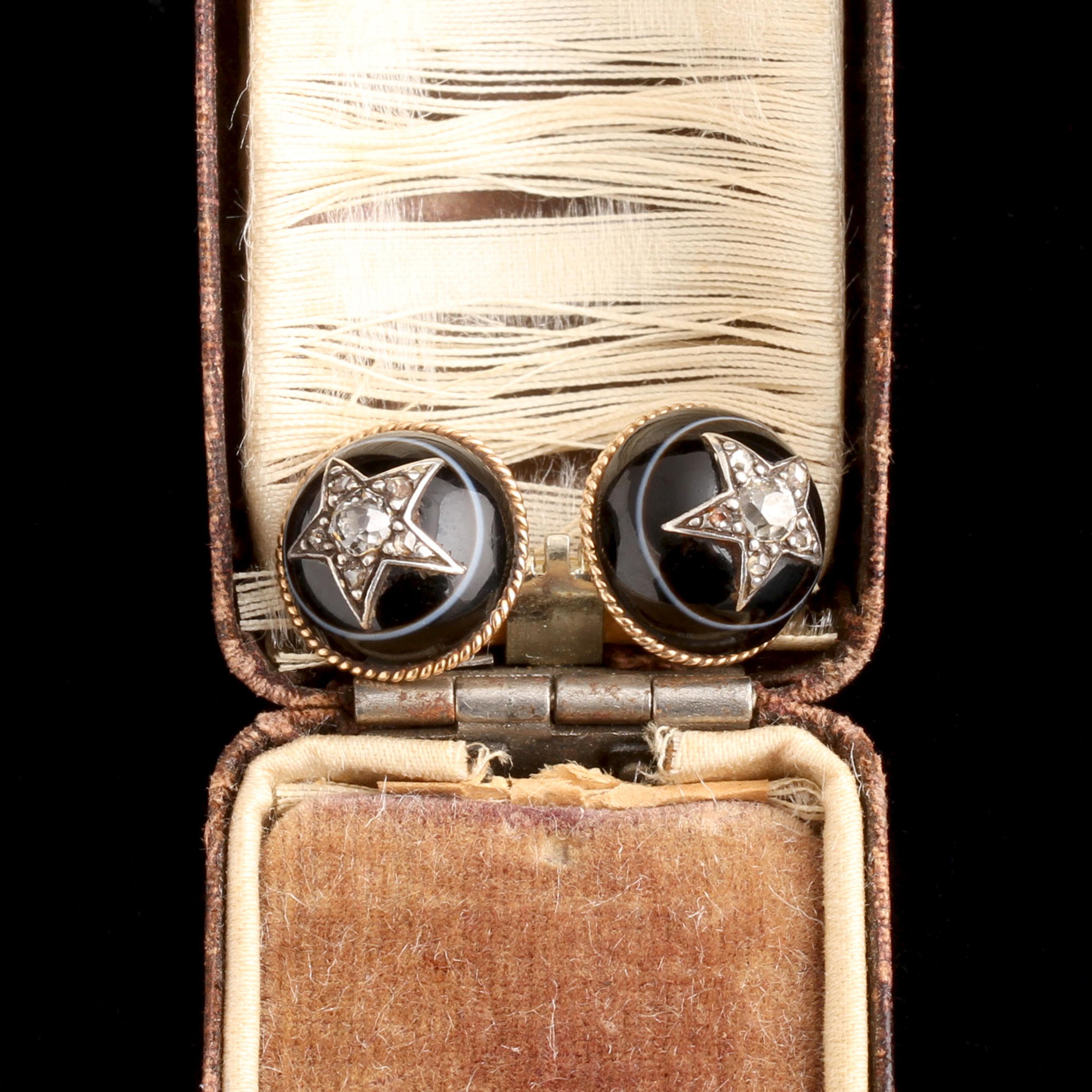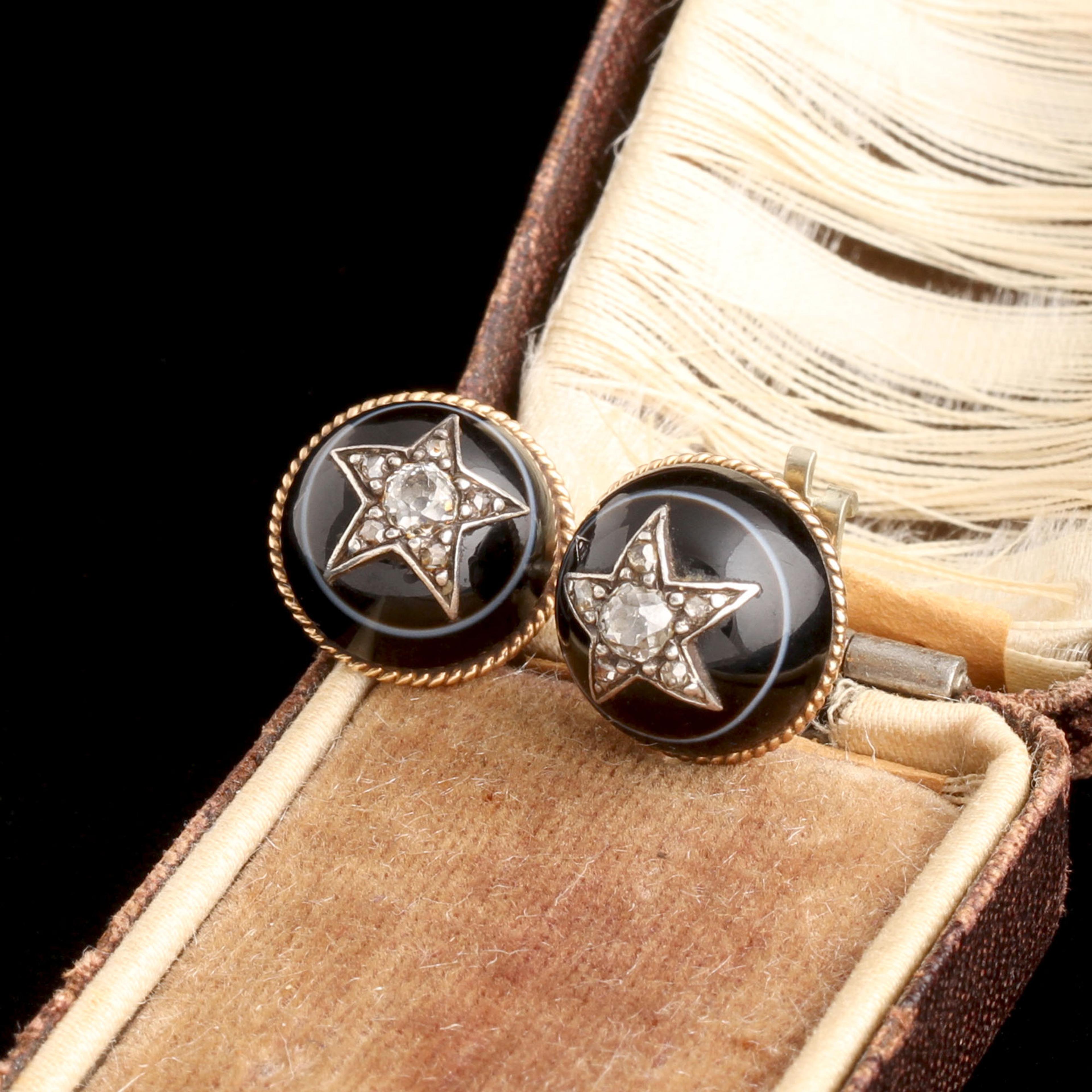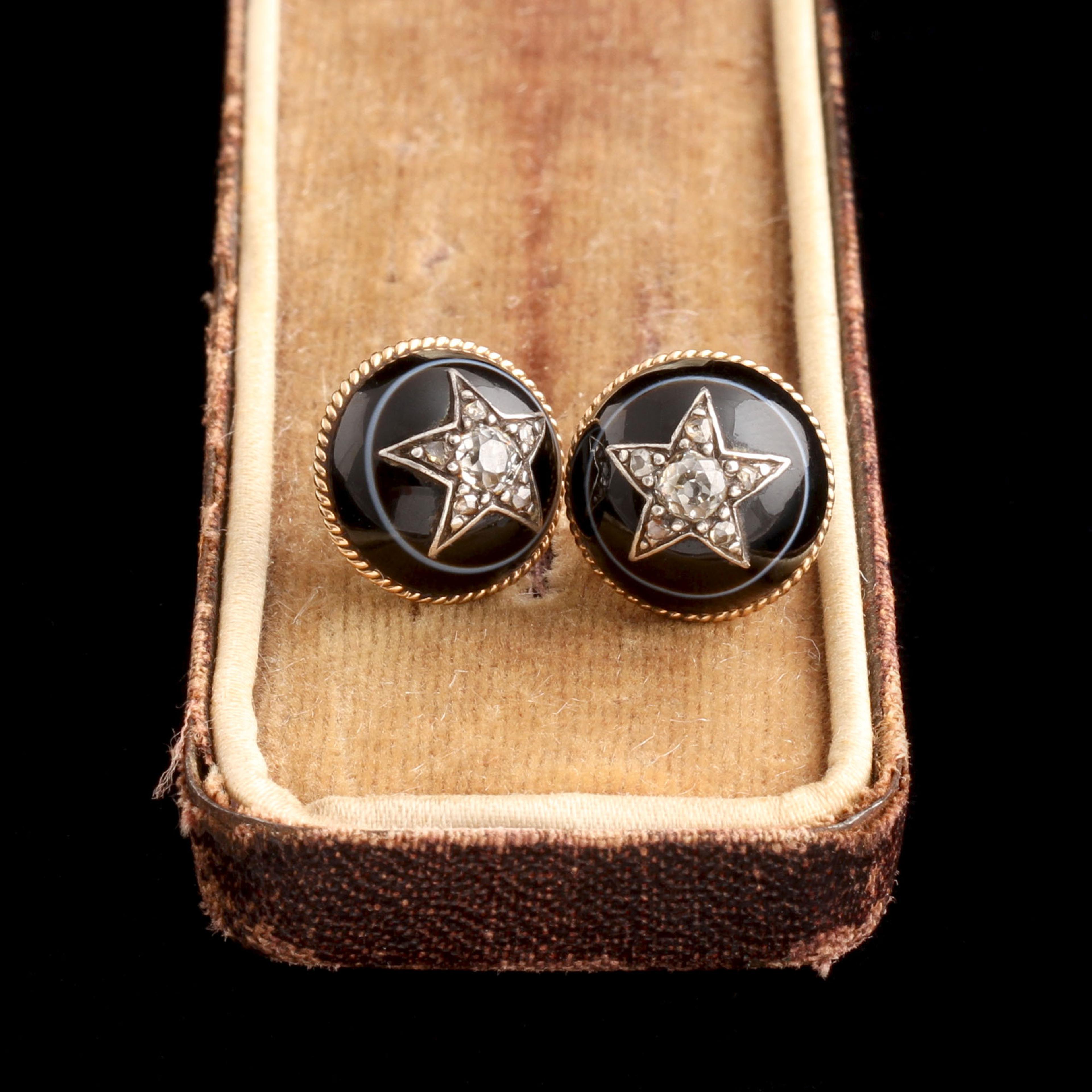 A covetable pair of Victorian earrings featuring banded agate cabochons affixed with diamond-studded stars and framed in twisted gold wire. So good - almost kept these beauties. Posts are newer additions.