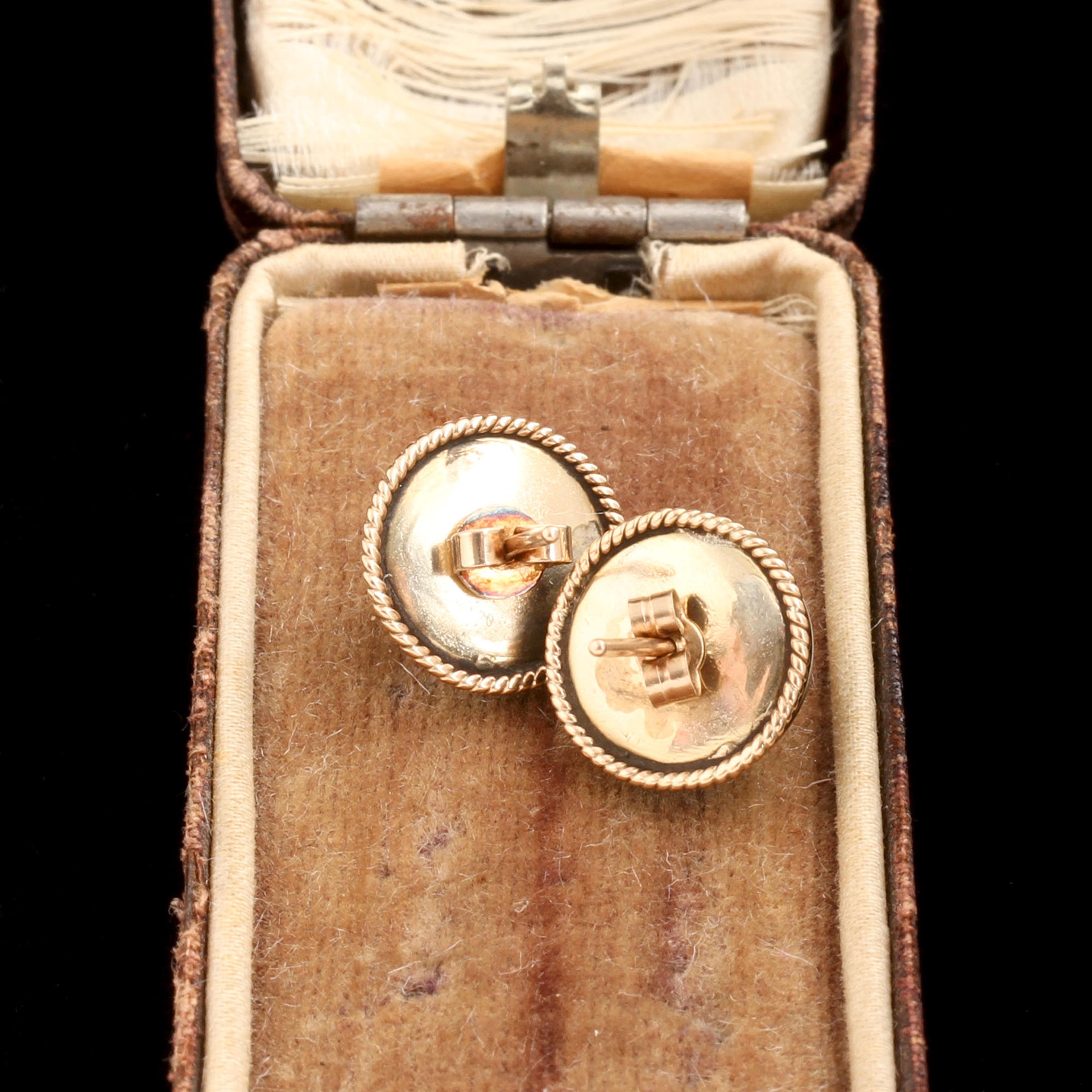 14k gold (tests), 12.2mm high dome banded agate cabochons, 2 3.5mm old mine cut diamonds, 10 1.5mm rose cut diamonds