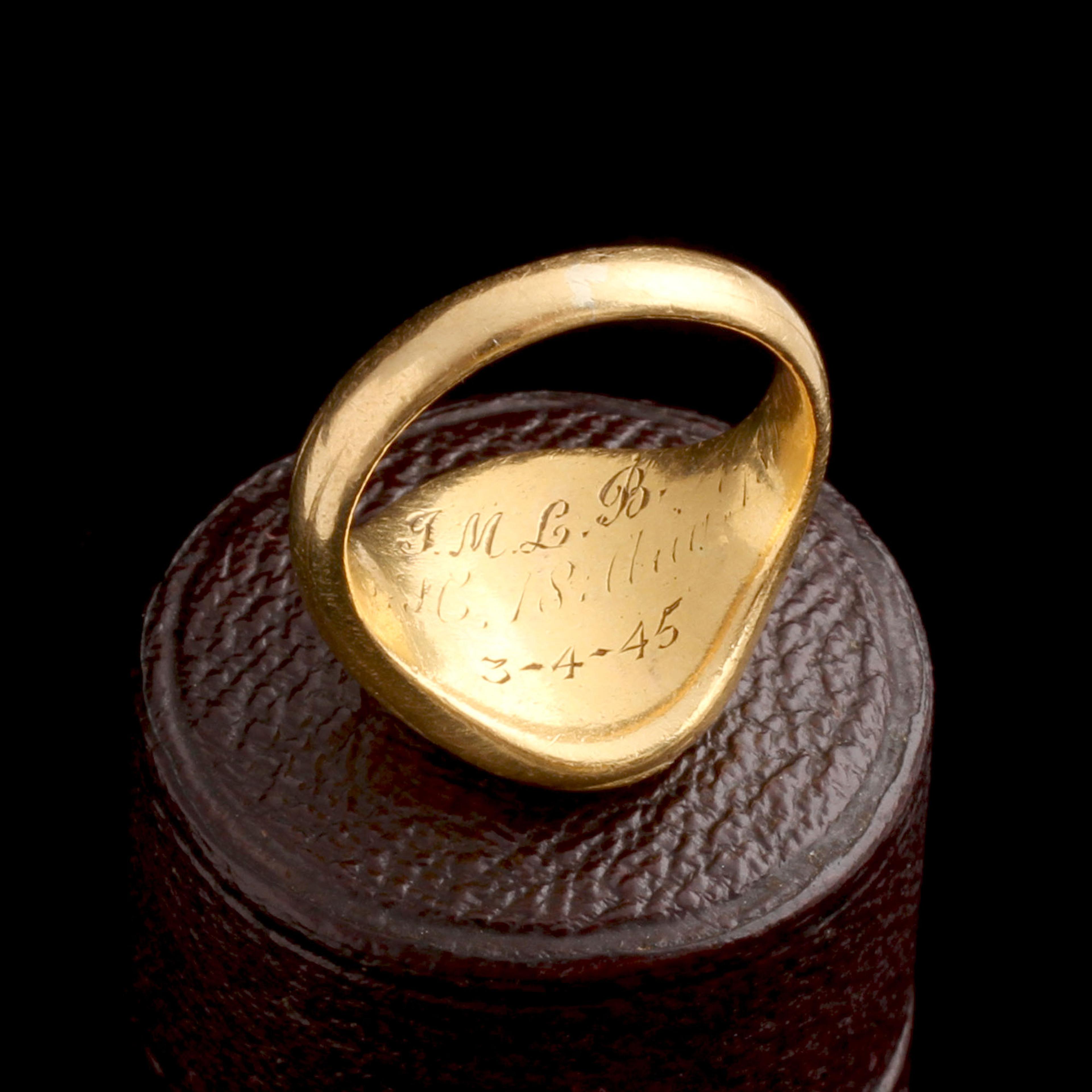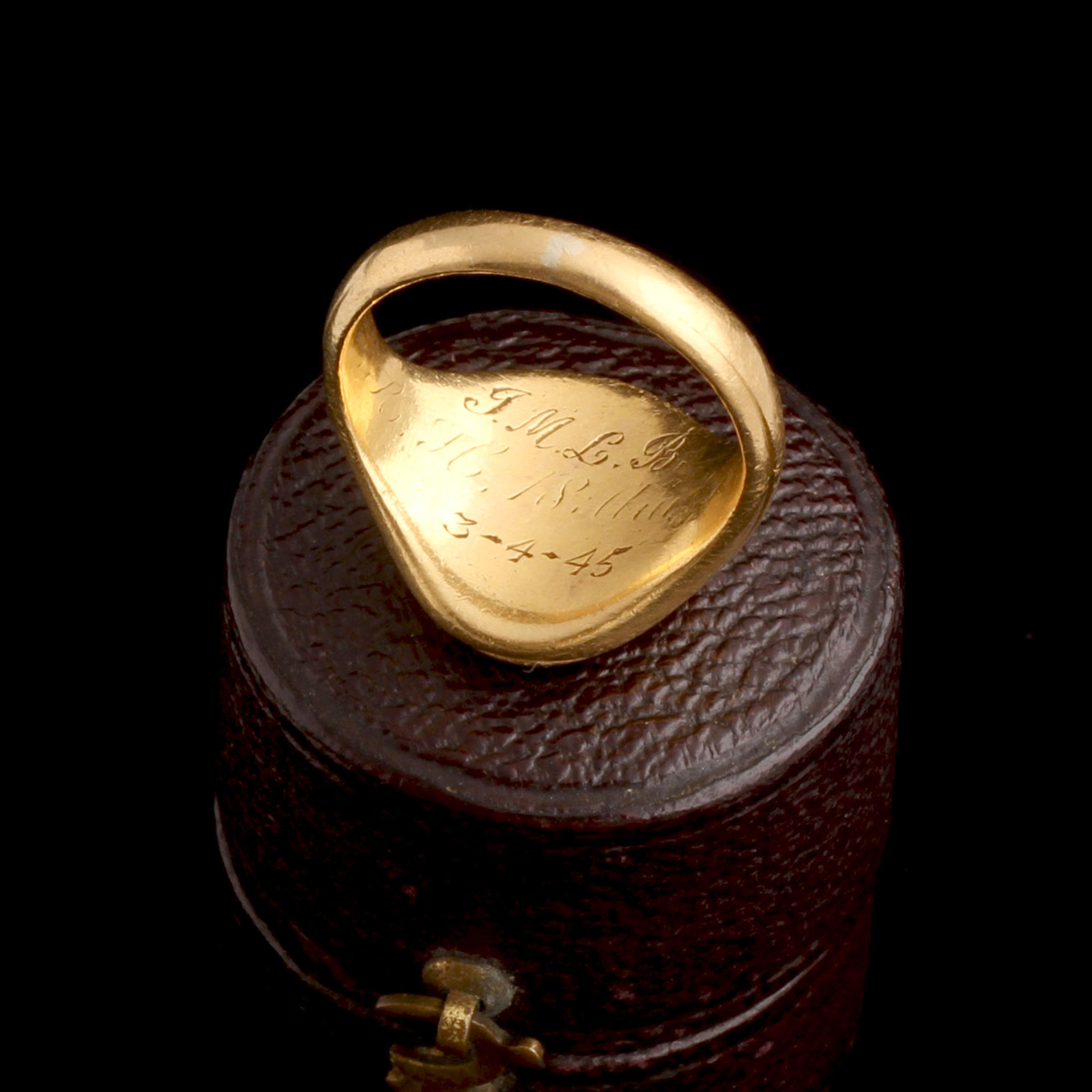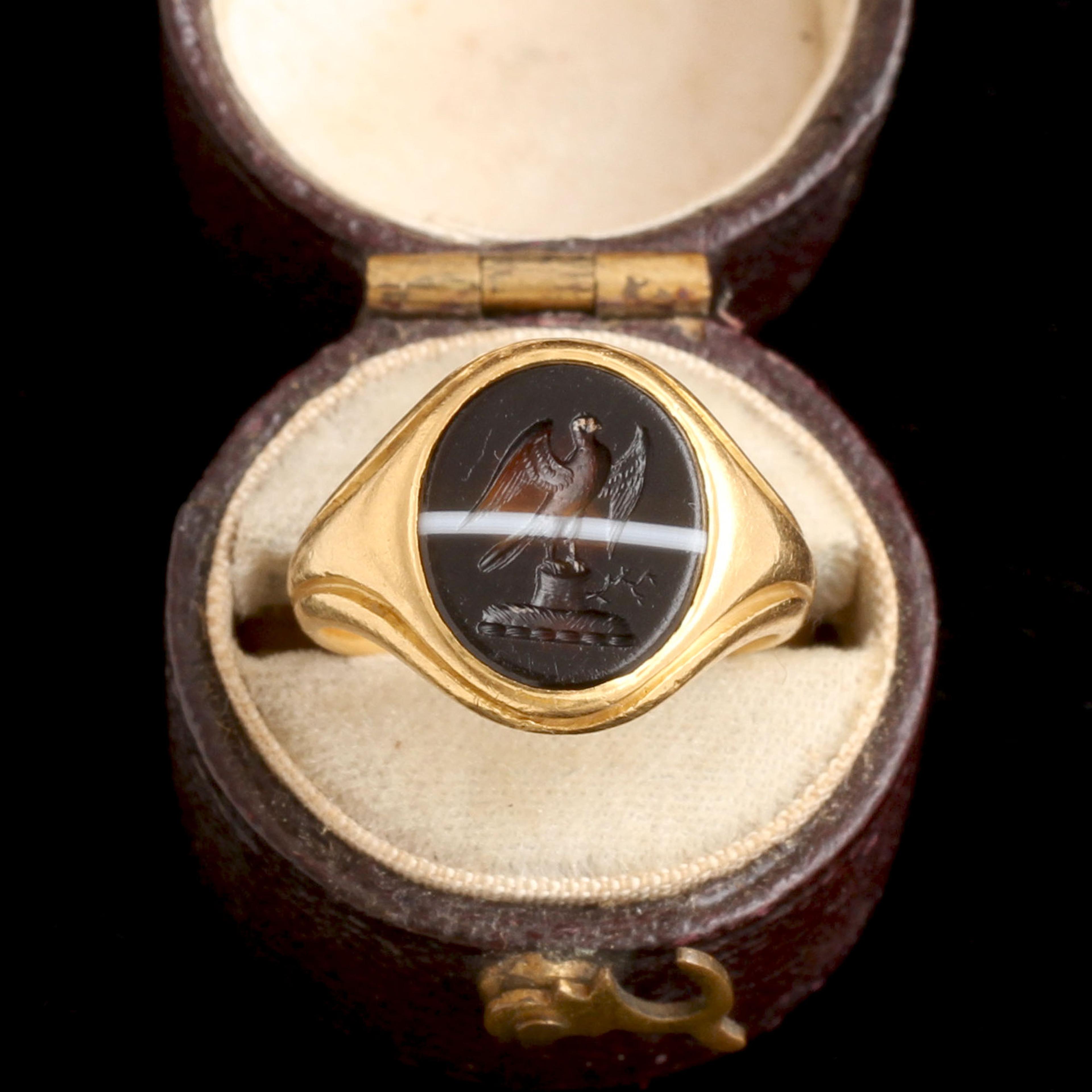 This falcon seems to glow from within; he's carved from a hunk of banded agate that sits within a closed 18k mount, bouncing golden light back through his body. We're seeing the Hay family crest, which features the bird perched on a tree stump. From this dead-seeming plant, a branch sprouts; it represents new life arising from the old, or prosperity after a near-catastrophic event. Themes of continuity, possibility & rejuvenation are all packed into this natural scene. The Hay family motto: "Speravi in Domino" = "I have hoped in the Lord." The engravings inside tell us that the ring was passed down within the family over nearly 100 years.