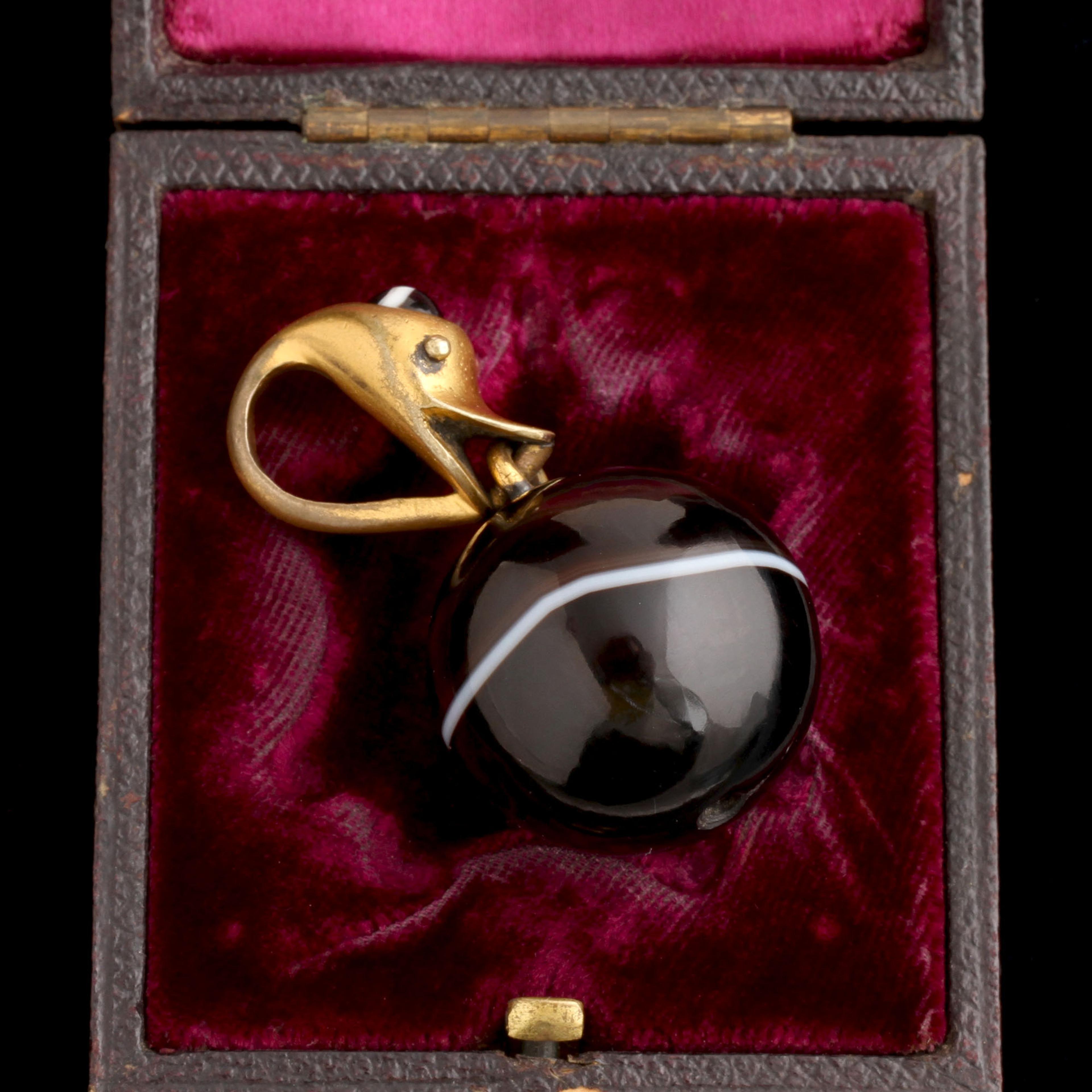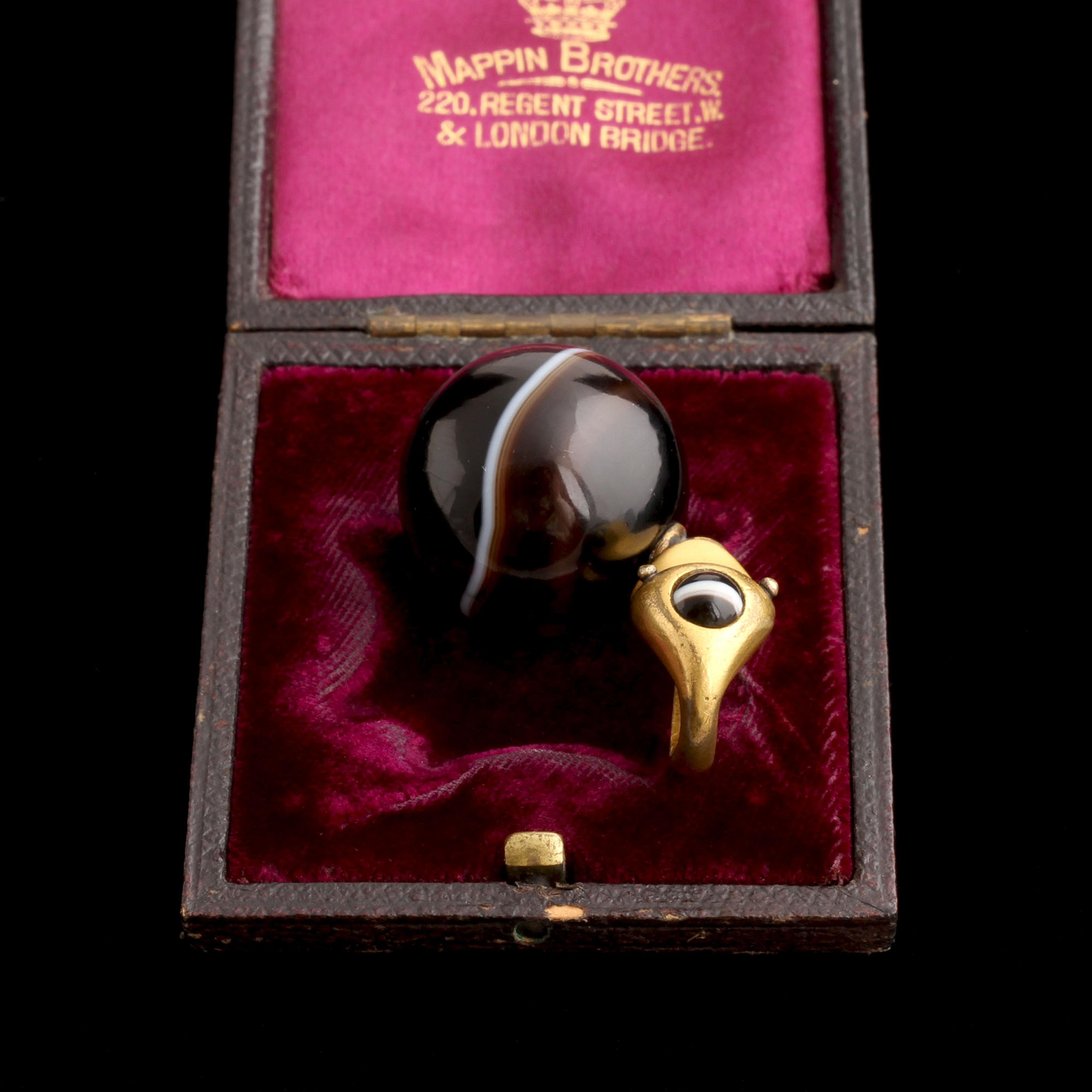 This serpent, bug-eyed and hypnotic, holds a half-orb of banded agate in her head. From her mouth dangles a full banded agate sphere. A mysterious piece dating to the American civil war; the horizon is wobbly.