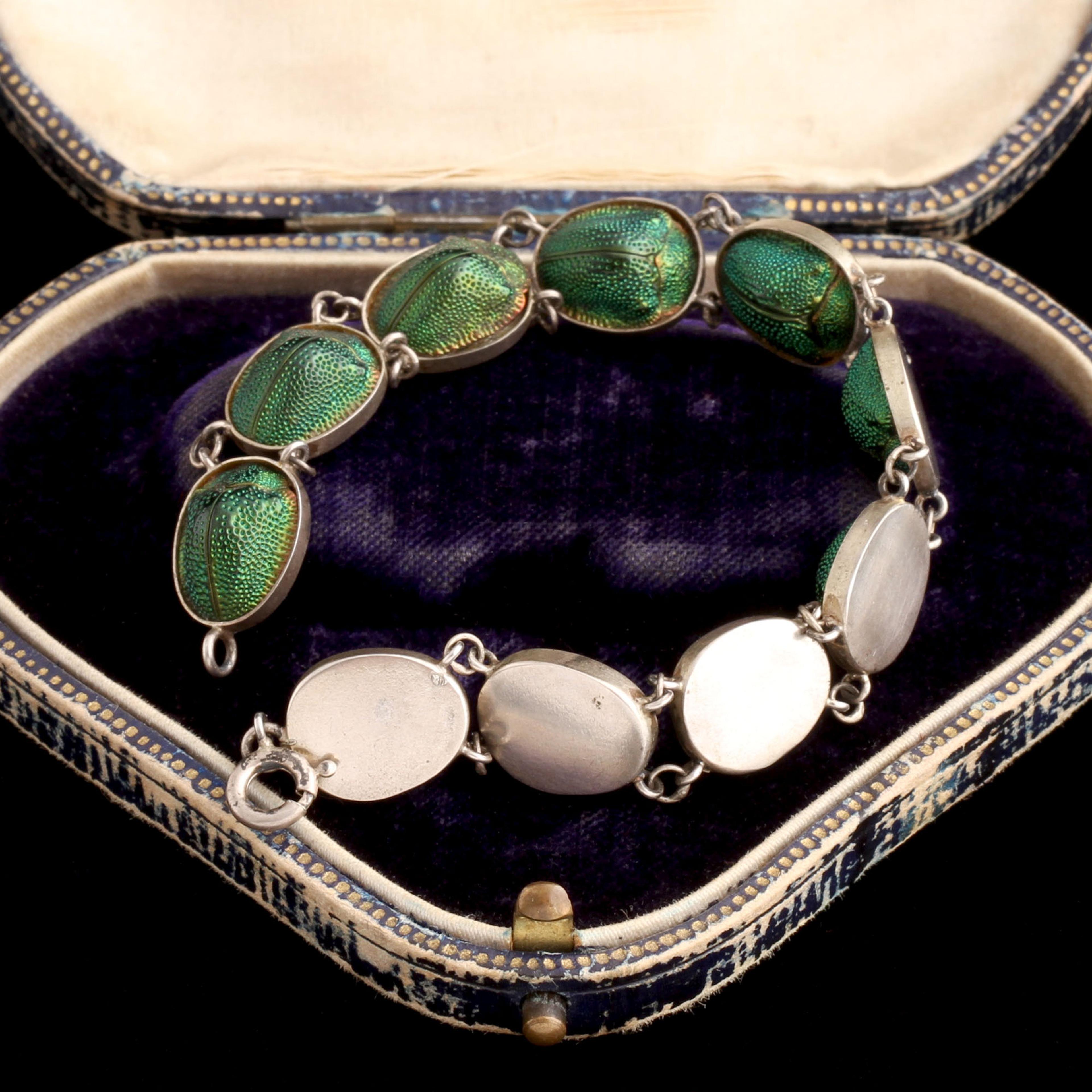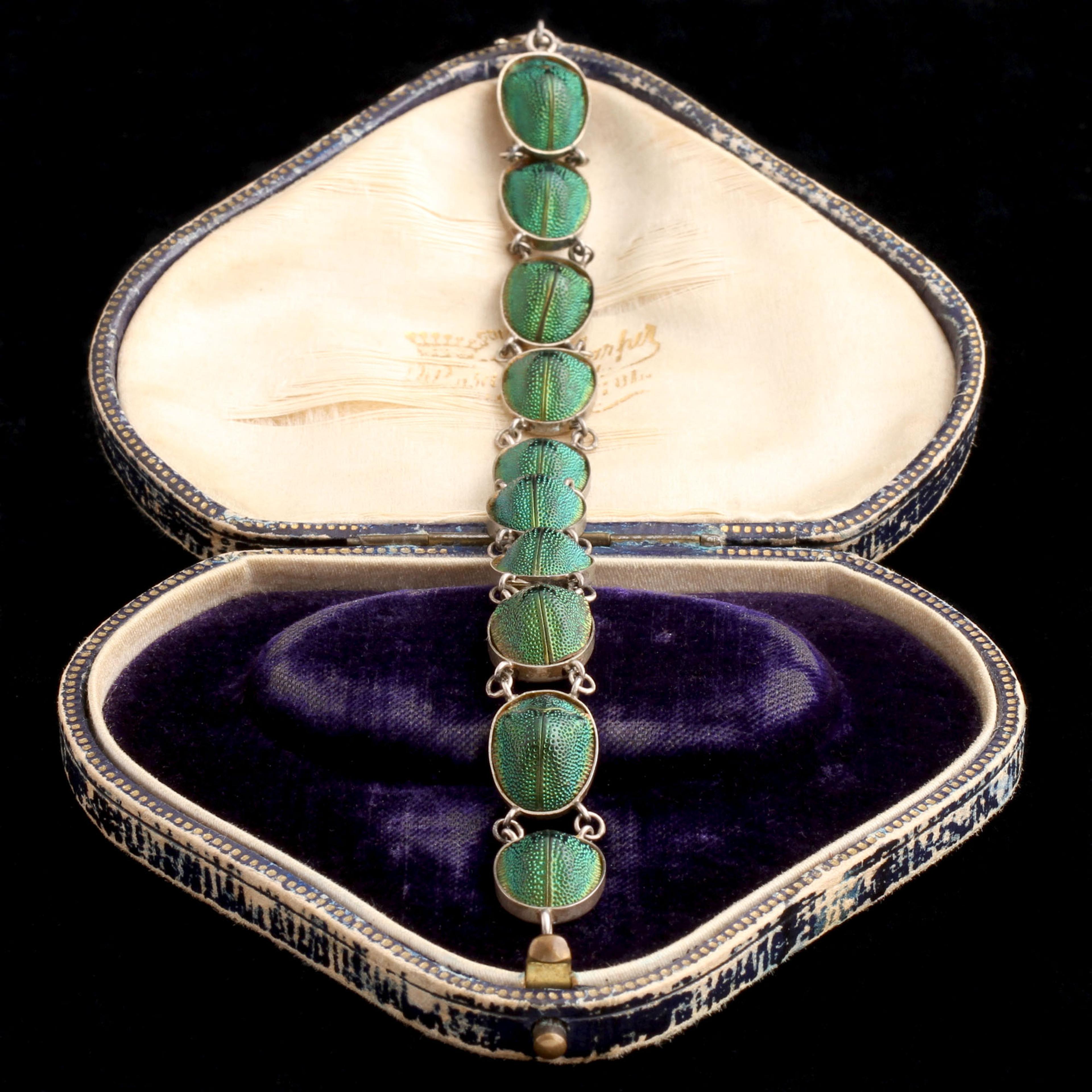 THE 1880's MARKED a surge of fascination with the natural sciences, as Darwin's theories were reverberating throughout the Western world. Even the tiniest creatures were examined and collected with reverential wonder. These iridescent beetles, imported from far away from England, were brought back and mounted in a silver lemming-like lineup.