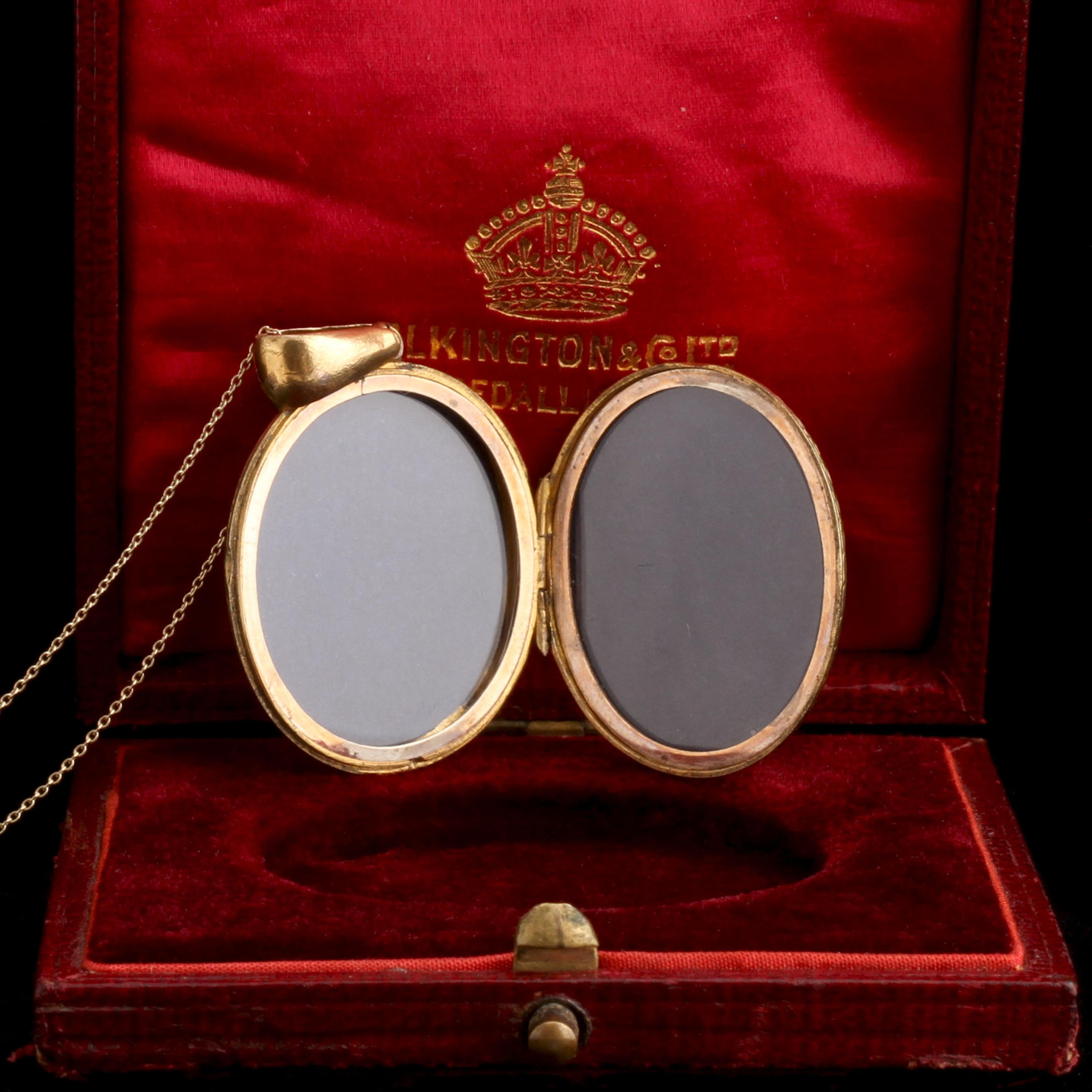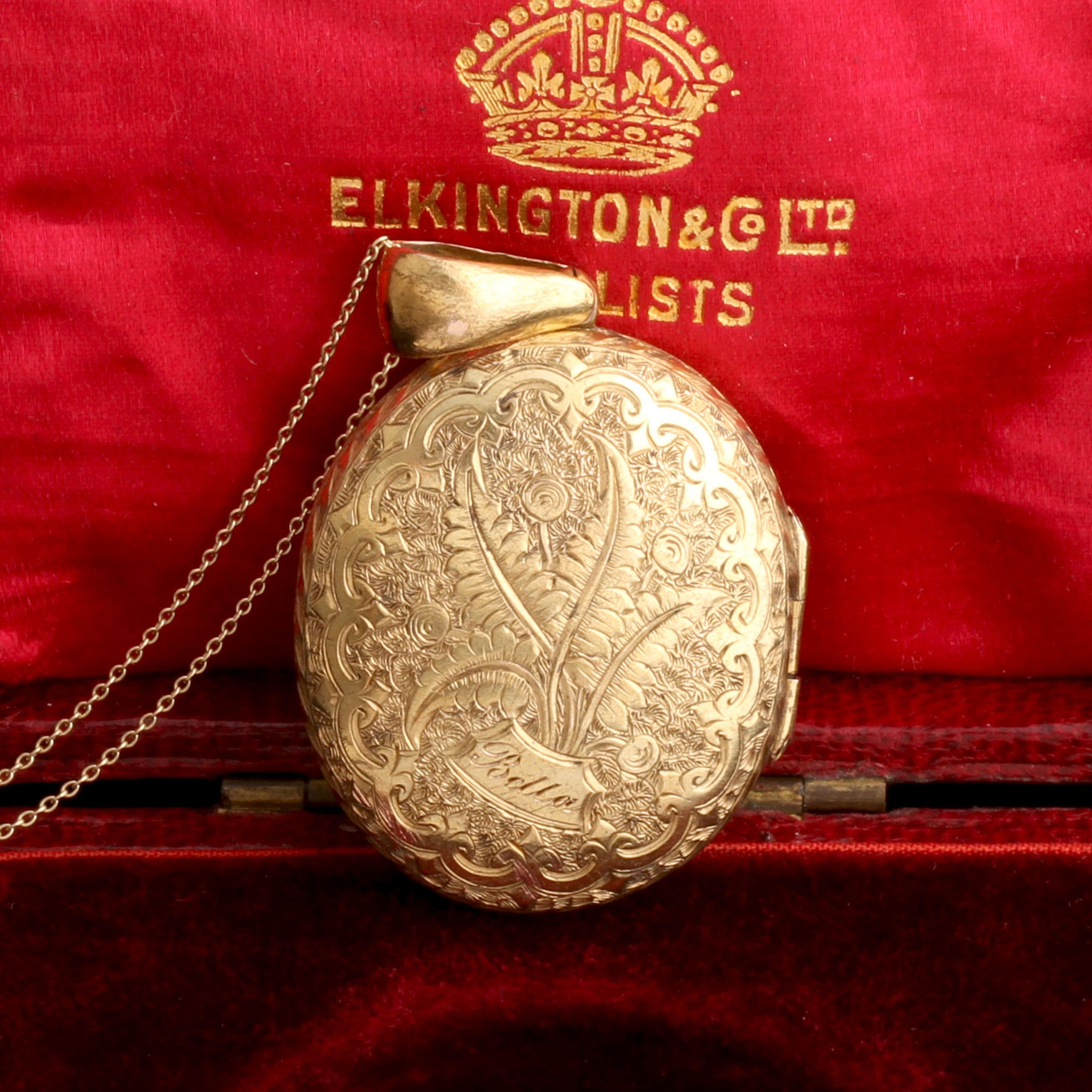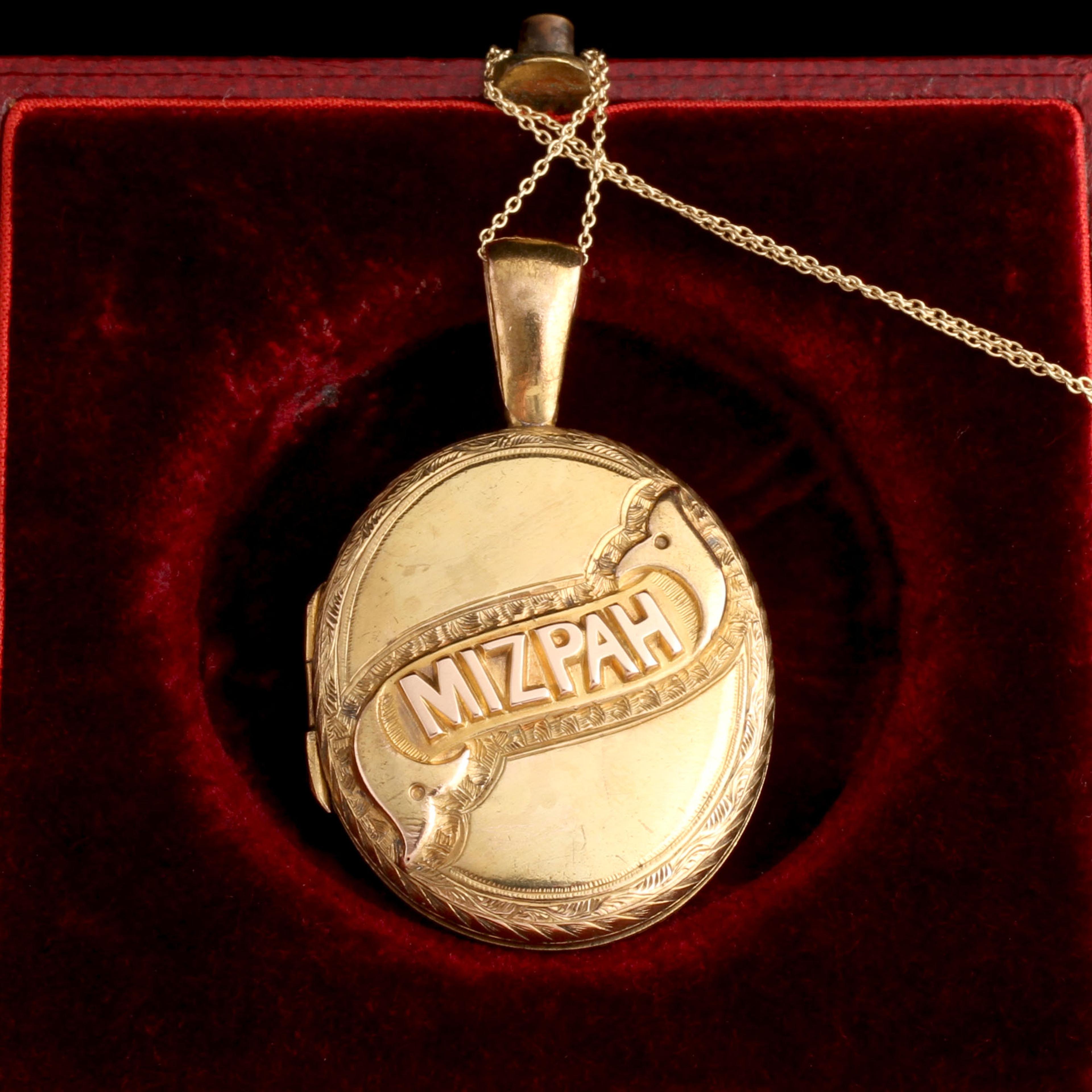 A locket that combines two highly specific late 19th century fads. The first is “Mizpah,” a word from the old testament that describes a bond and Victorian shorthand for “I love and miss you.” The second, ferns! Long ago, in the days before social media and streaming television and electric lighting, the upper echelons of British society were gripped by what is scientifically named pteridomania but in common parlance is known as “Fern Madness.” From the mid Victorian period until about the 1890s, fern hunting was a wildly popular hobby. Both amateur and professional botanists would hunt for fern specimens and catalog them as a pleasure pursuit. This enthusiasm for the fronded plant translated to the decorative arts and a great deal of pottery, textiles, wallpaper, and yes, also jewelry. The ferns on the back side of this locket are engraved with the name “Bella.”