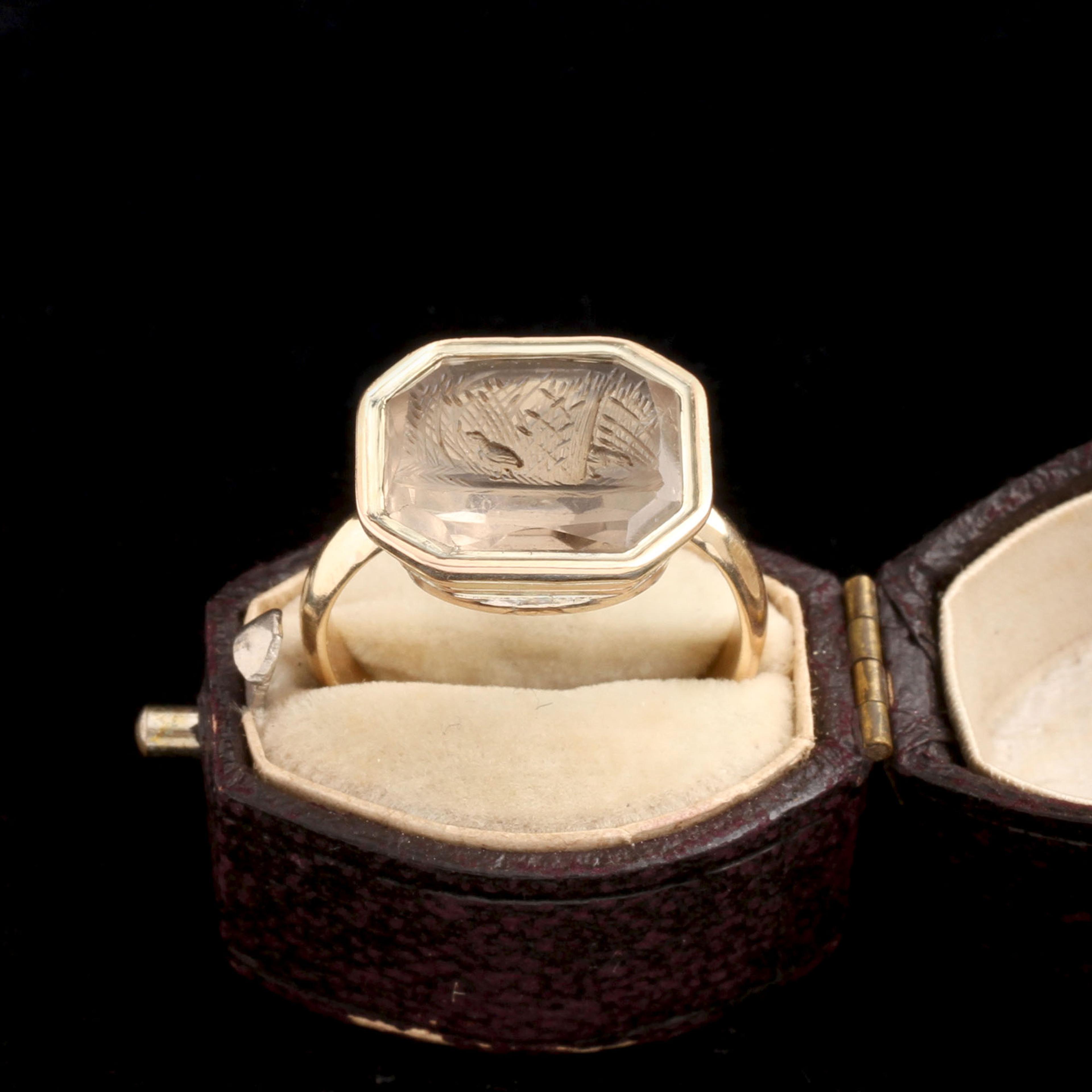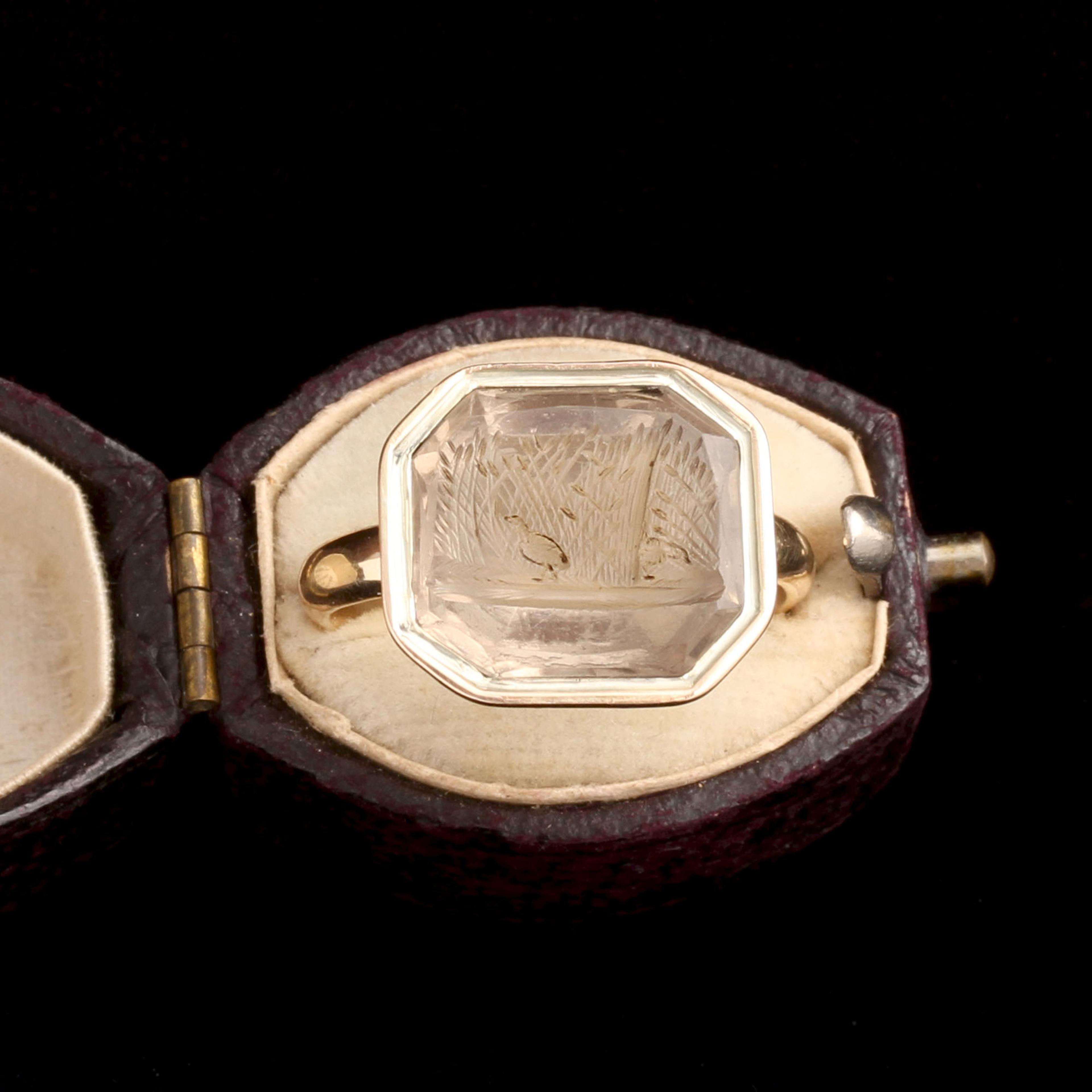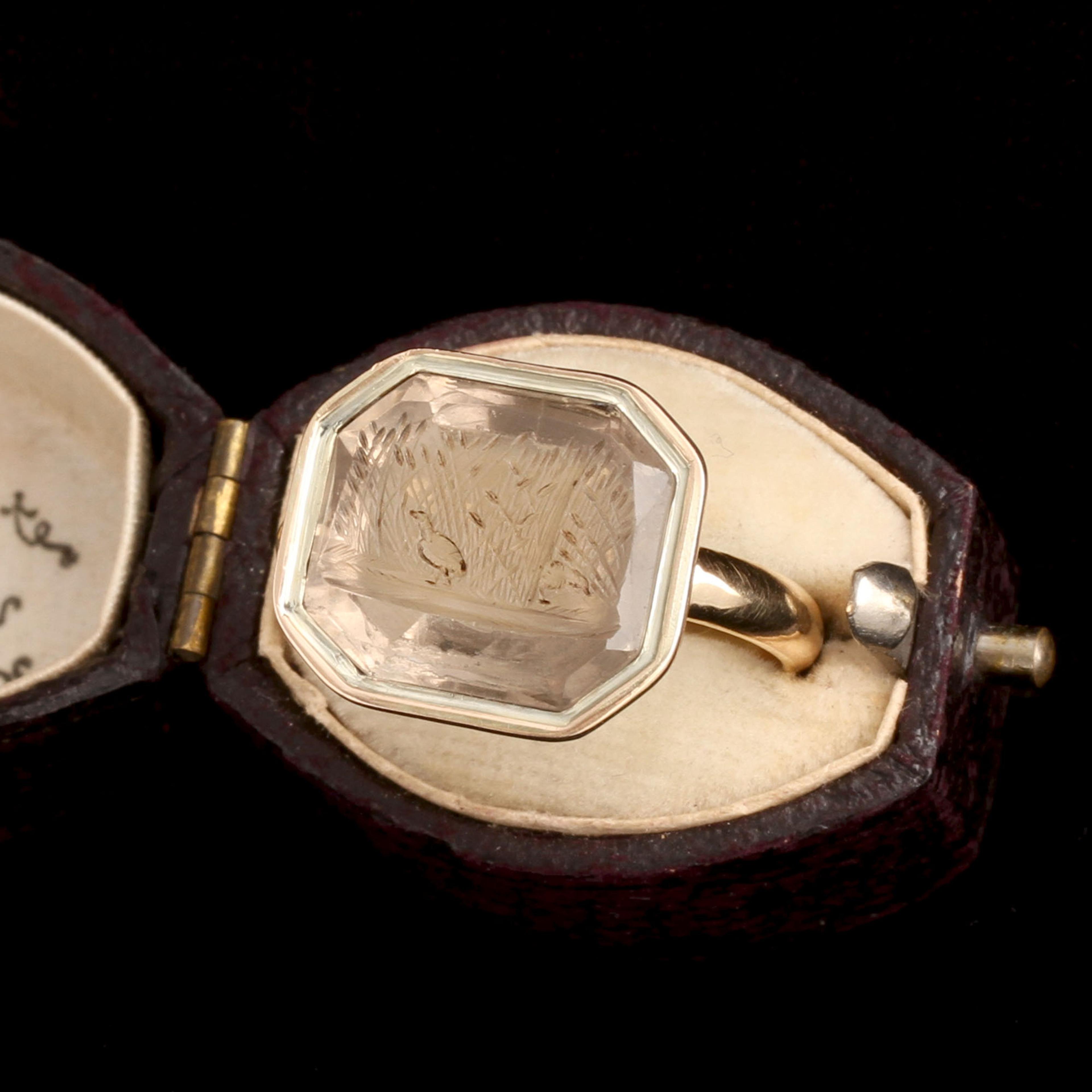 A chick-like bird walks among bulrushes (like cattails, for Americans.) Another bird peeks from behind the stalks. The scene is asymmetrical, offbeat, and very calm. Was this citrine carving supposed to be some kind of allegory? It was set into a gold mount sometime around the 1850s. The citrine is pale and warm.