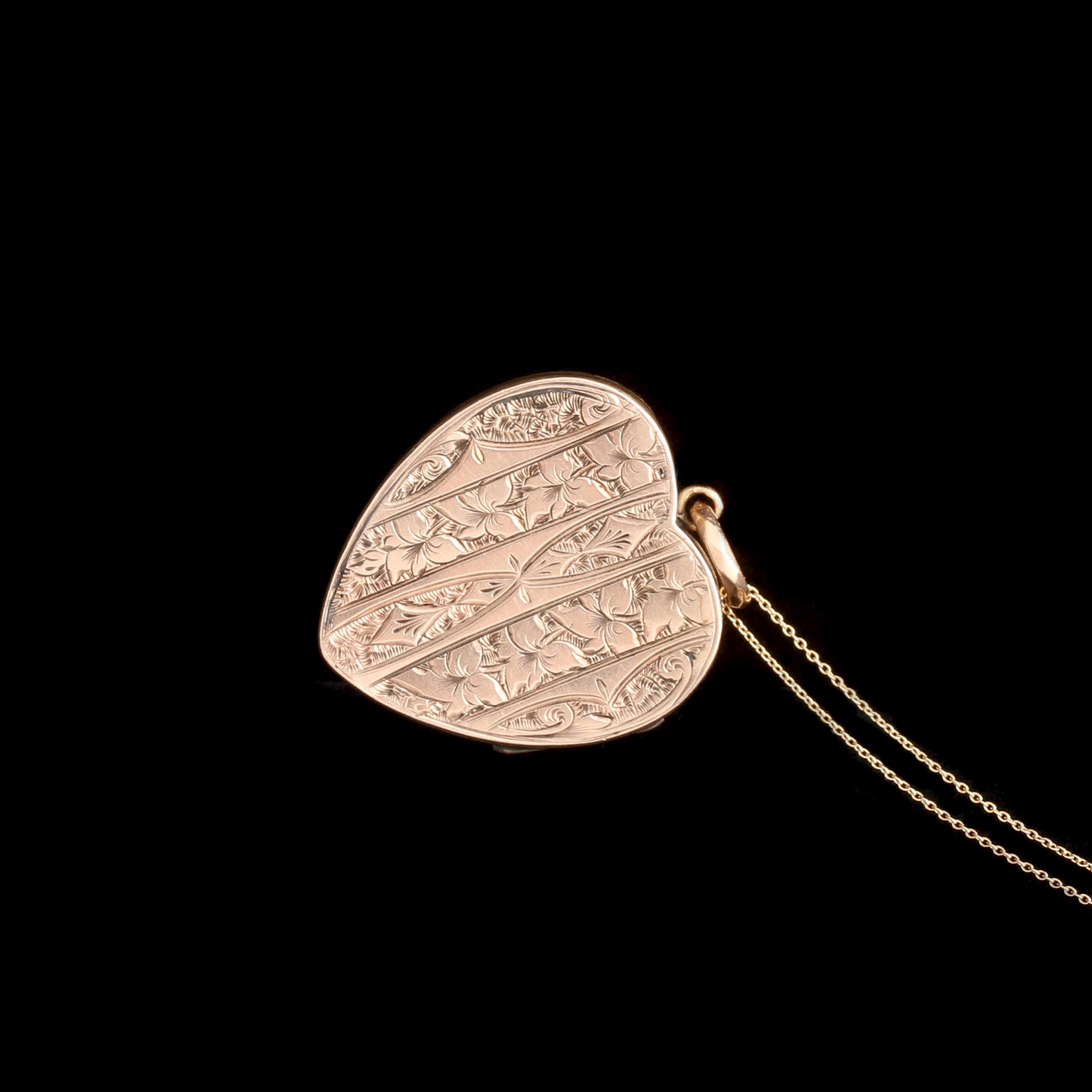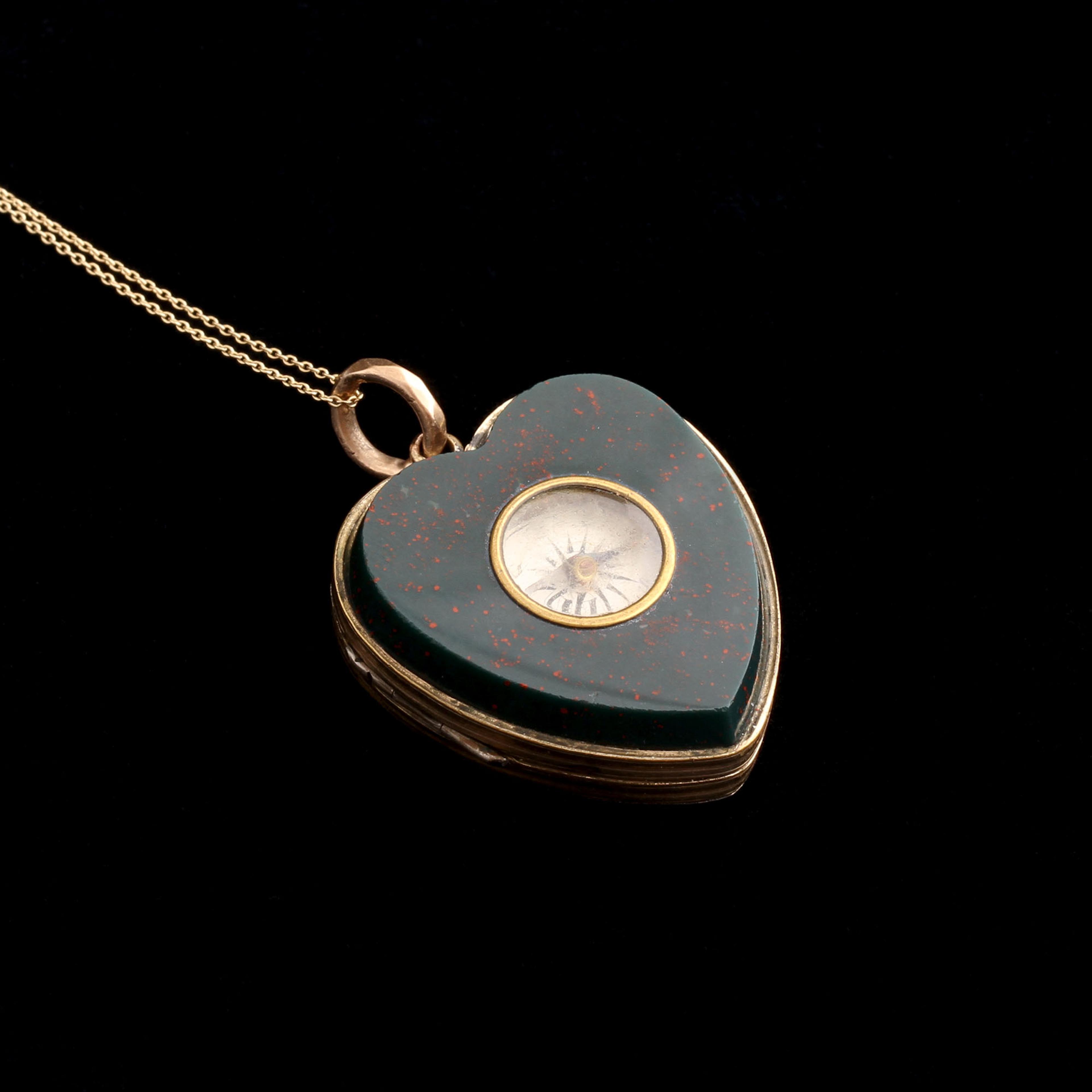 A large Victorian heart locket with a working compass inset into its bloodstone face. The locket is 9k gold back and front with a base metal interior. The faceted gold bale is an extra nice touch. On a new 18" 14k gold chain.