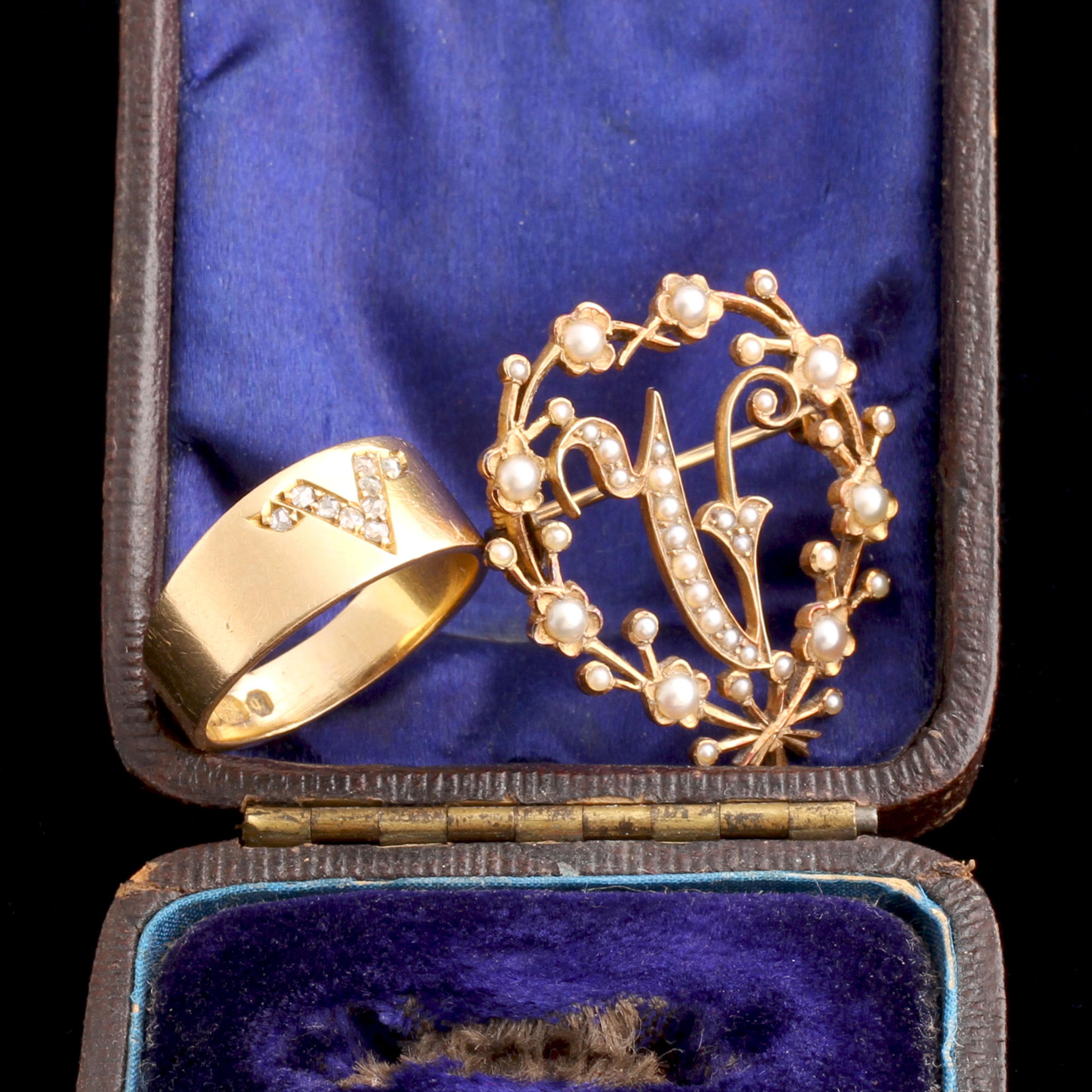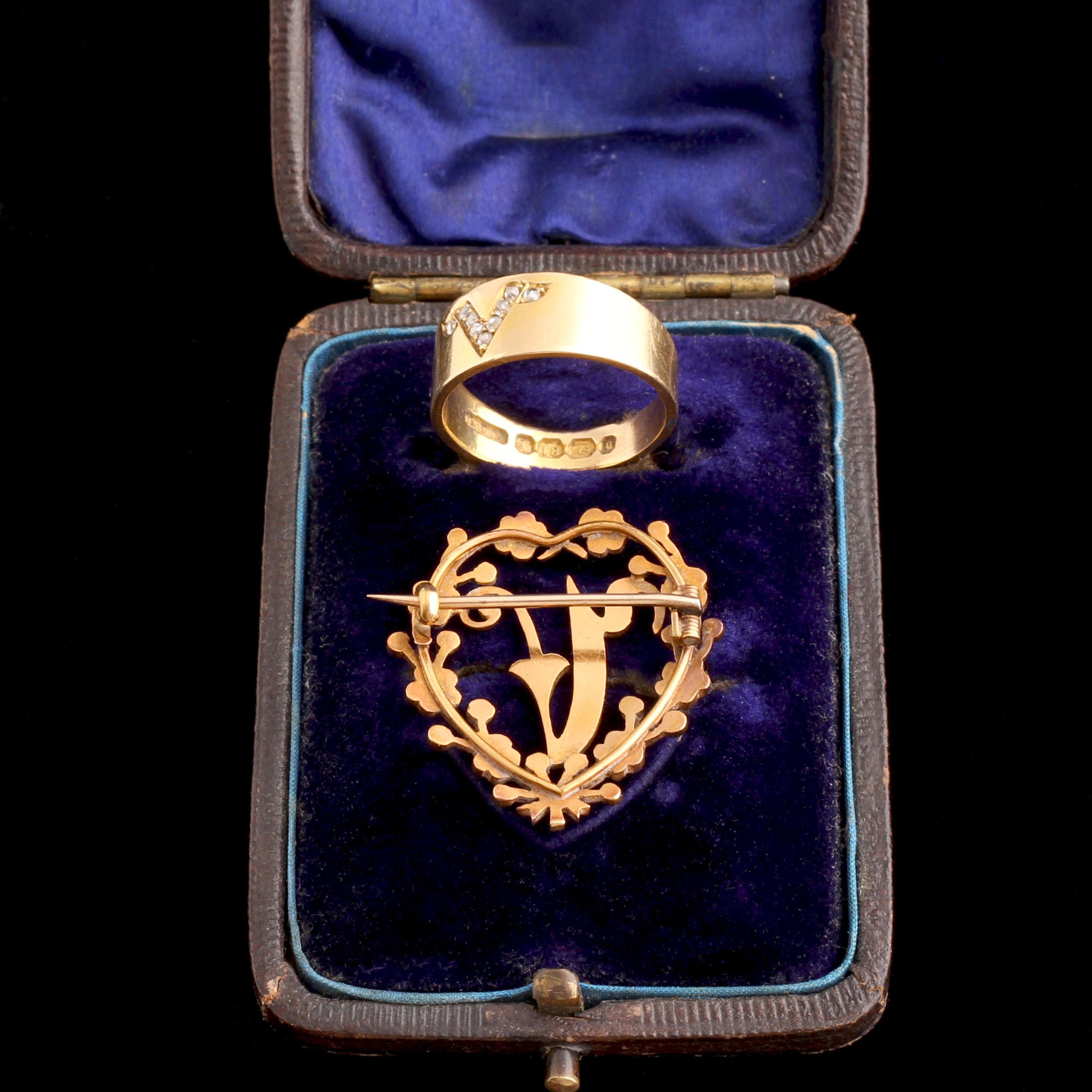 This "V" boxed set of jewelry - a ring and a brooch - came directly from Queen Victoria. She famously gave jeweled gifts to her bridesmaids, but she gifted jewelry to her staff, too. This incredible piece was commissioned for a member of her massive entourage. It's likely that she gave them to all the ladies-in-waiting, kitchen maids, stable attendants, seamstresses, and anyone else working in the palace, perhaps as a Christmas gift in 1890? The hallmarks are for that year, and the city stamp: Birmingham.