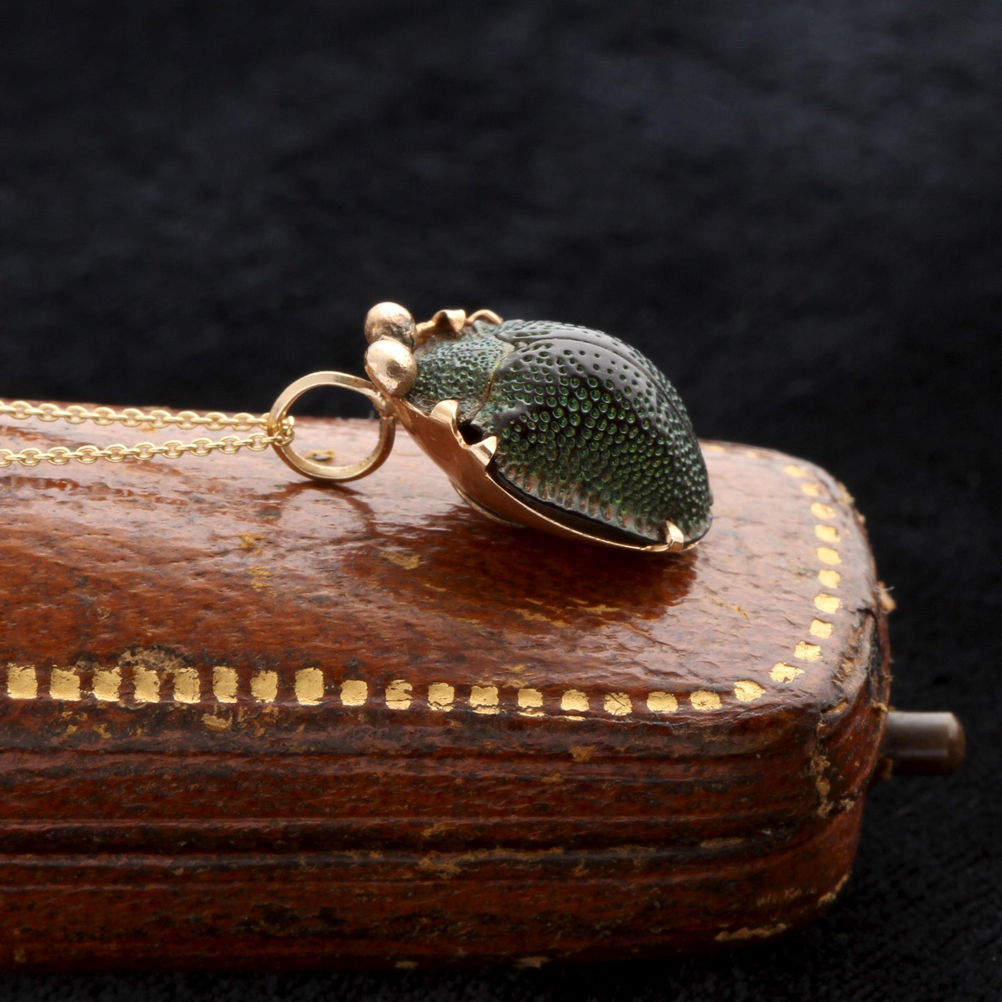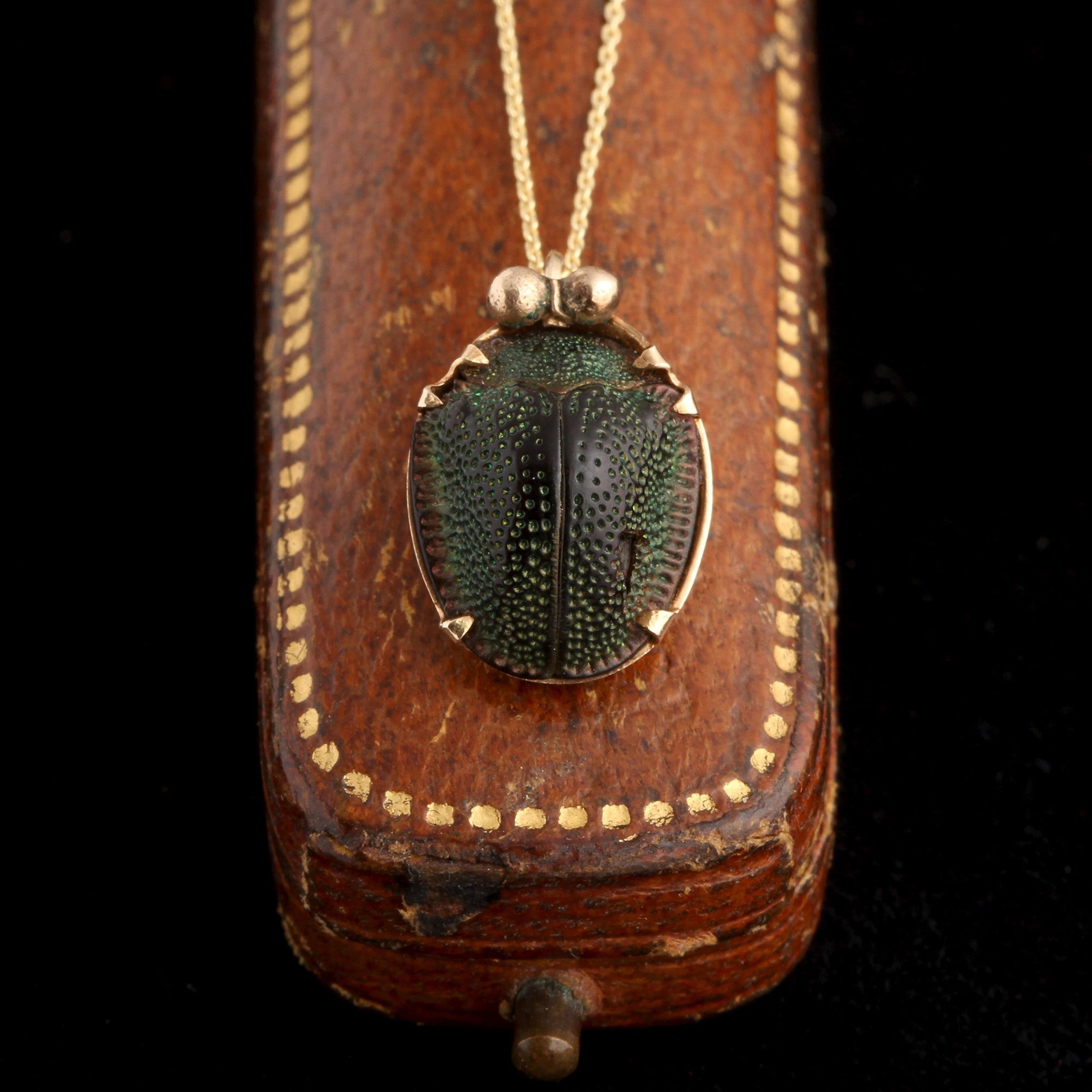 The Victorians were great fans of novelty jewelry. Ornaments of curiosity were designed with consideration for beauty and color, but also with the intent to amuse and delight the wearer. Such eccentric styles include mounted hummingbird heads, tiny golden renderings of mice, and bejeweled flies, just to name a few. These c. 1880 buggy-eyed scarab pendant (formerly a stickpin) would have been classed a "Cleopatra ornament" at the time it was made, though it bears little relation to the jewels of Ancient Egypt, and in fact, the beetles were most likely imported from South America.