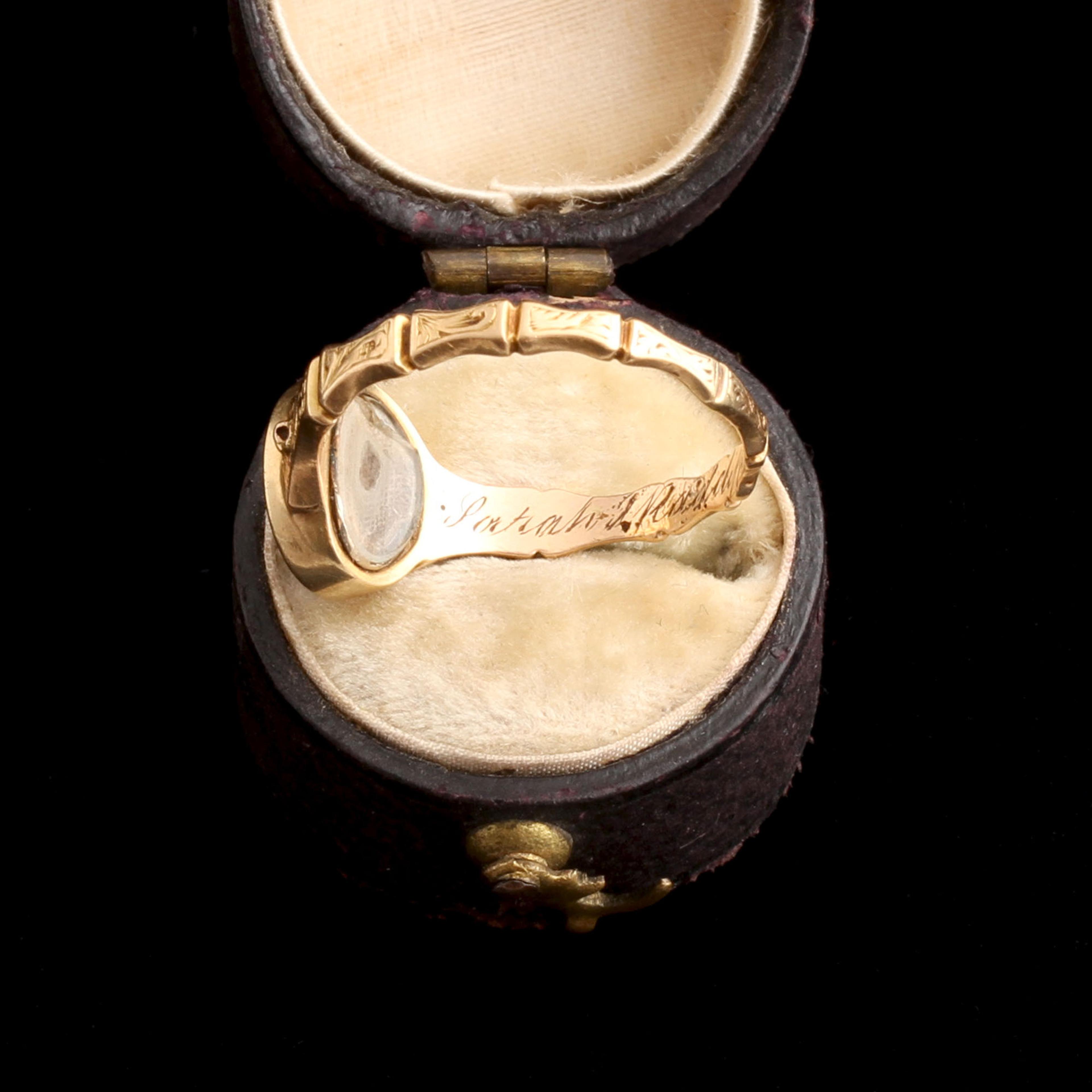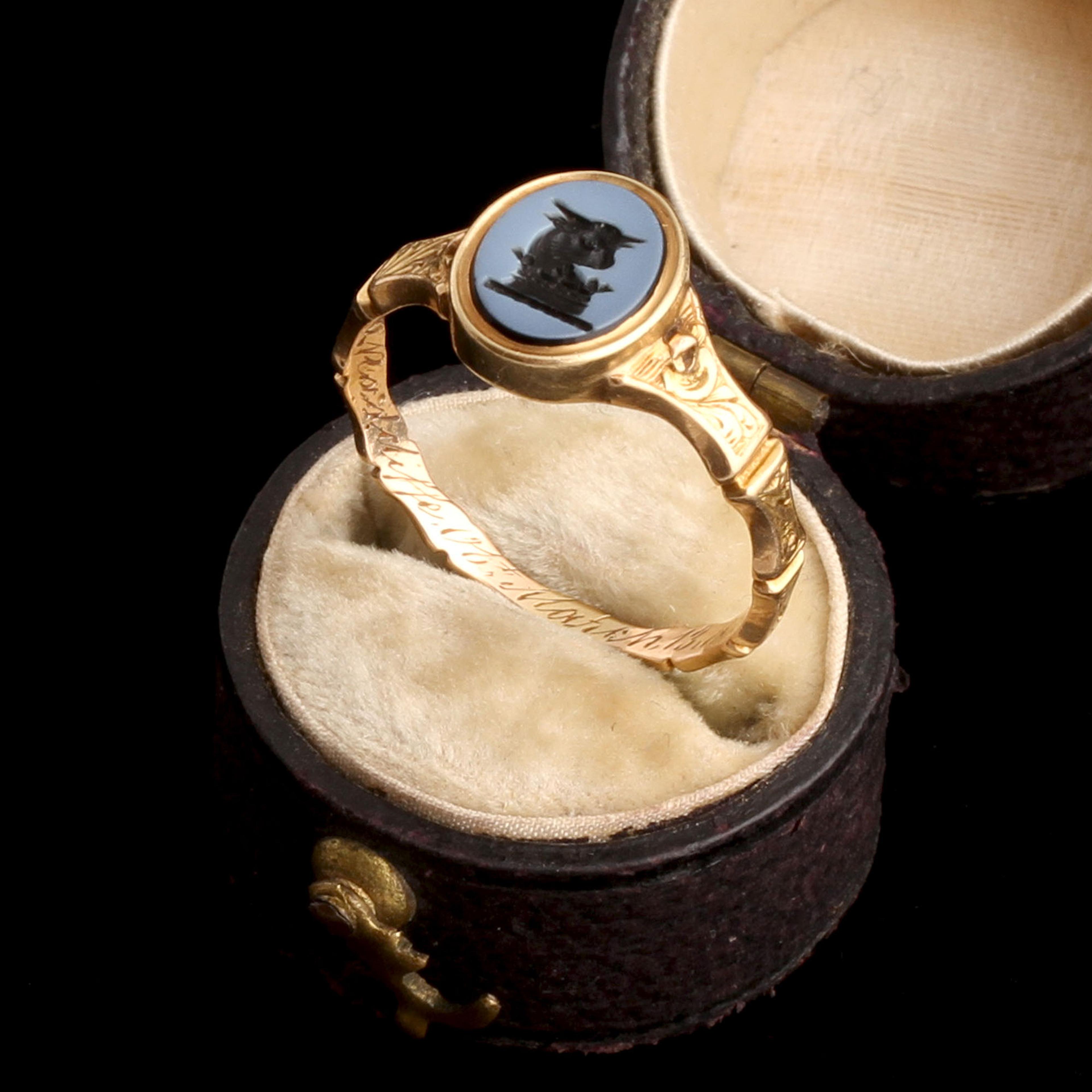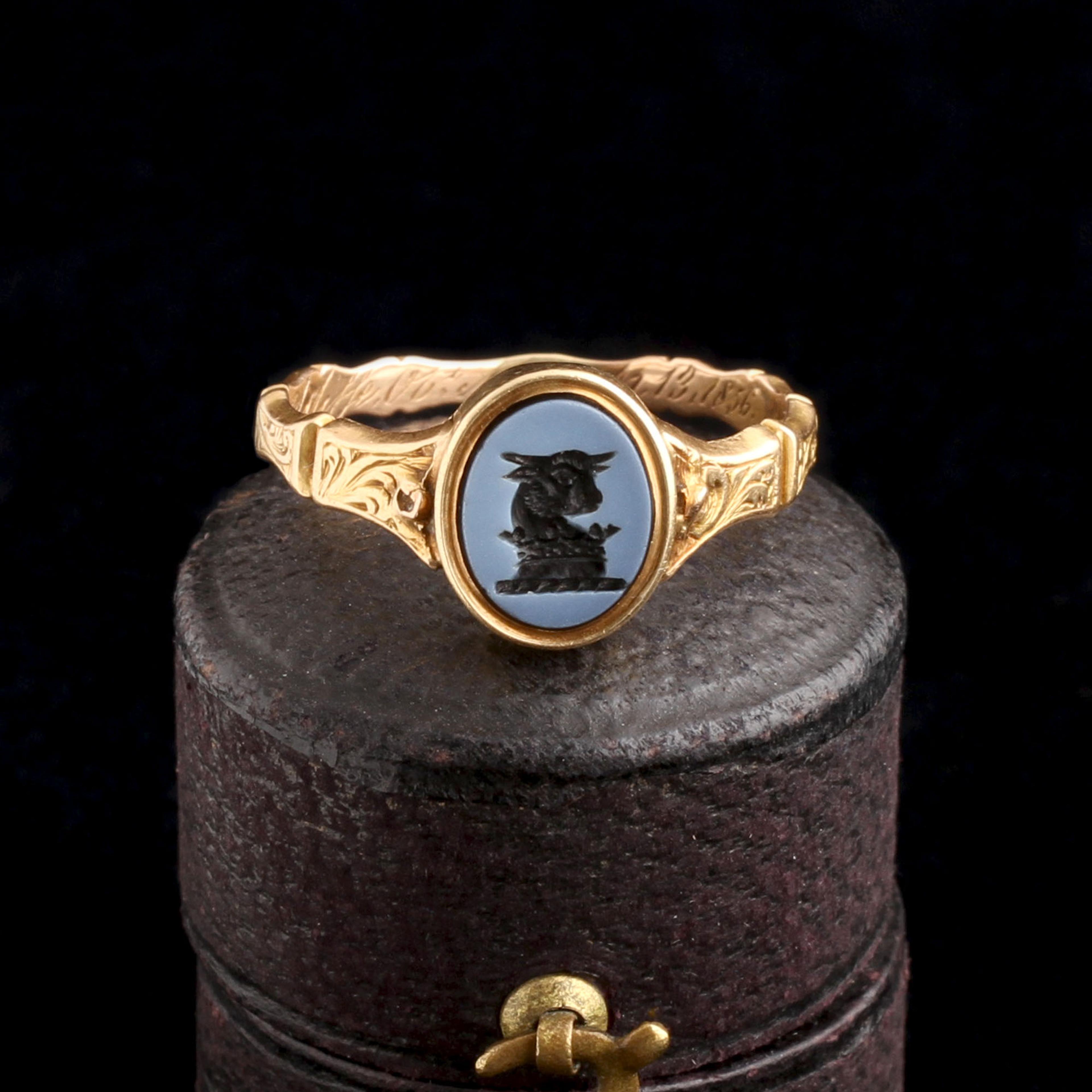 The petite intaglio is emblazoned with the Radcliffe family crest: a bull, young and gentle-looking. Inside the deeply carved band, the engraving memorializes Sarah Adshead Sidebottom Radcliffe who died on March 13, 1856 at age 24. Her grave still stands in Manchester, and reads: