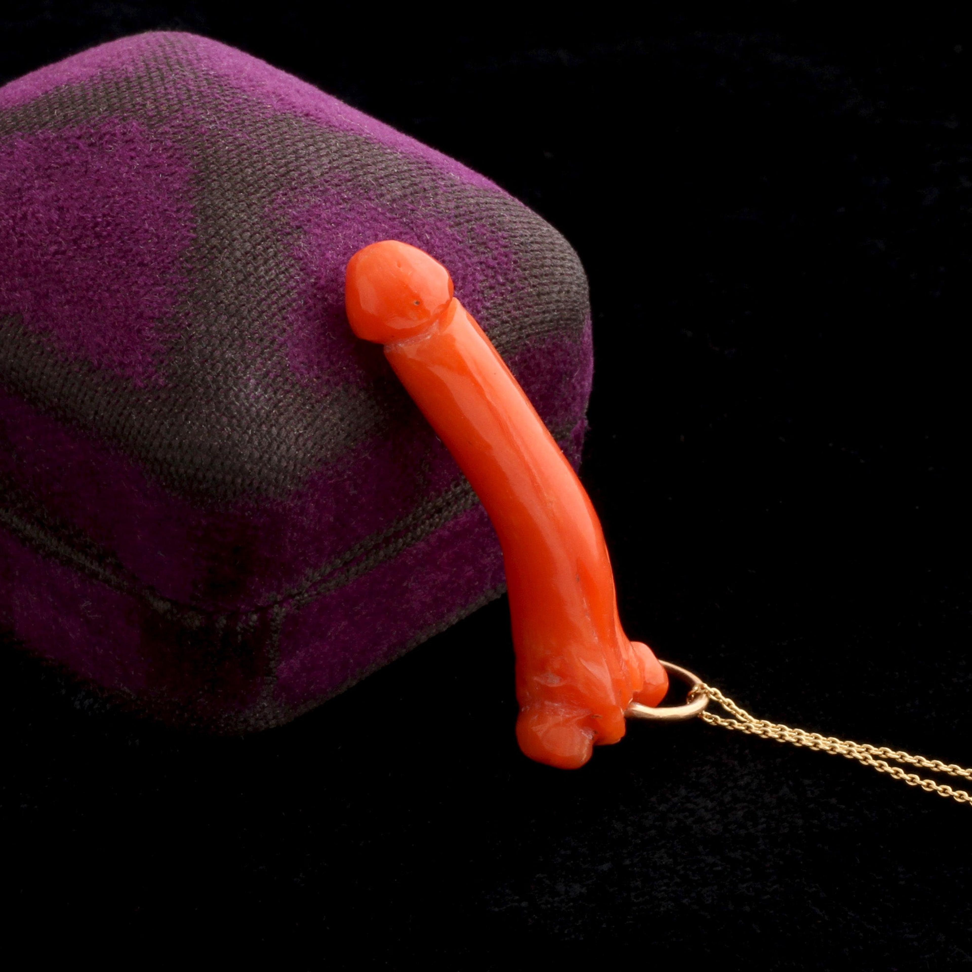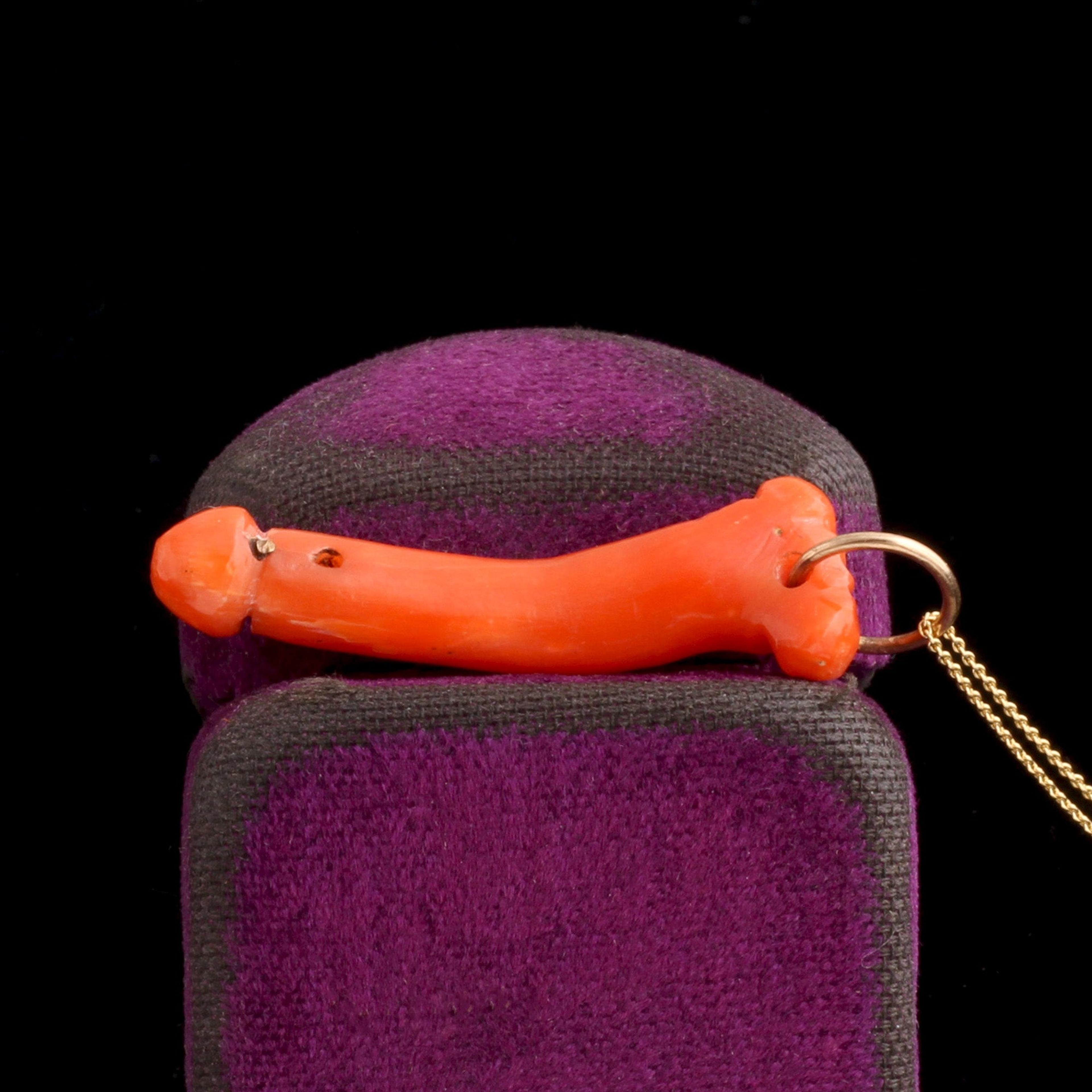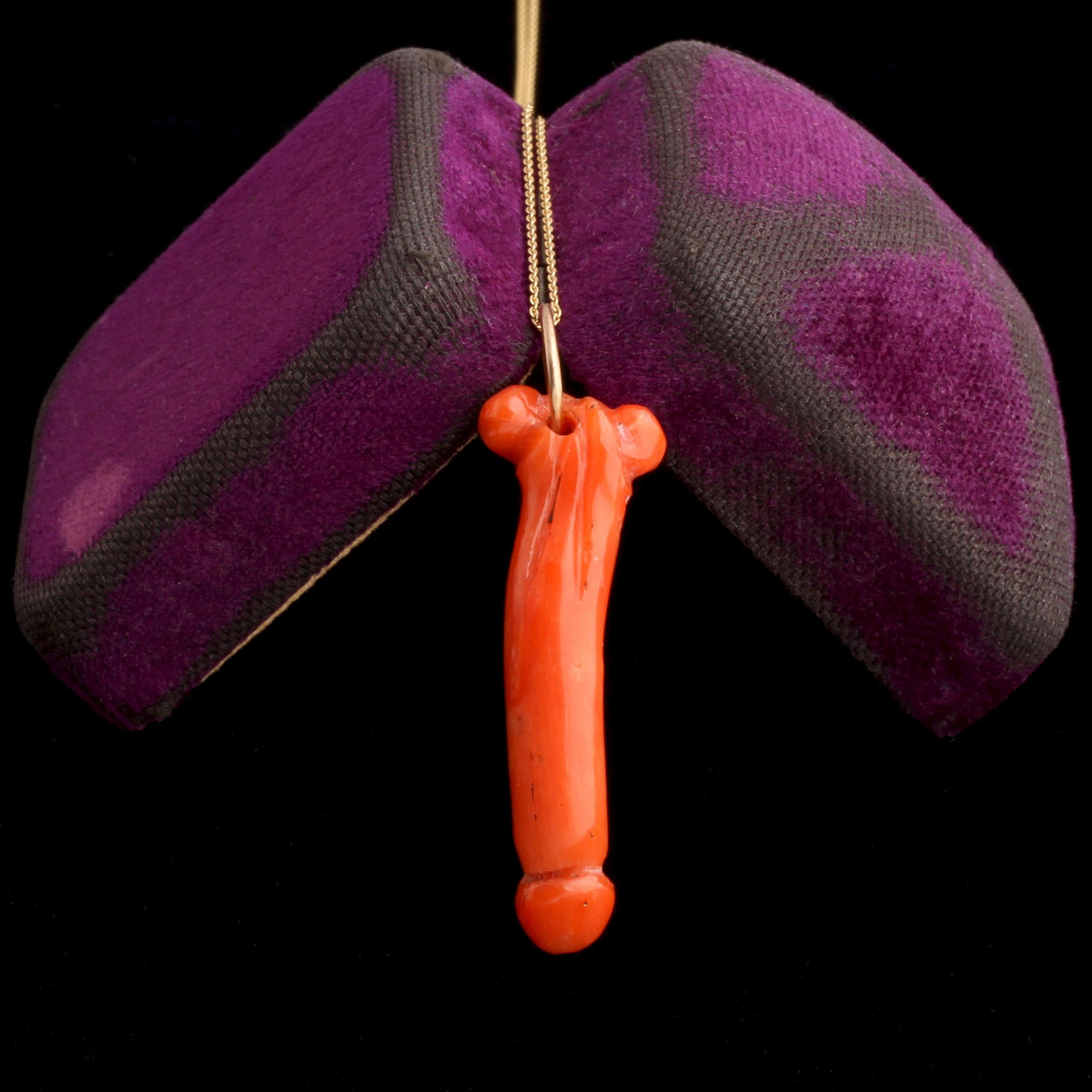 Ancient Romans believed the talismanic phallus would protect against evil. Whatever emotion seeing an erect phallus brings up was thought to distract and divert attention from evil at work. The phallic deity was called Fascinus, from fascinare, meaning “to cast a spell.” It's also the root of the English word fascinate. This mid 19th century phallus is carved in coral (which the Romans believed to have magical properties that protected the wearer from harm).