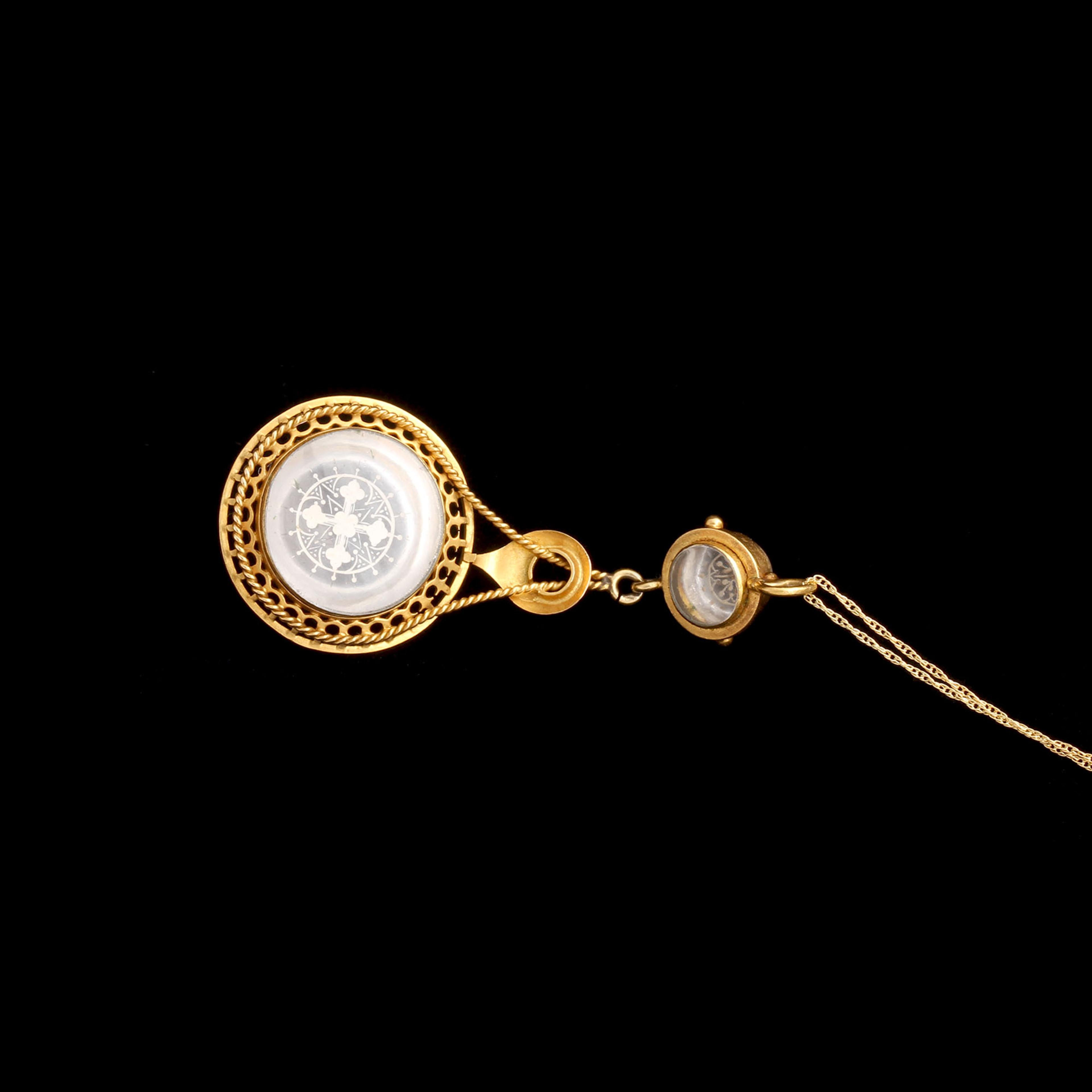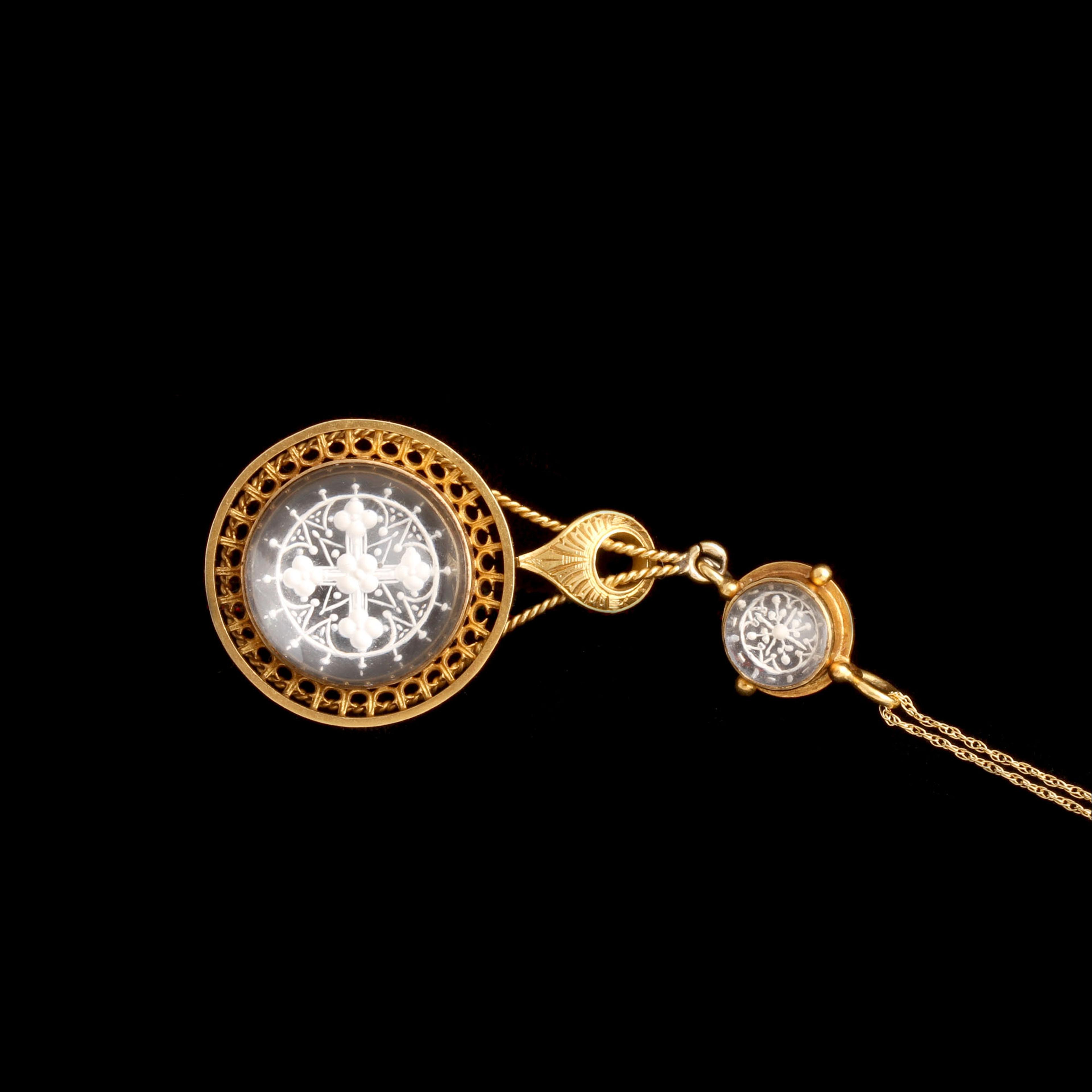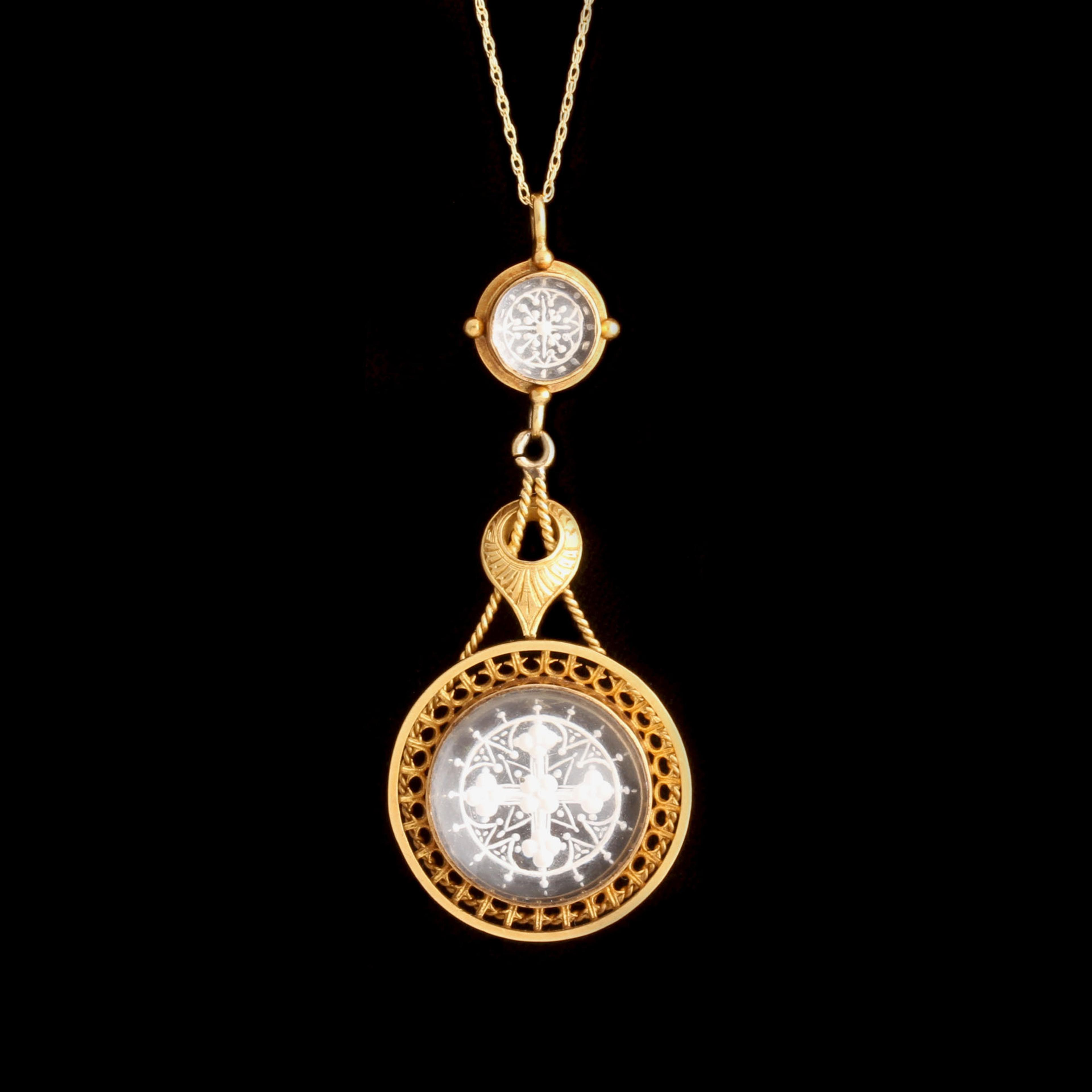 I've never seen anything like it - two intricate carvings in rock crystal, set into an elaborately textured gold mount. The Victorians were allergic to minimalism.