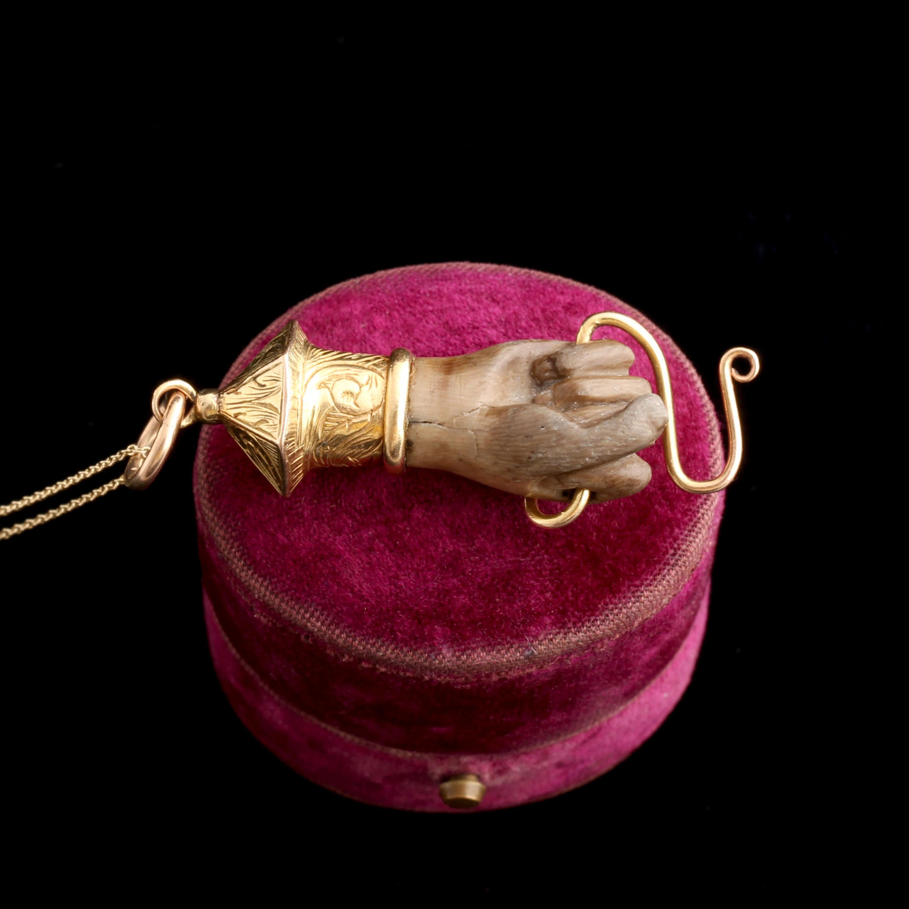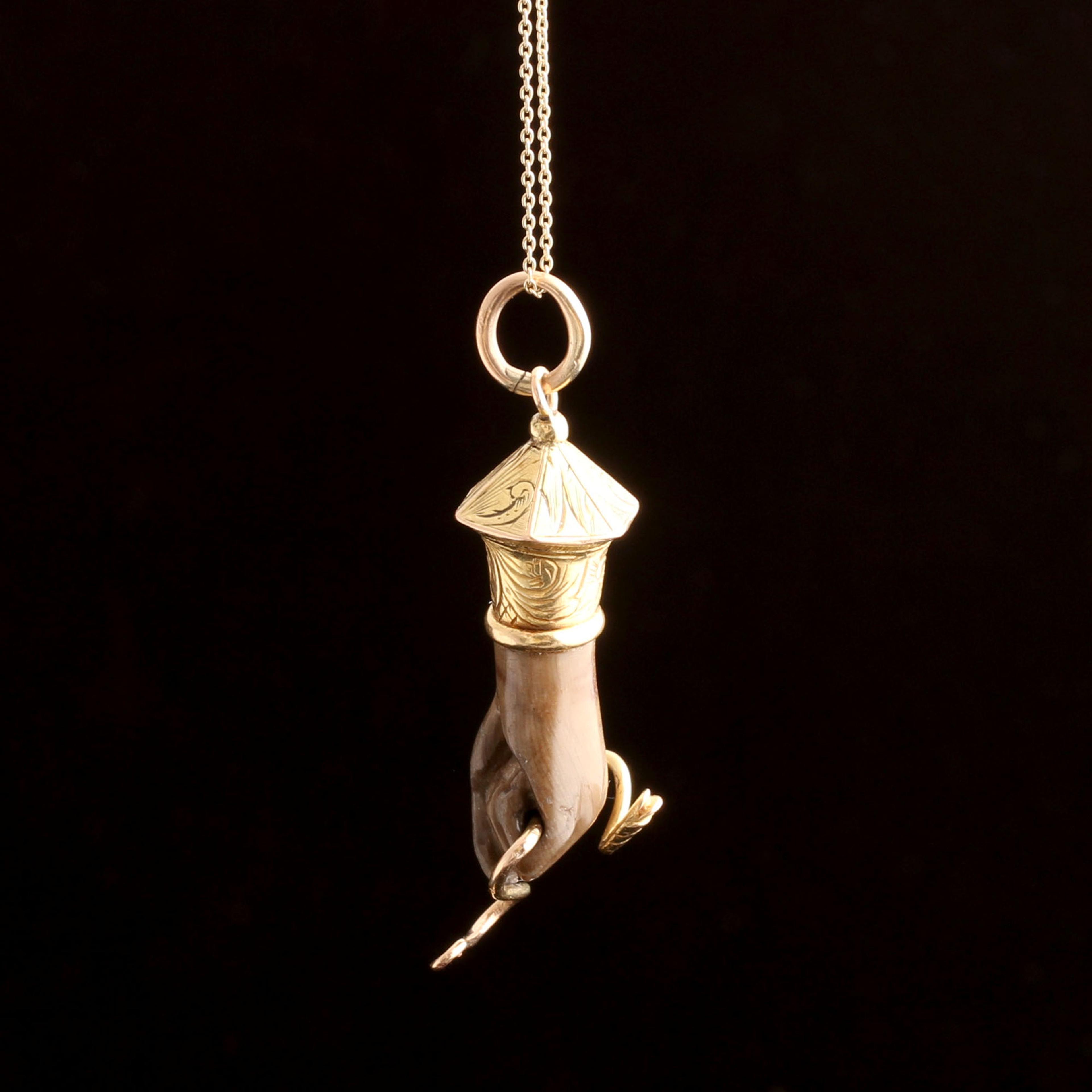 A meticulously carved horn hand grapples with a coiling serpent poised to strike. The fist is a symbol of power and control, while the snake represents both danger and renewal. Together, they form a potent talisman of strength confronting threat. The hand is mounted in engraved gold, its sleeve richly chased with detail. Despite fine age-related cracks in the horn, the carving remains crisp and full of movement—frozen at the height of its symbolic struggle.
