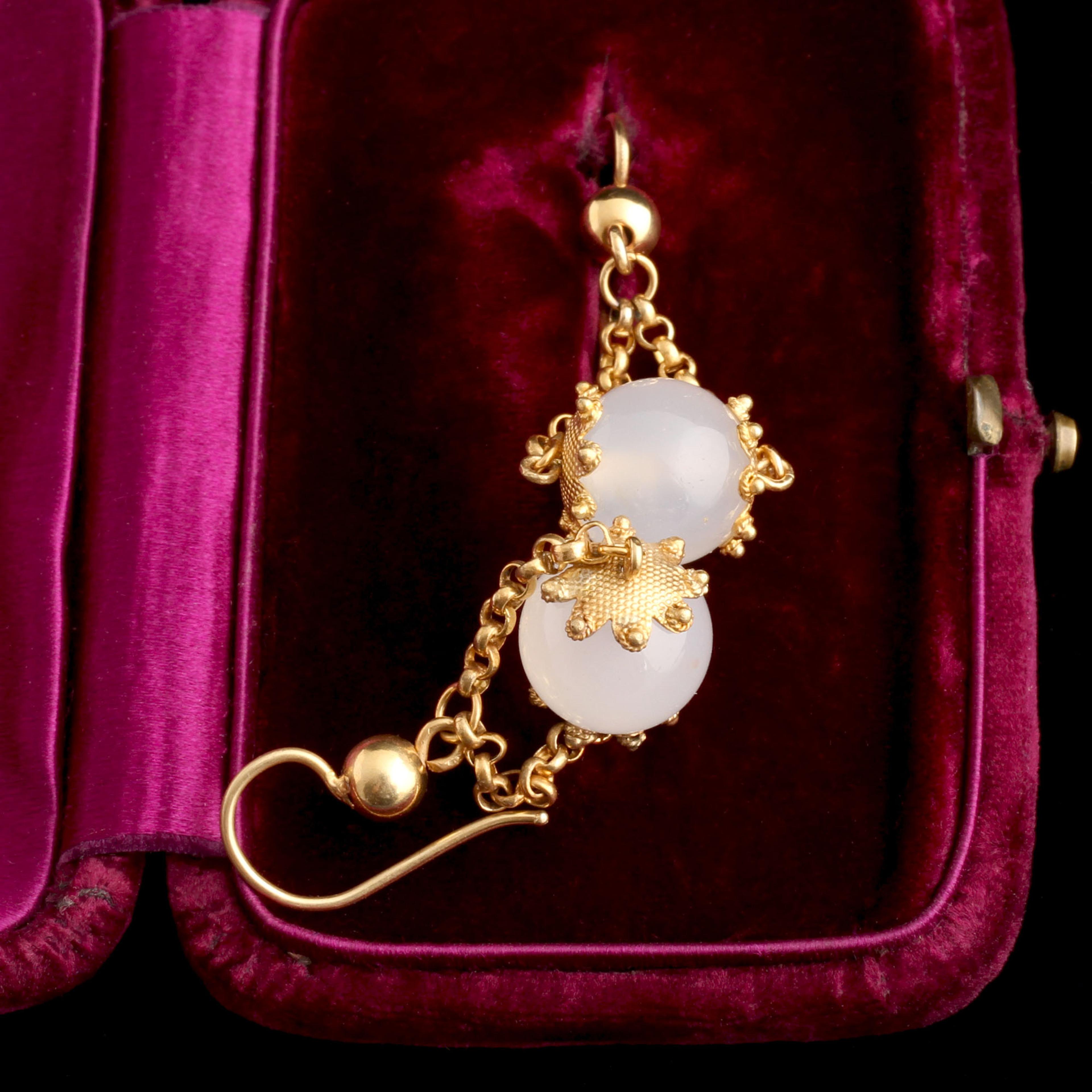 This milky white stone, chalcedony, is pronounced kal-SED-knee. Chrystoprase, carnelian, and agate are all colored varieties of the stone. Dreamy orbs are suspended in textured gold mounts.