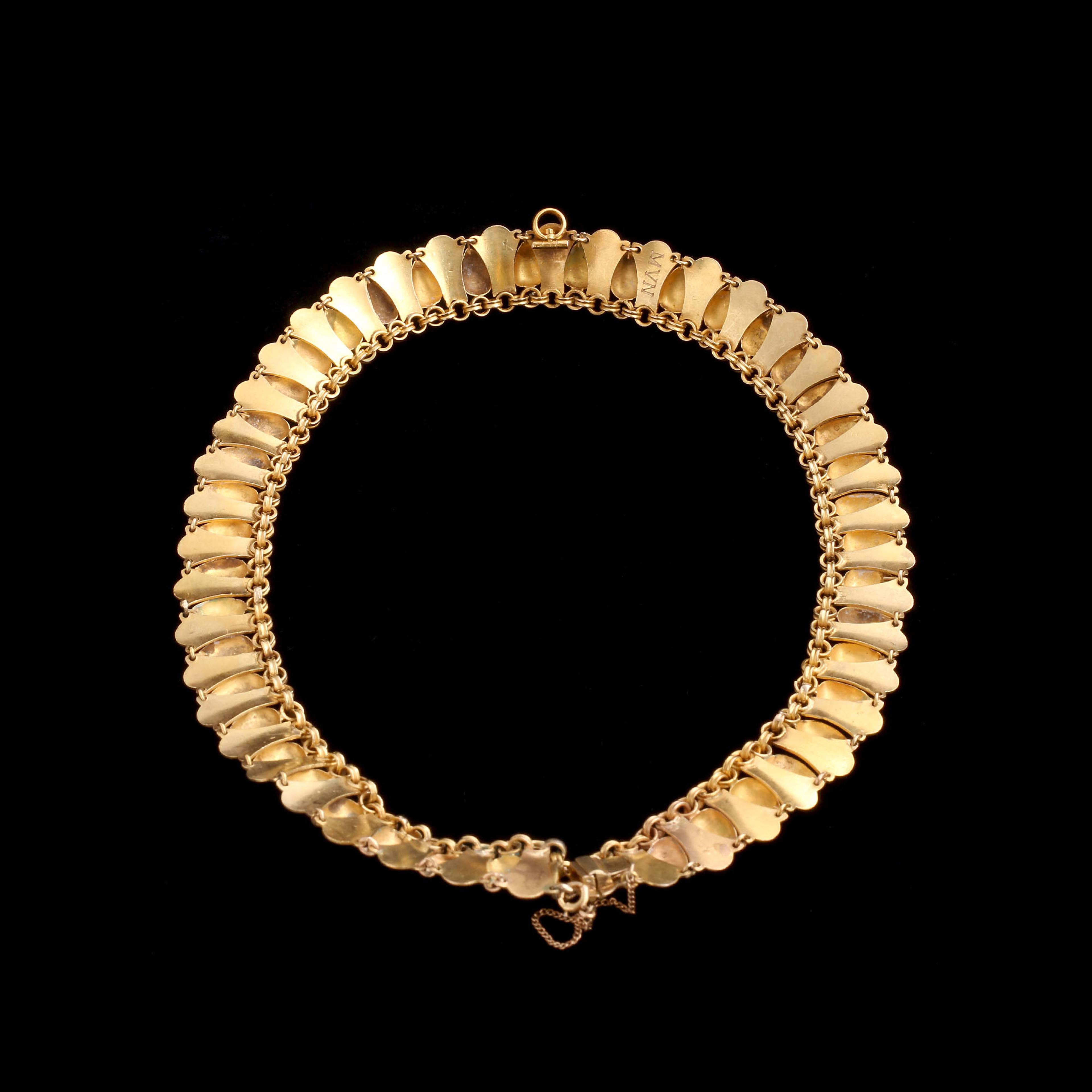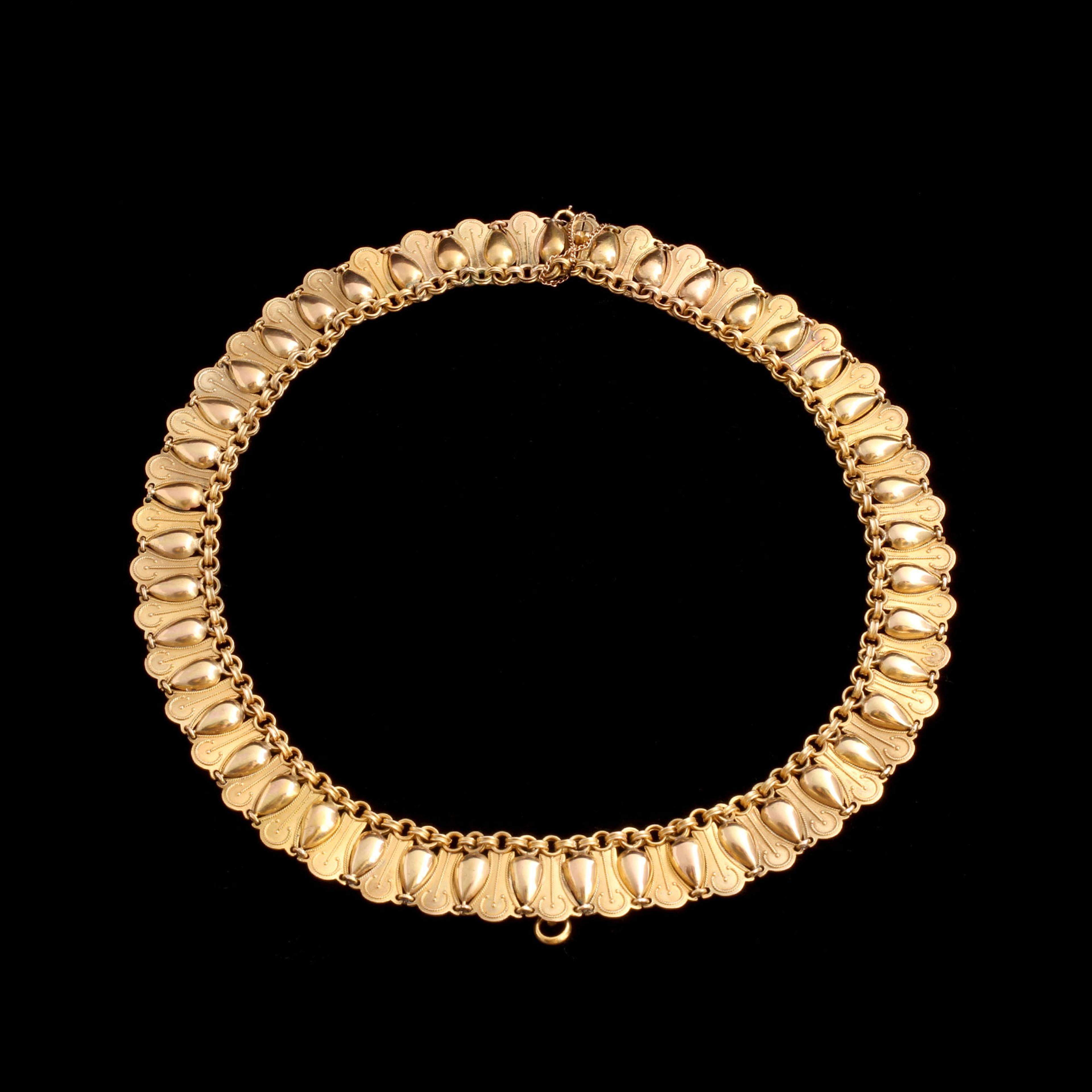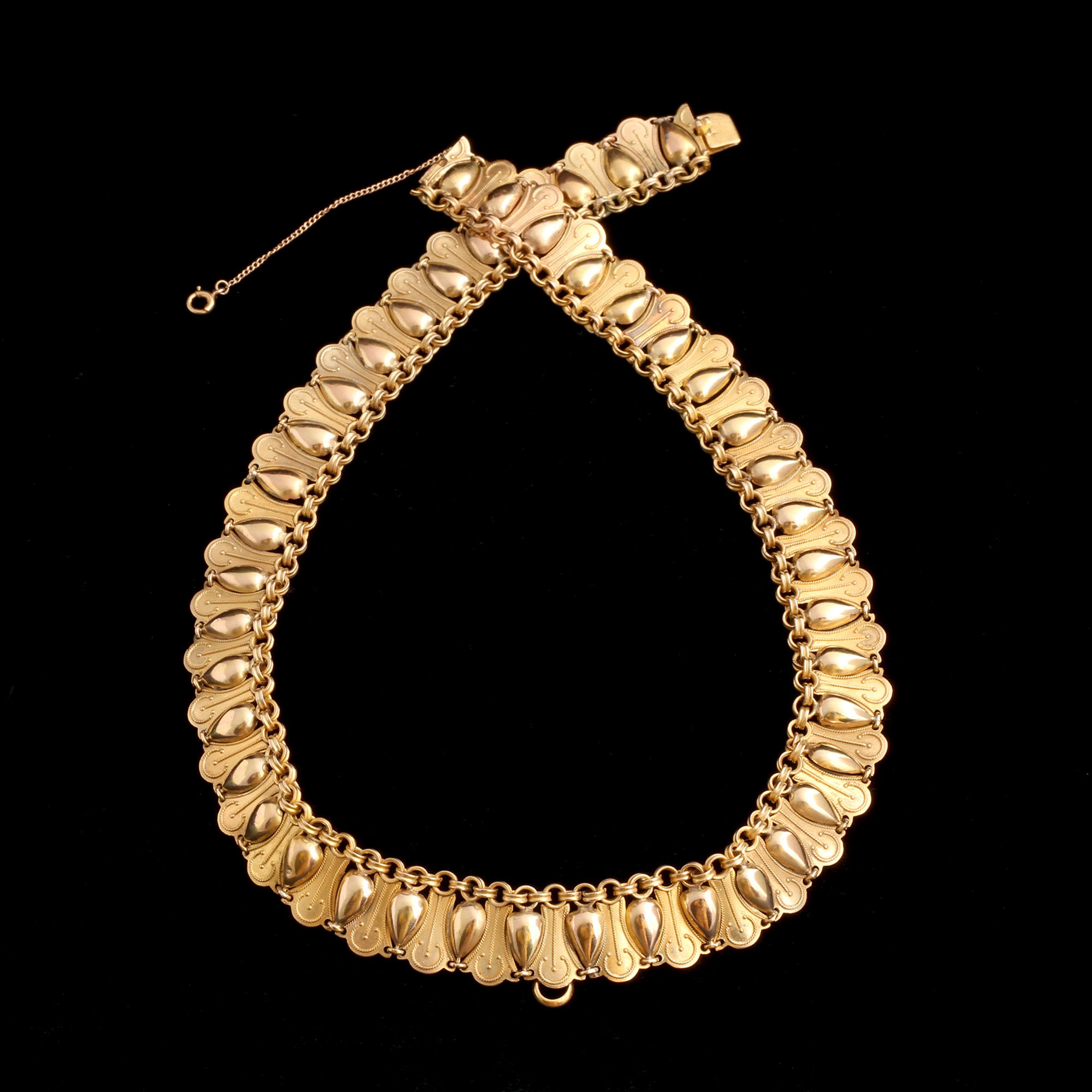They're called "Cleopatra collars" because during the 19th century Egyptian Revival craze, any reference to Ancient Egypt boosted sales. This necklace doesn't come from Egypt in any kind of archeological sense, but it echoes the broad ceremonial collars seen in Egyptian art, and more loosely, the fantasy of Cleopatra as Victorians imagined her. You, too, could be like the Egyptian queen: sensual, regal, theatrically feminine, and dripping in gold. The back is engraved with a tiny "MVN" and there's a hinged loop hidden at the front so you can add a pendant.