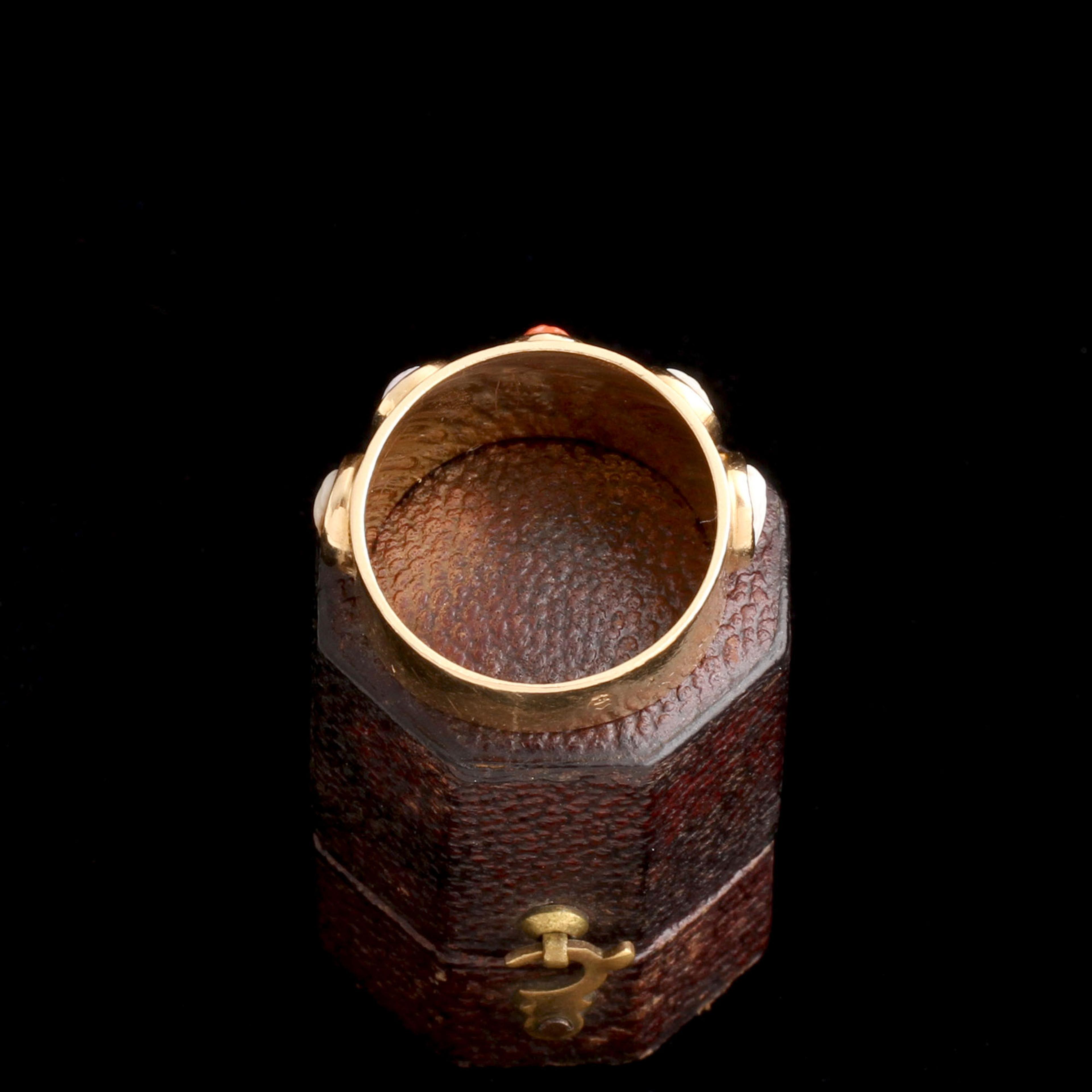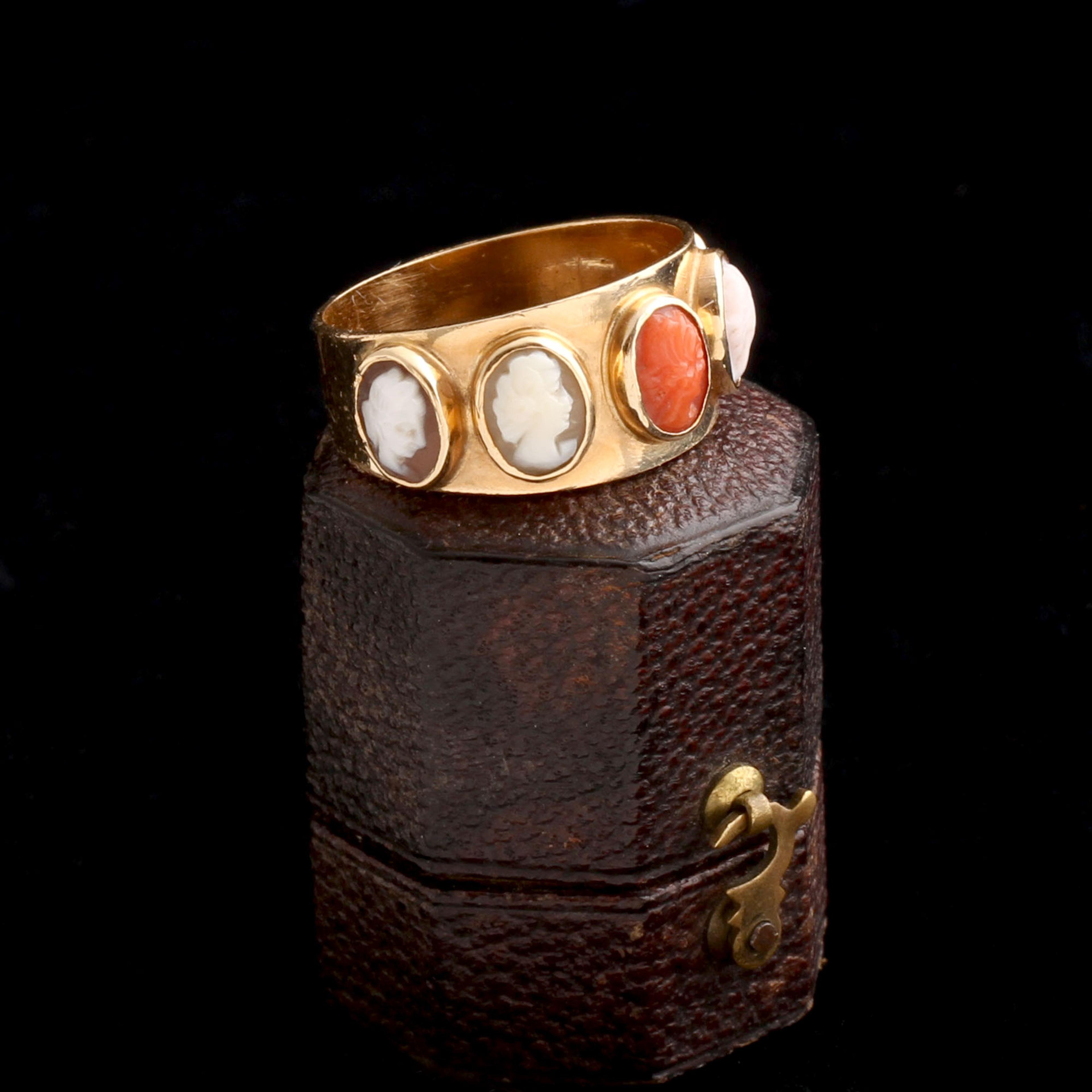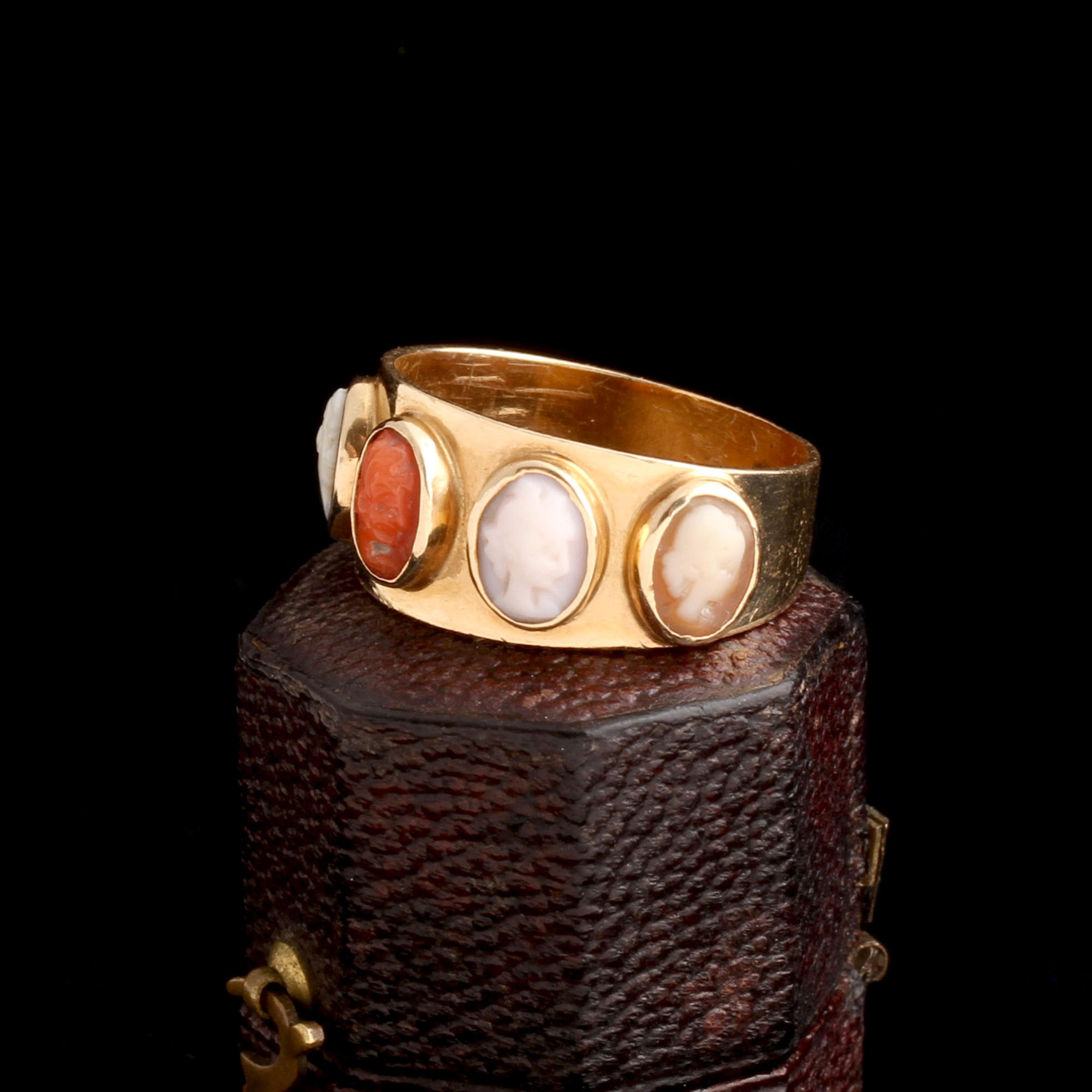 BY THE LATE 19th century, Neoclassicism had shifted from its earlier obsession with pinpointing gods and heroes to a more aesthetic, generalized take on antiquity. This ring—c. 1880—features carved cameos in coral, shell, and onyx, but instead of clearly identifiable deities like Apollo or Diana, we see idealized classical faces. Why the vagueness? Part of it was fashion fatigue—by 1880, classical motifs had been circulating for decades. The goal was no longer to show off your knowledge of mythology but to signal taste, refinement, and a connection to the distant past in a broader, less literal way. The industrial revolution had also changed everything: mass production made classical designs more accessible, and not every buyer cared to know who was on their ring. These cameos were about style, not scholarship: Neoclassicism for a new, expanding middle class.