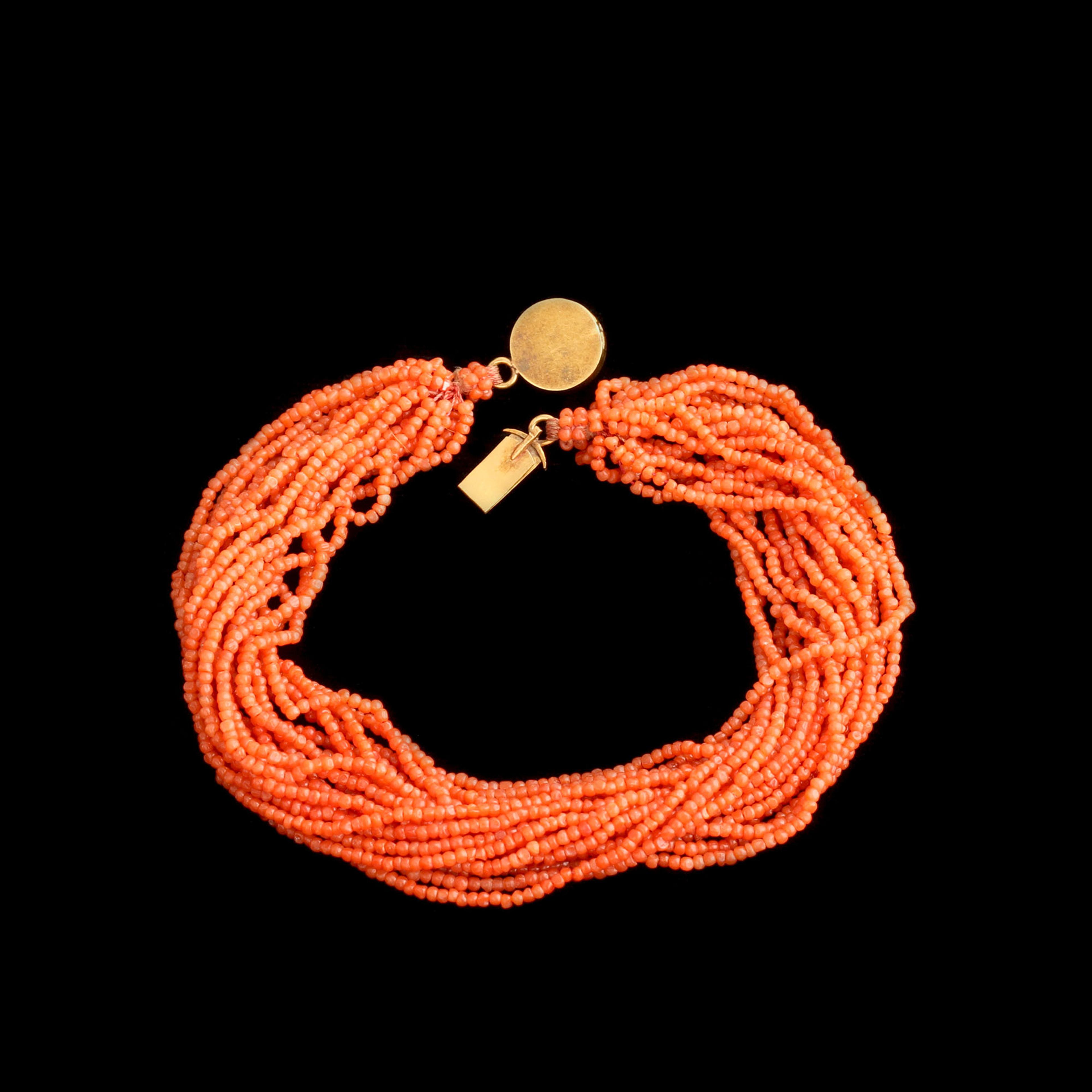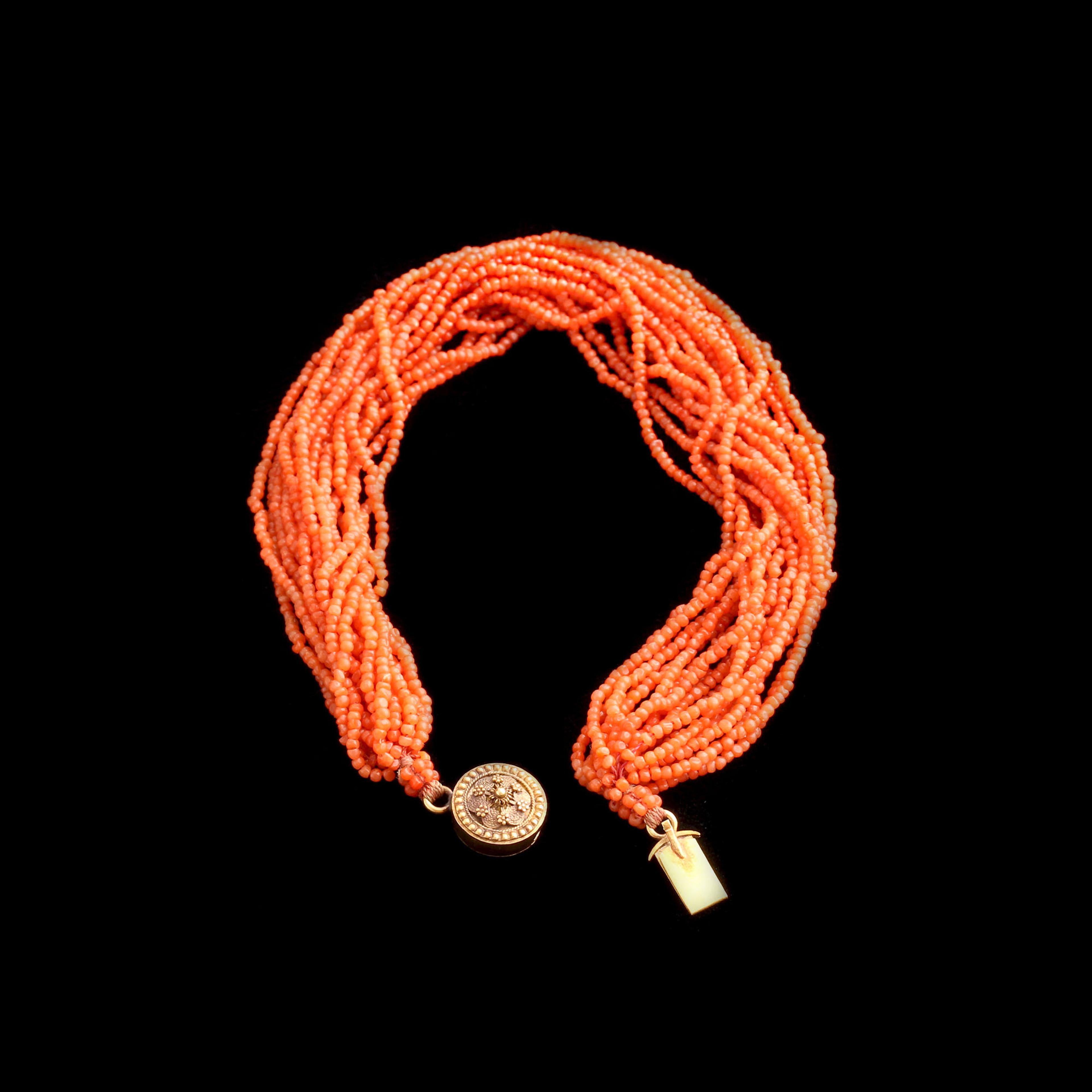 Countless strands of micro-miniature coral beads come together with an Etruscan Revival gold clasp. A souvenir from someone's Italian leg of the Grand Tour.