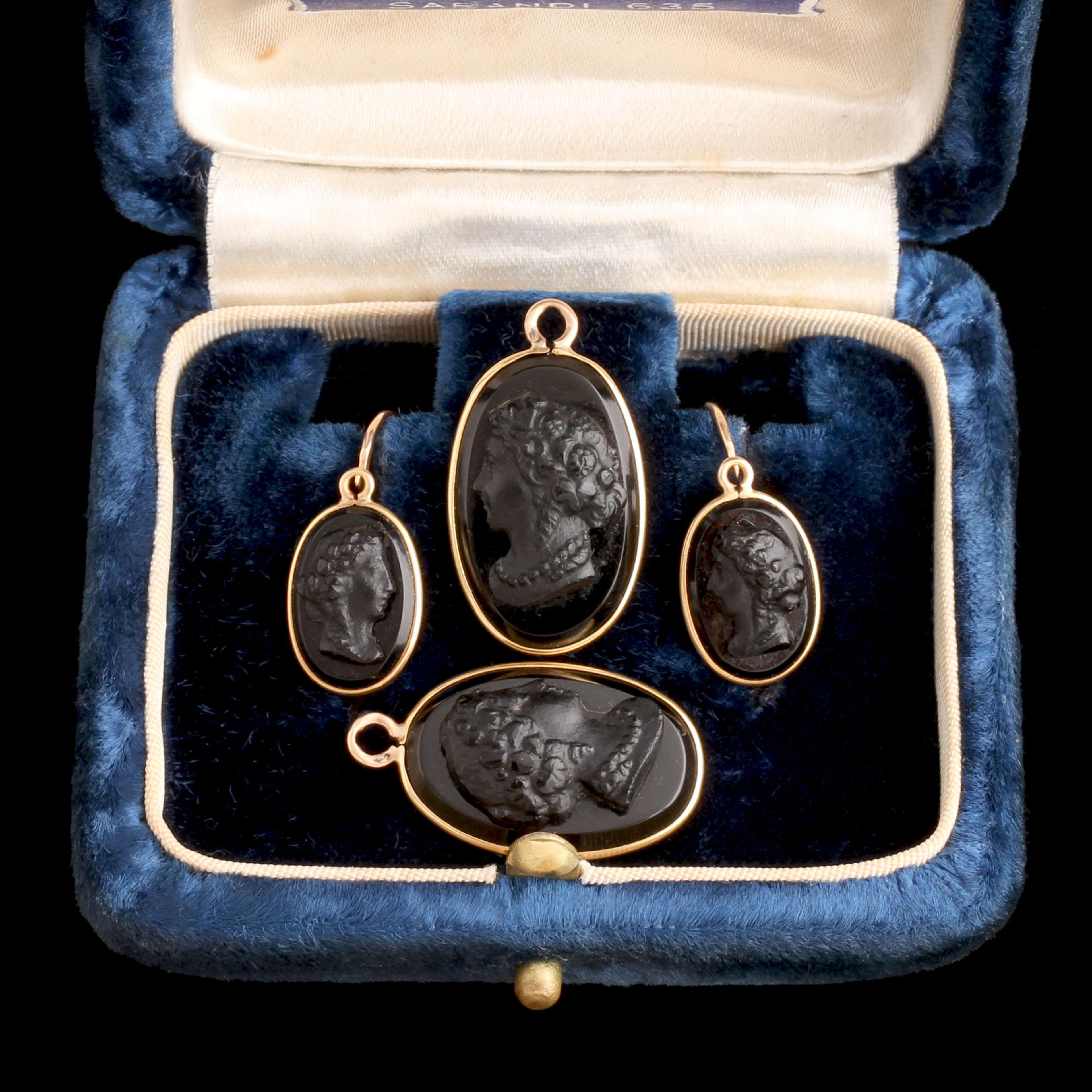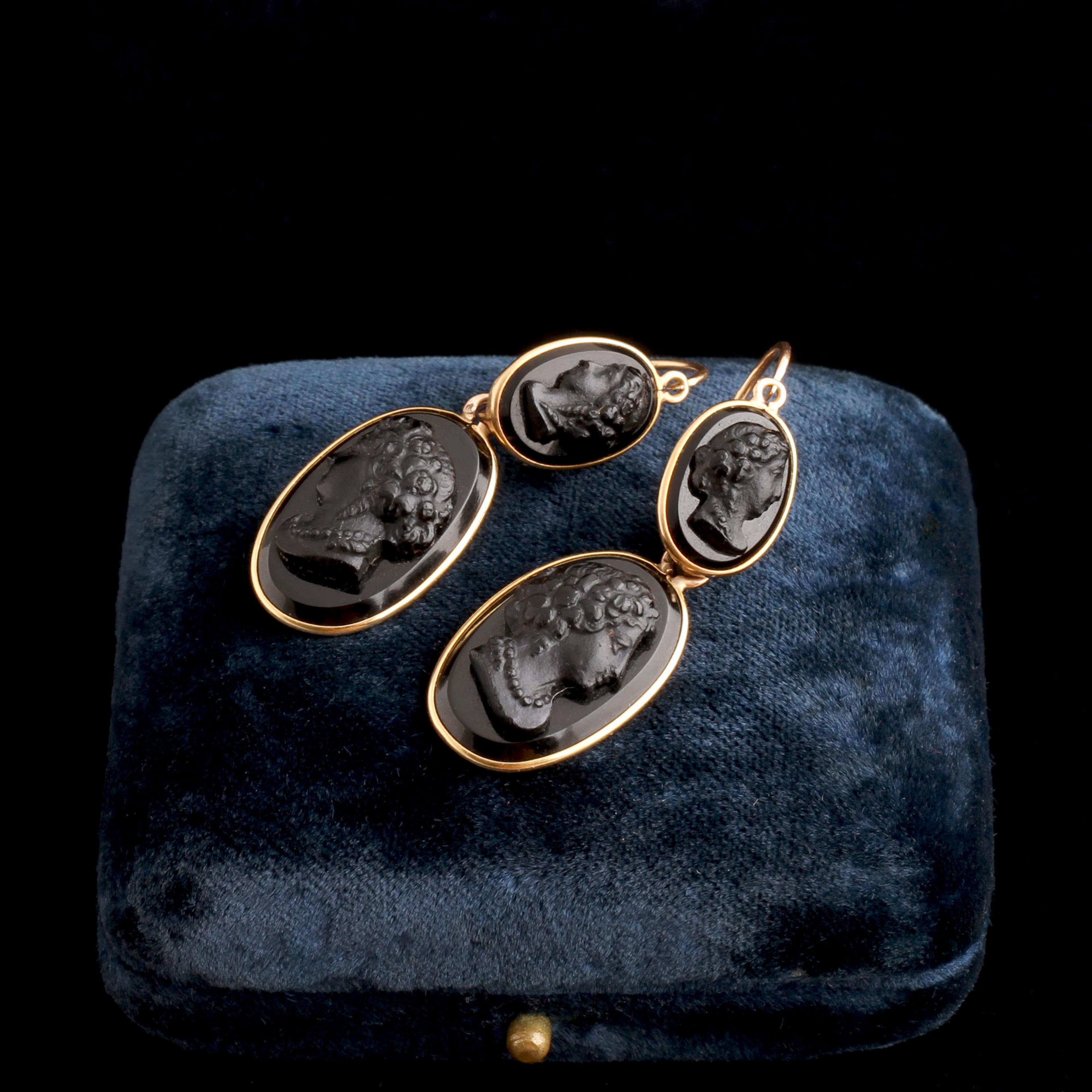 These are classic Victorian day-to-night earrings, designed to be worn two ways. During daytime, the upper cameo alone could be worn as a shorter, lighter drop. In the evening, the lower pendant section was added, creating a longer and more formal silhouette. In the 19th century, women typically owned fewer pieces of jewelry, so adaptability mattered. Pressed glass cameos offered crisp classical profiles at a more accessible price point, while still referencing the hardstone carved cameos favored at the height of Neoclassicism.