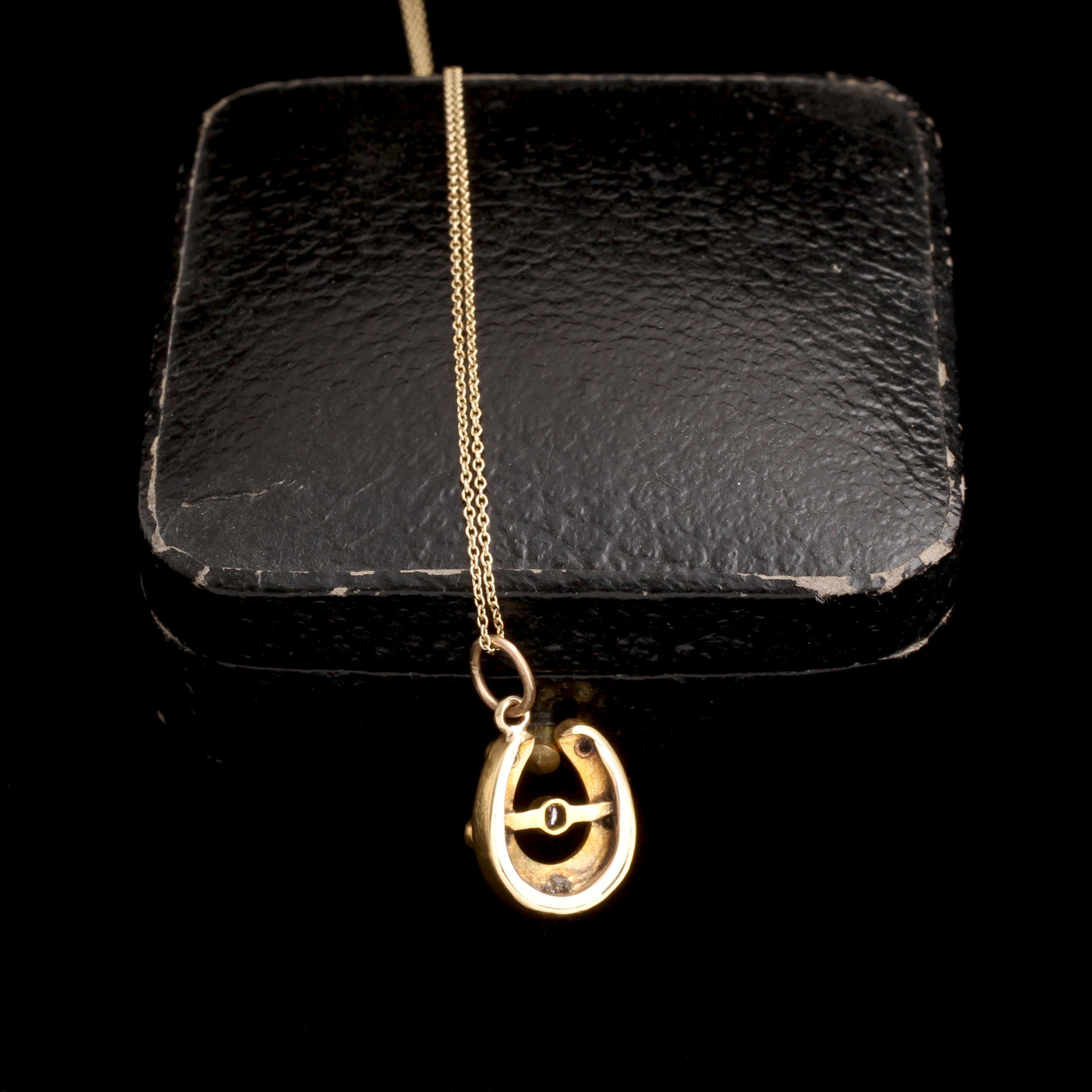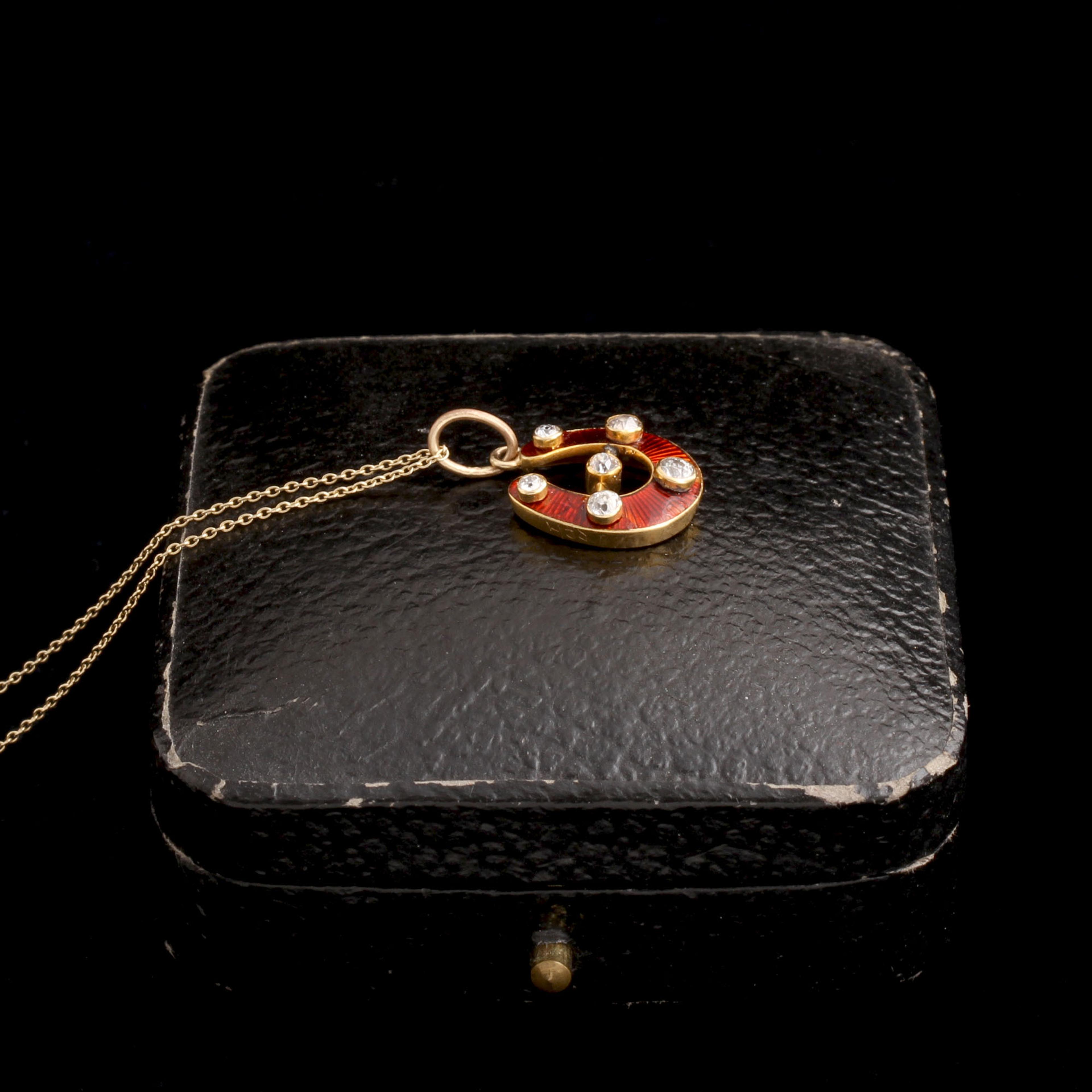 HUMANS HAVE CARRIED and worn lucky charms forever. Although the 19th and 20th centuries were thought to be ages of reason and science (and definitely not superstition) people still kept horseshoes close, just in case. Iron was believed to guard against trouble, so full-size shoes were nailed above doorways. The crescent shape also reached back to much older, pre-Christian lunar goddesses of protection. Here, sunset-colored enamel contrasts with seven old cut diamonds graduated in size.