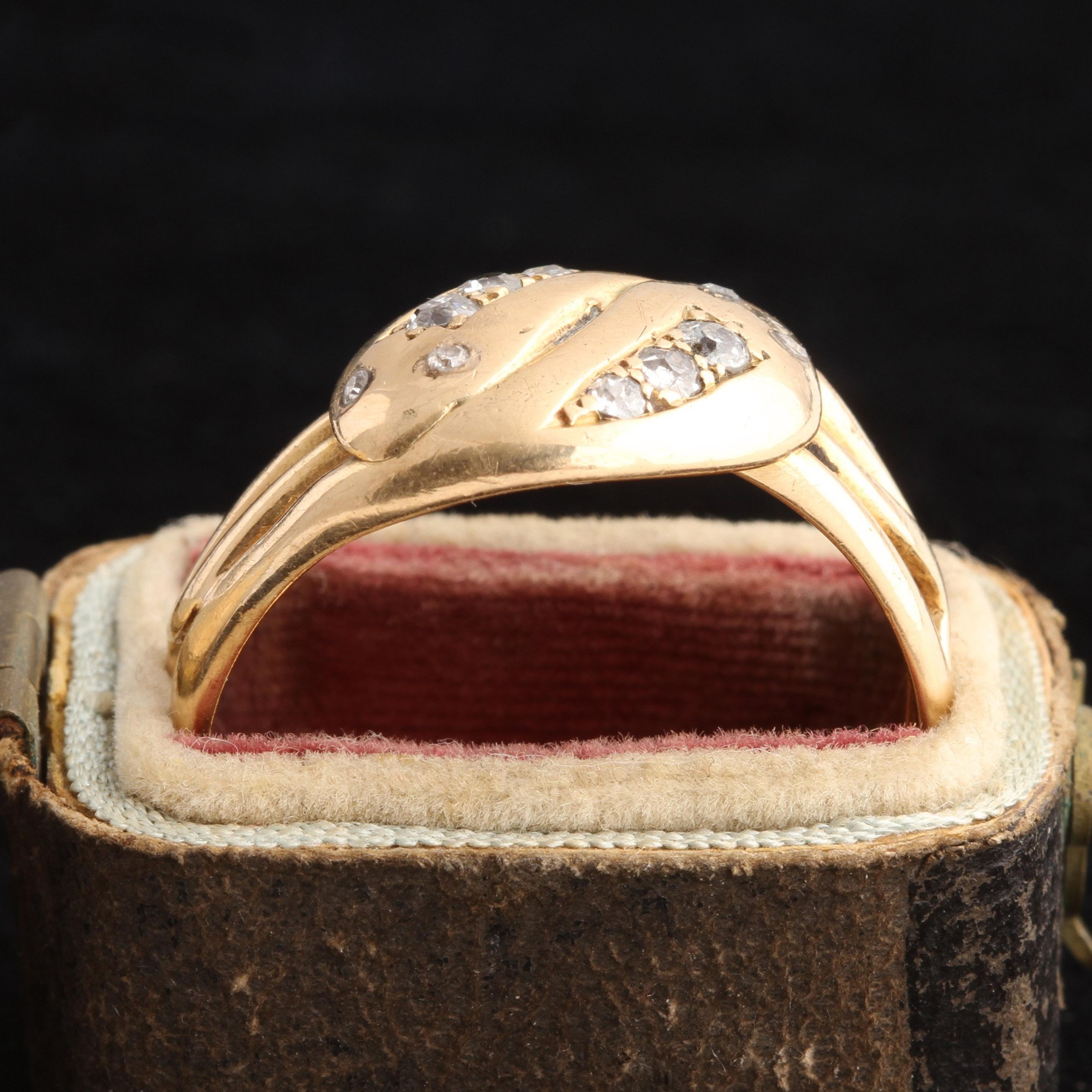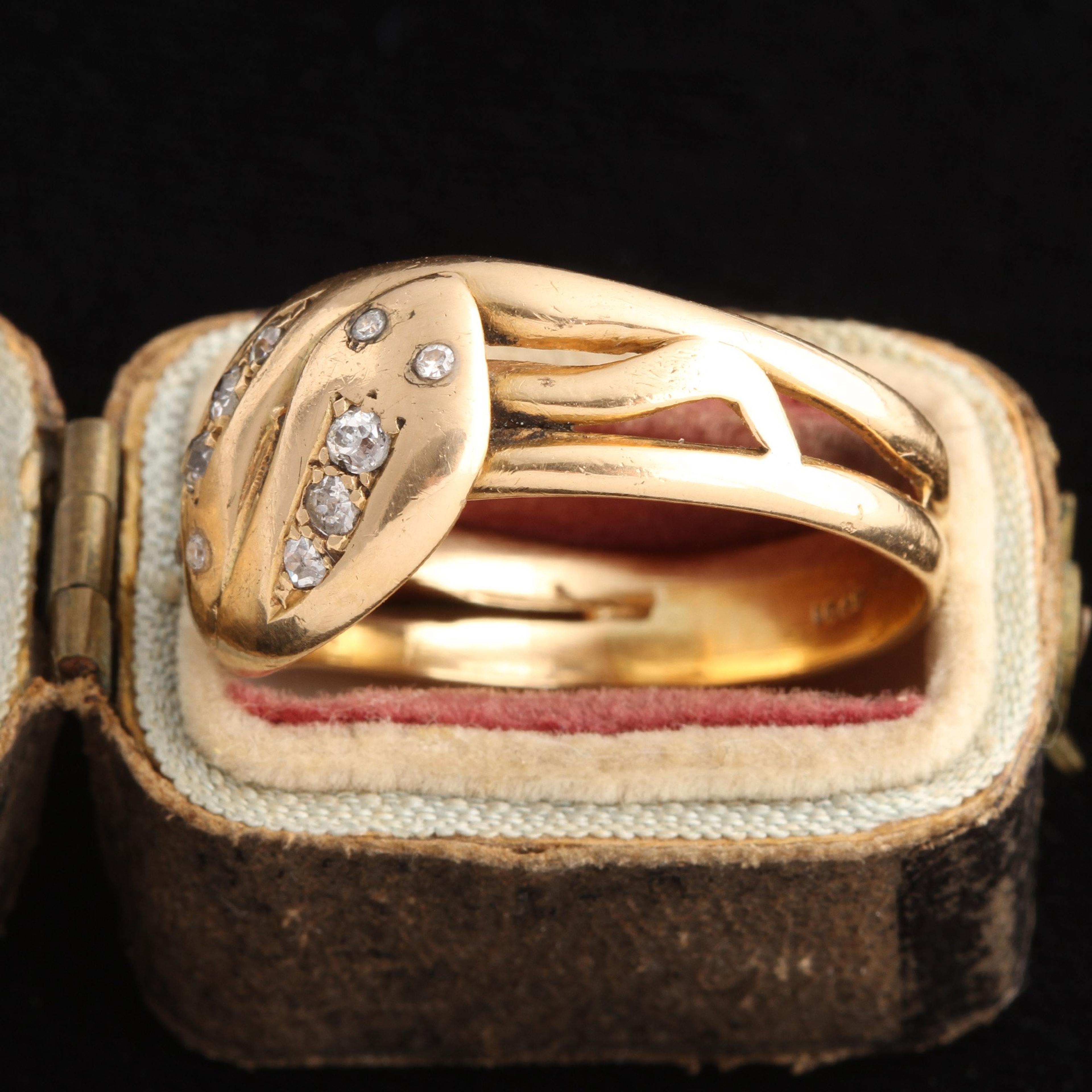 The Ancient Egyptians used the serpent to denote royalty, the Romans employed it as representation of everlasting love, Hindus regard the snake as a symbol of desire. In more recent history, Prince Albert proposed to Queen Victoria with a snake ring set with an emerald. The queen set the bar for fashion in this period and, owing largely to Victoria's ring, serpent-themed jewelry was incredibly popular throughout the second half of the 19th century. Two diamond-studded snakes form this large 18k ring, their entwined bodies symbolize an eternal life together.