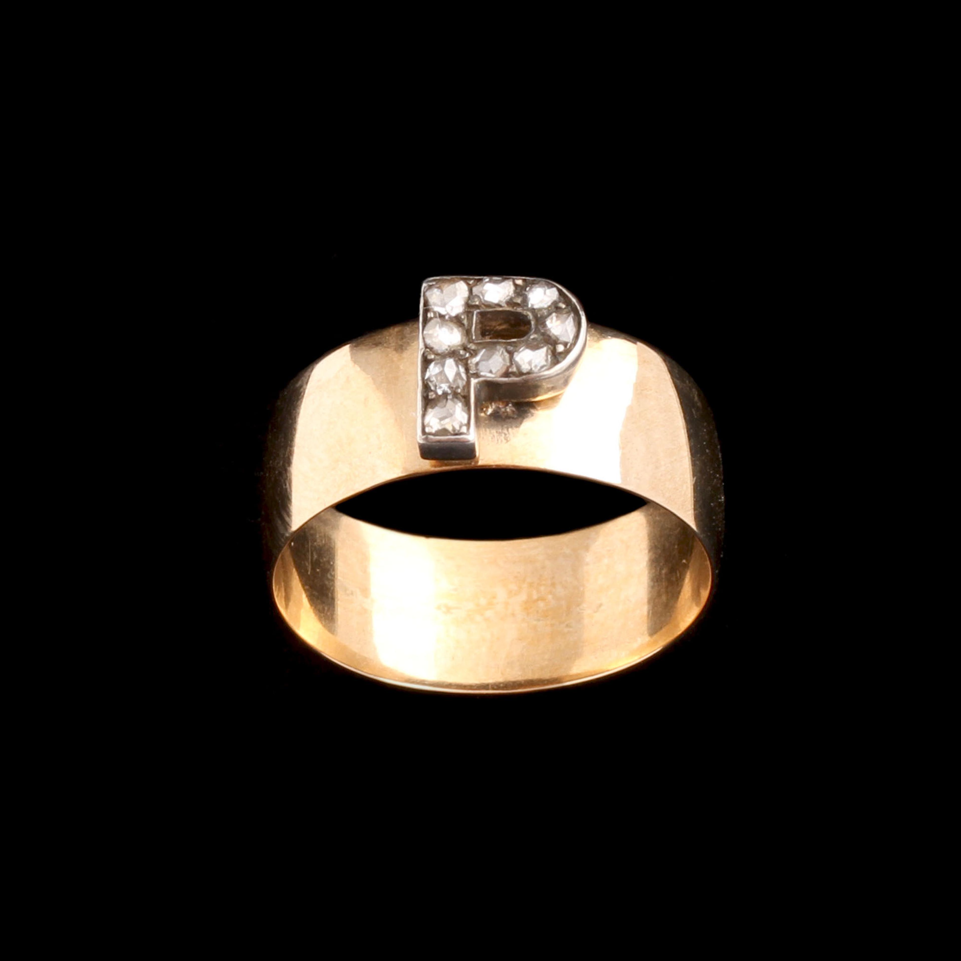 ONCE UPON A TIME, probably in the 1880s, this rose cut diamond-studded "P" topped a stickpin. Fast forward 100 years and it's 1988. Women's hair is even BIGGER than it was in the Victorian era. The jewelry is big, too. A chubby, wide band is made, and the P sits atop it perfectly. A Frankenstein piece that works just right.