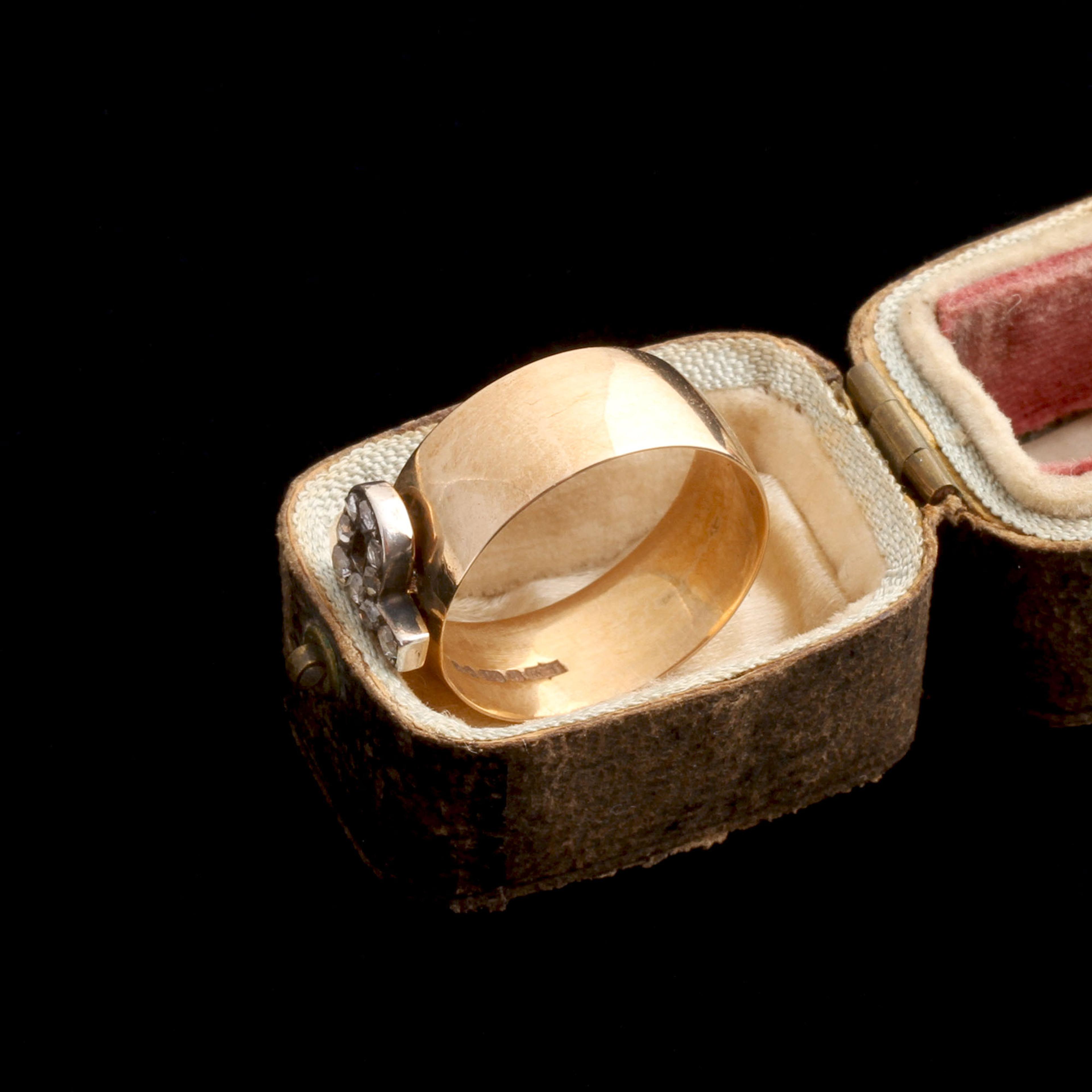 9k gold (marked), silver, 9 1.5mm rose cut diamonds