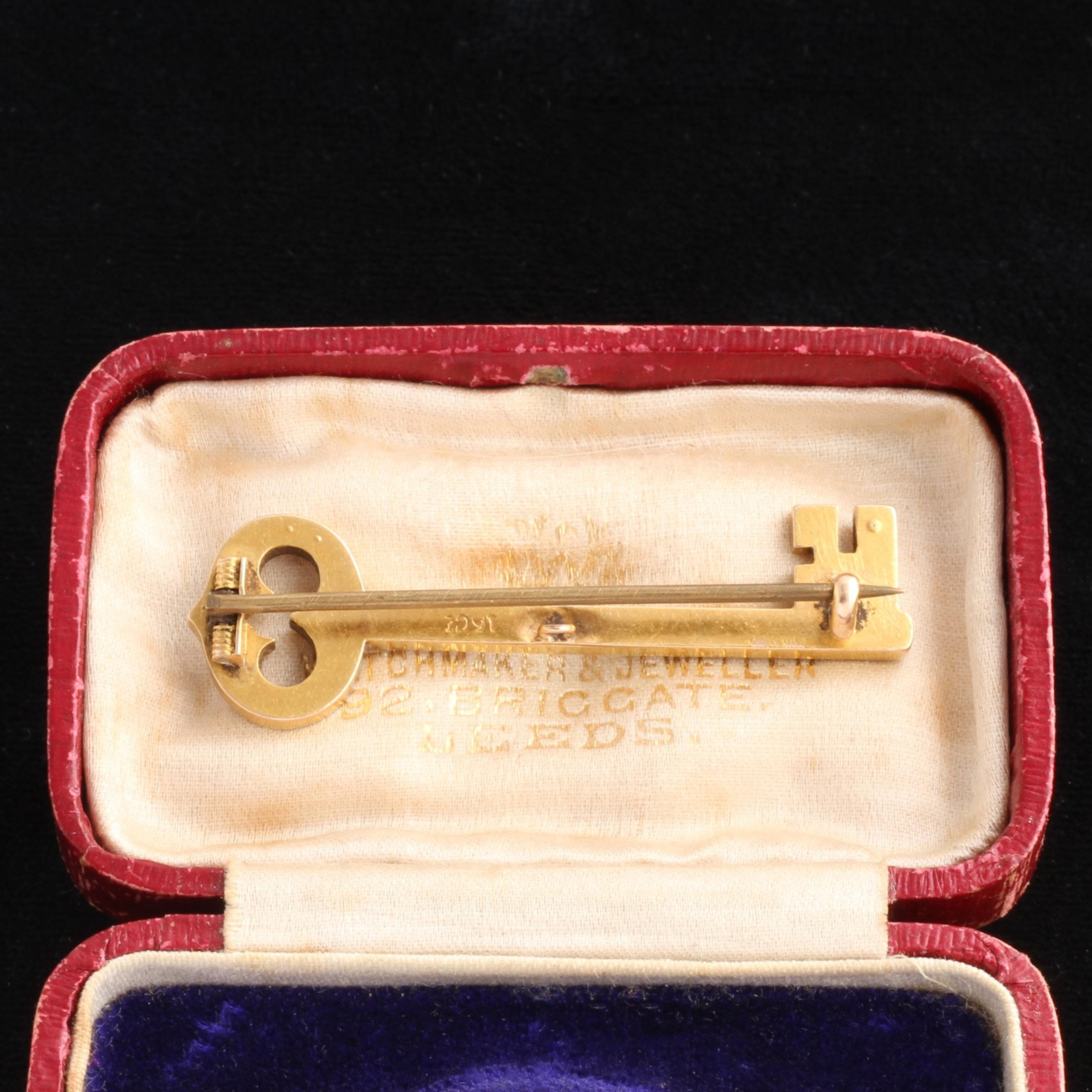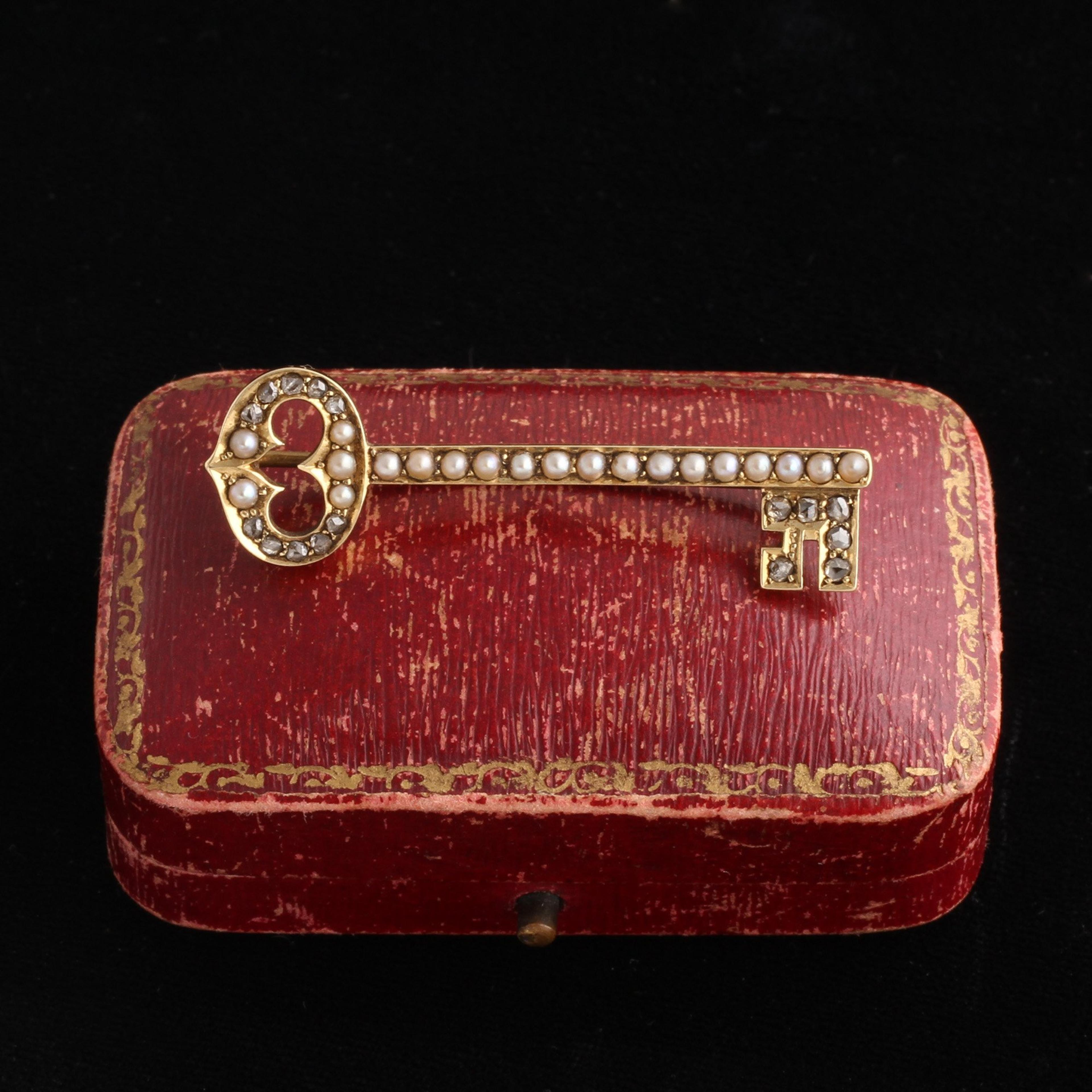A near pristine Victorian gold brooch modeled in the shape of a key and set with seed pearls and rose cut diamonds. Comes in its original box.