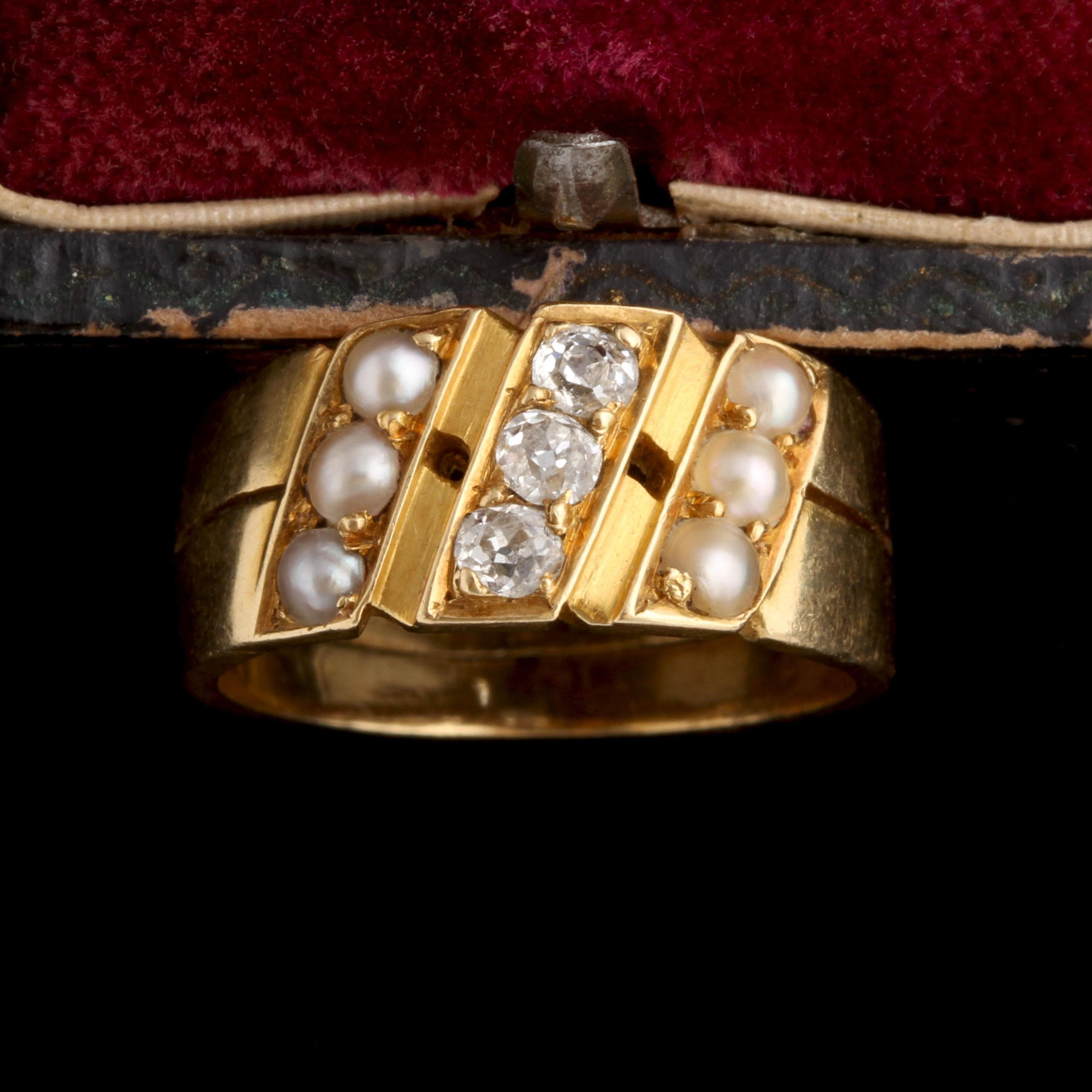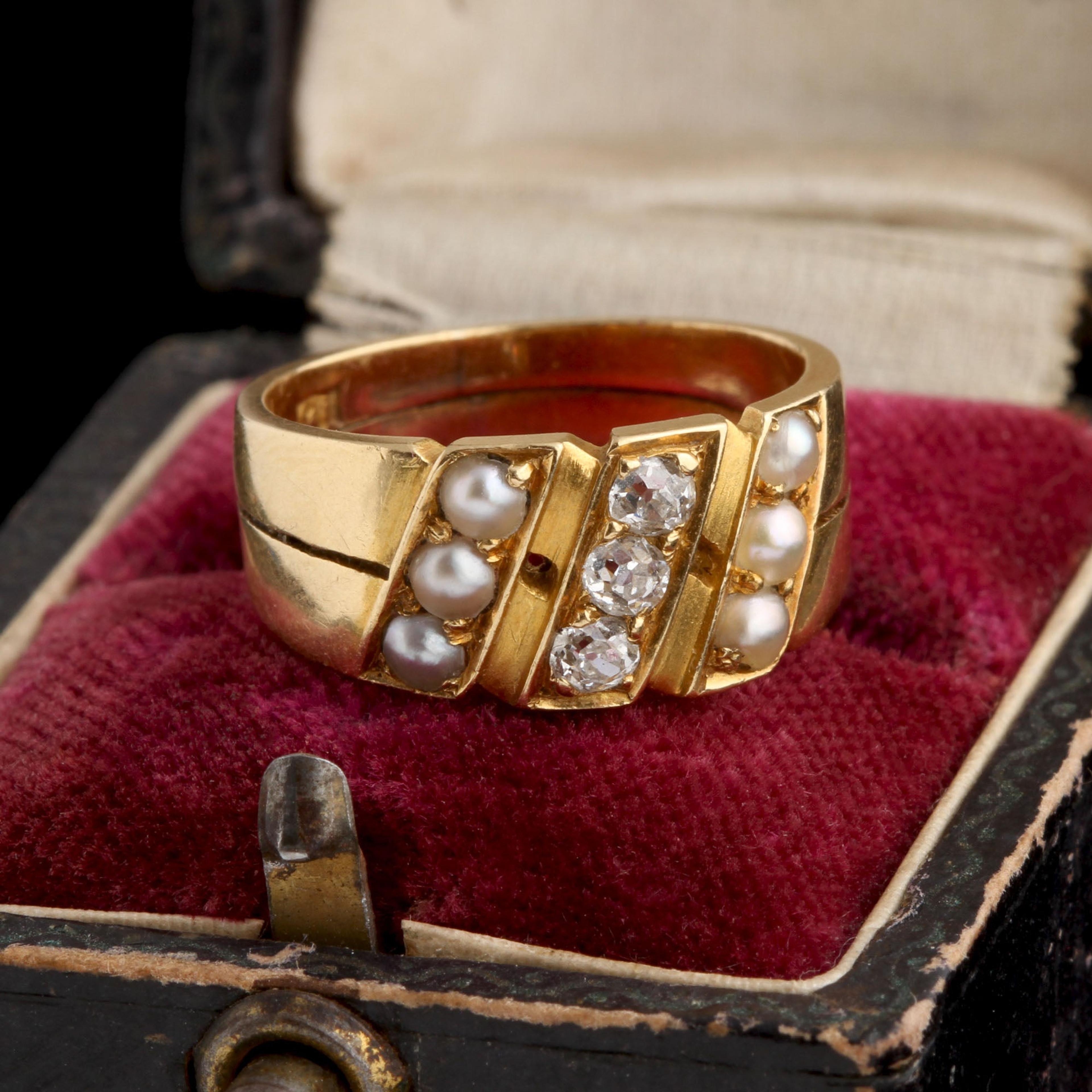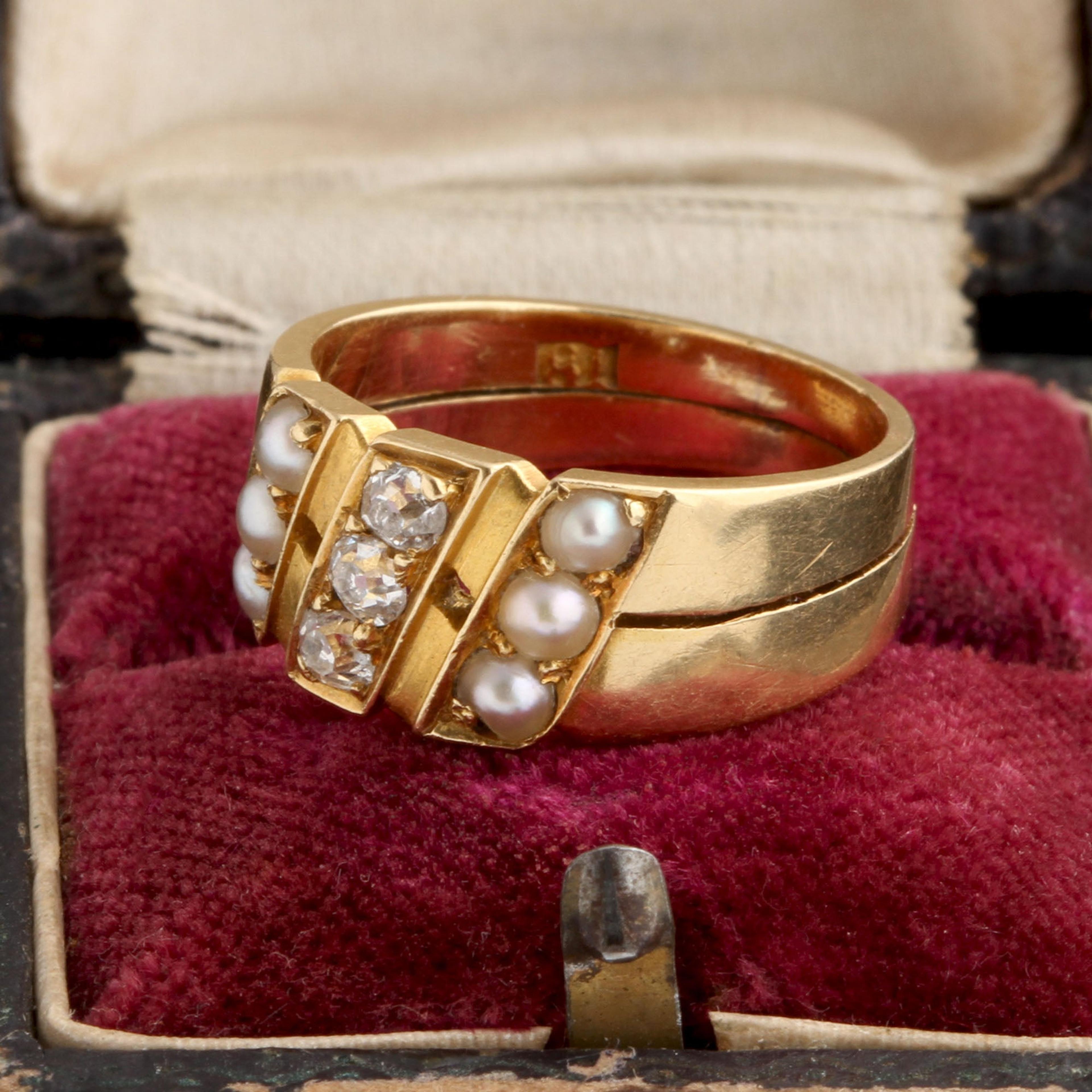 18k gold (marked), 6 2.2mm seed pearls, 3 approximately. 07ct old European cut diamonds
