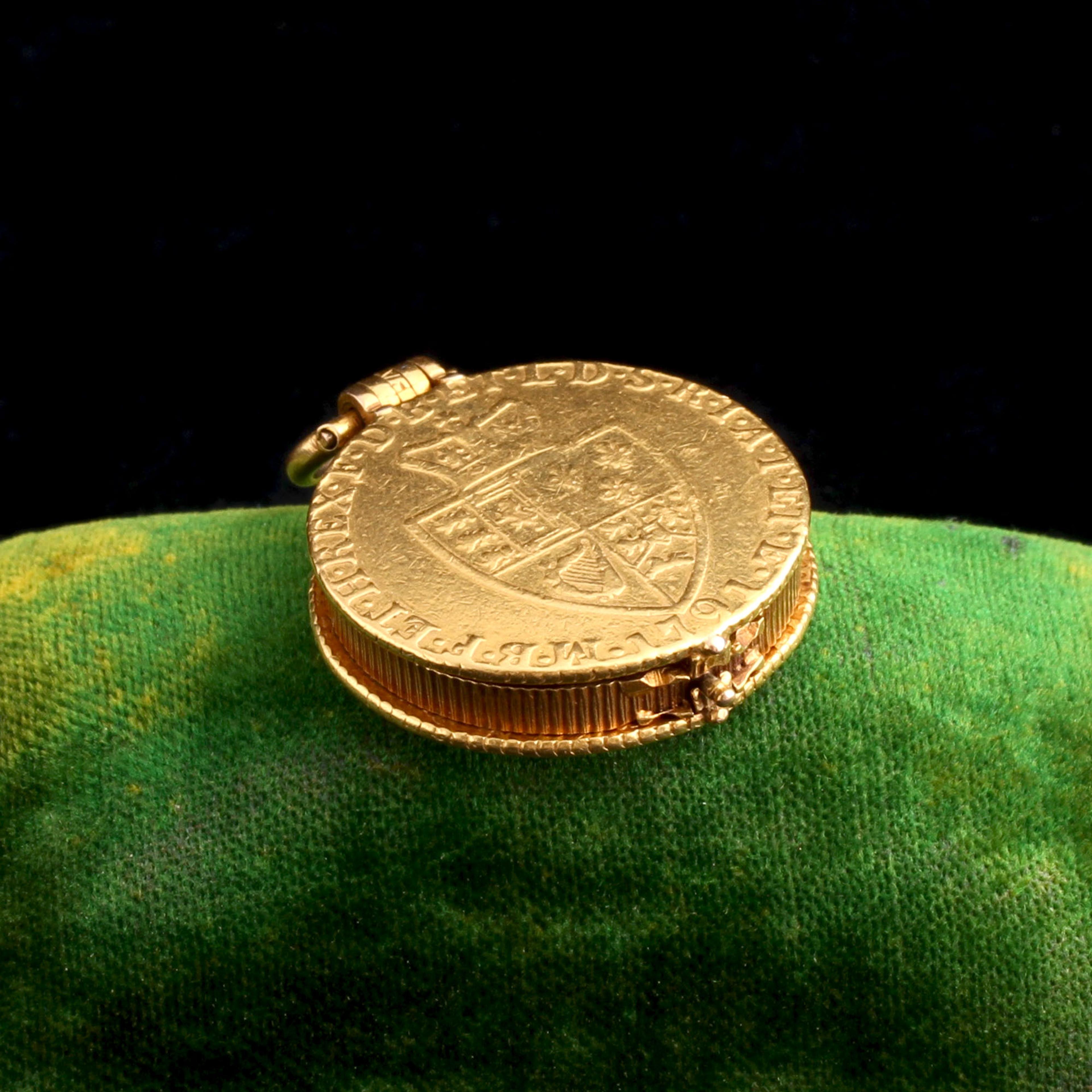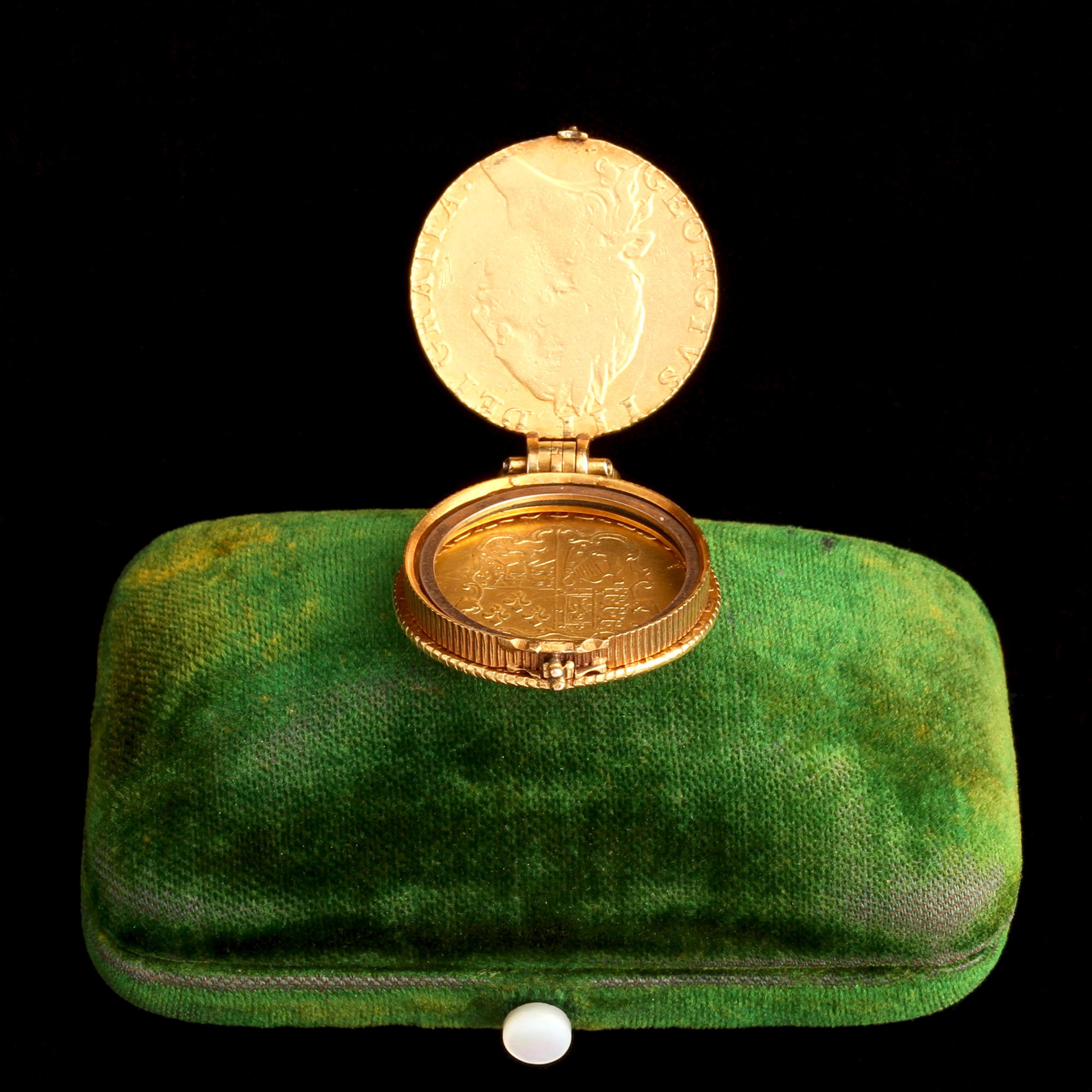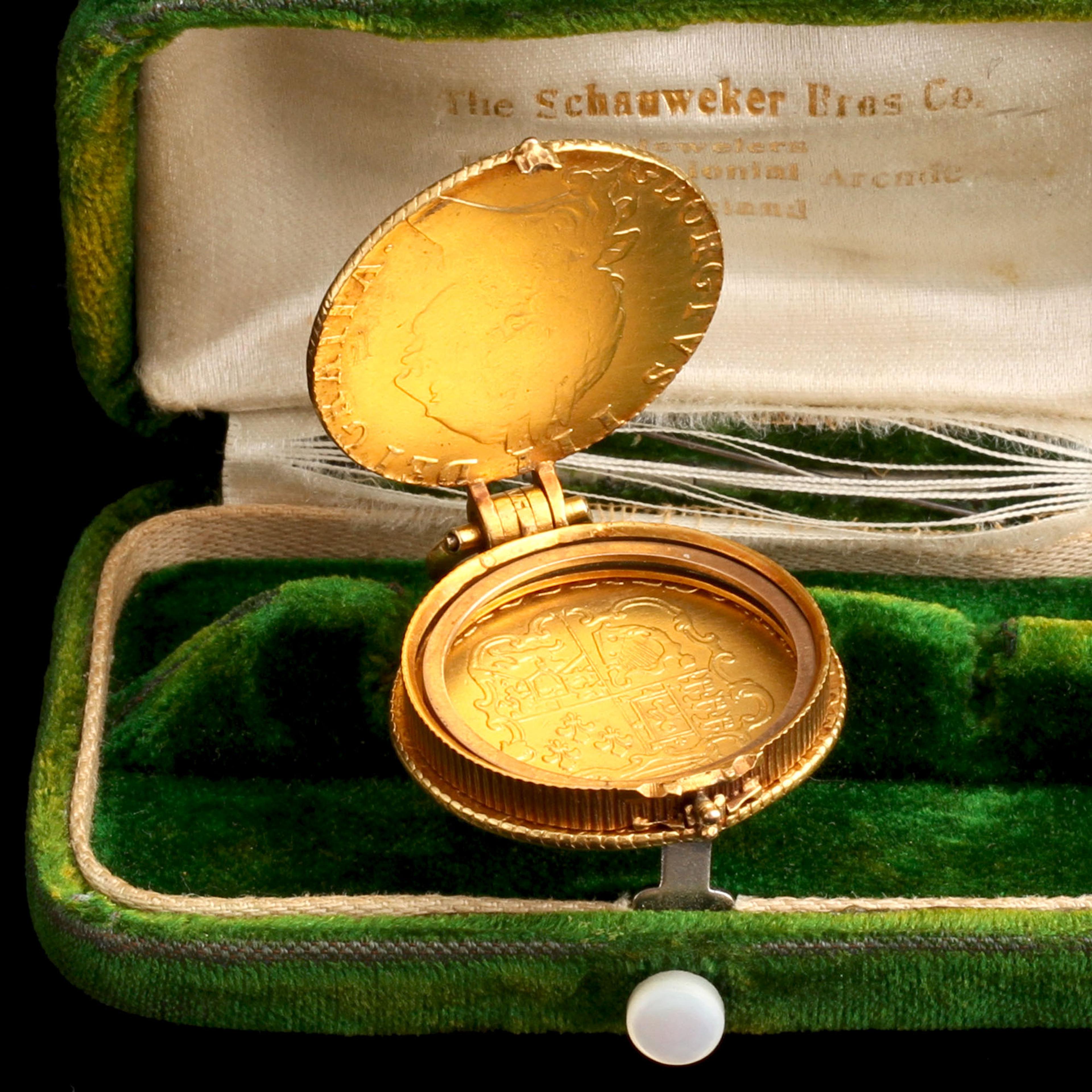 THESE NEARLY PURE (22k) gold guineas, each valued at £1 + 1 shilling, were minted during George III's reign. At the time, a single coin was nearly a week's wages for the average laborer. Today, their scrap value alone is worth hundreds of dollars. Weighing almost exactly 1/4 oz of nearly pure gold, these surviving rare coins are now valued in the thousands. The name "guinea" comes from the West African region where much of the gold for British coins was sourced. During the Victorian period, some clever numismatist repurposed these coins into lockets. Buttery, heavy, rich old gold.