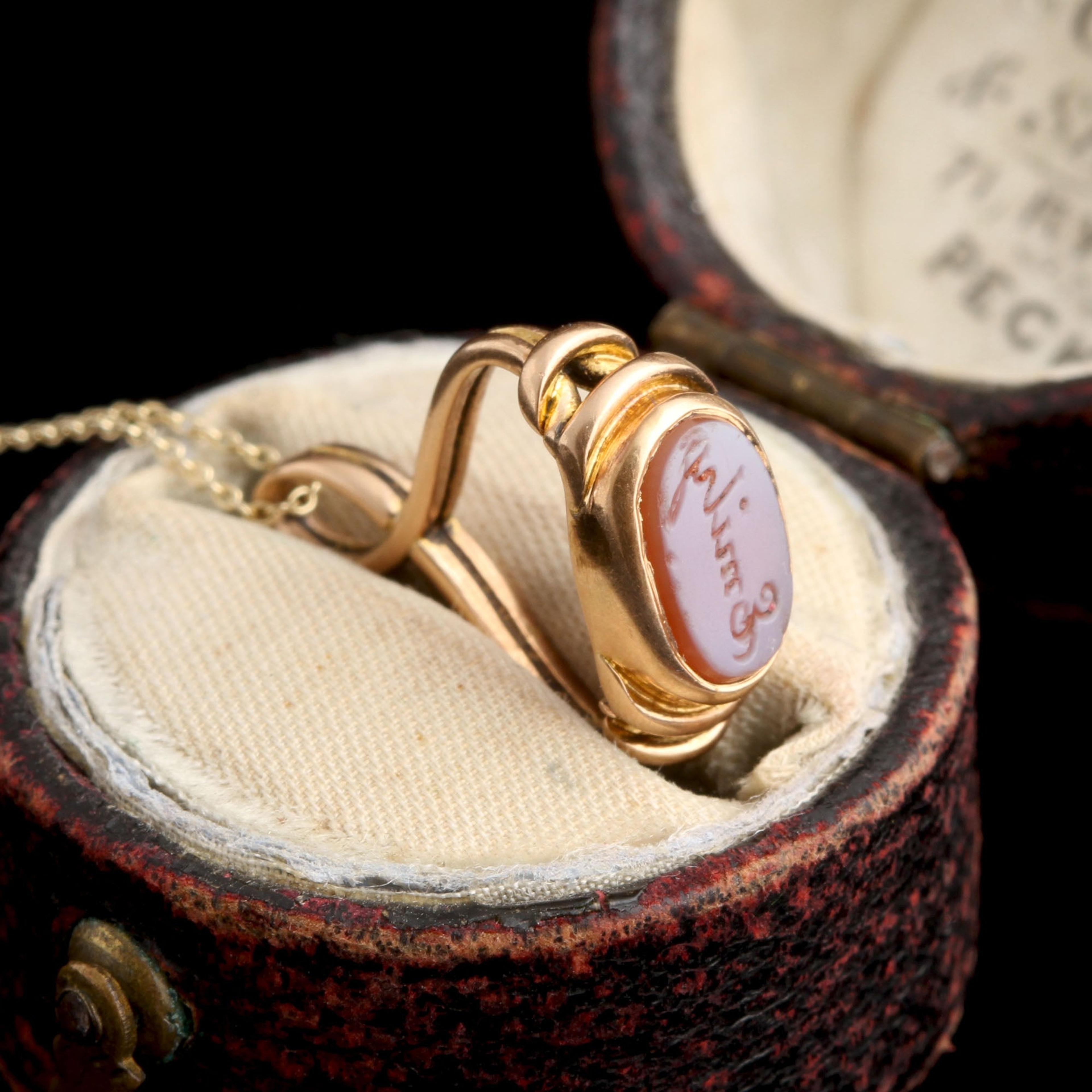 This Victorian fob is made in yellow gold and affixed with a sardonyx intaglio at the base carved with the name “Emily.” The text reads in reverse, as the seal was meant to be pressed into hot wax to create a right-way-around impression. On a new 18" 14k gold chain.