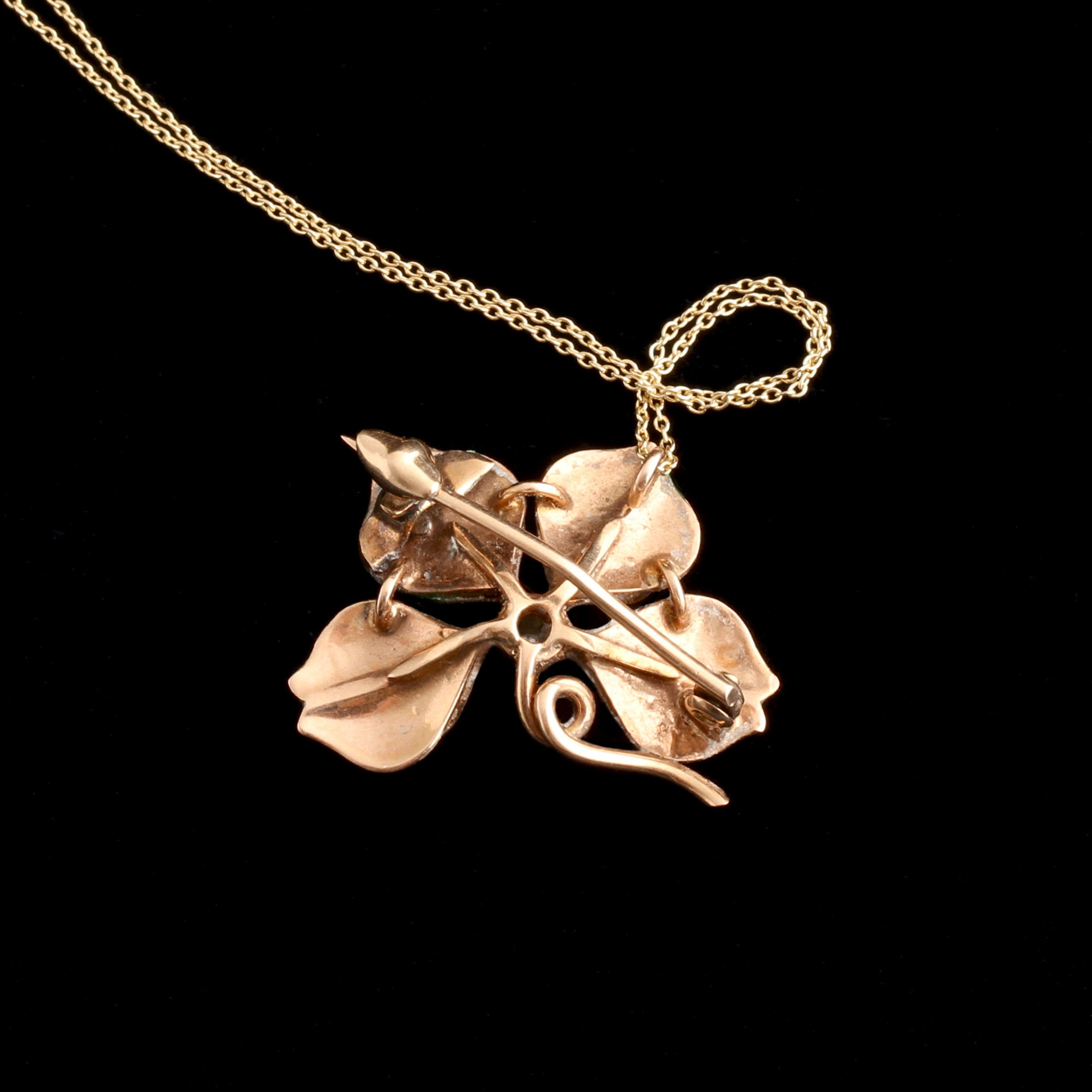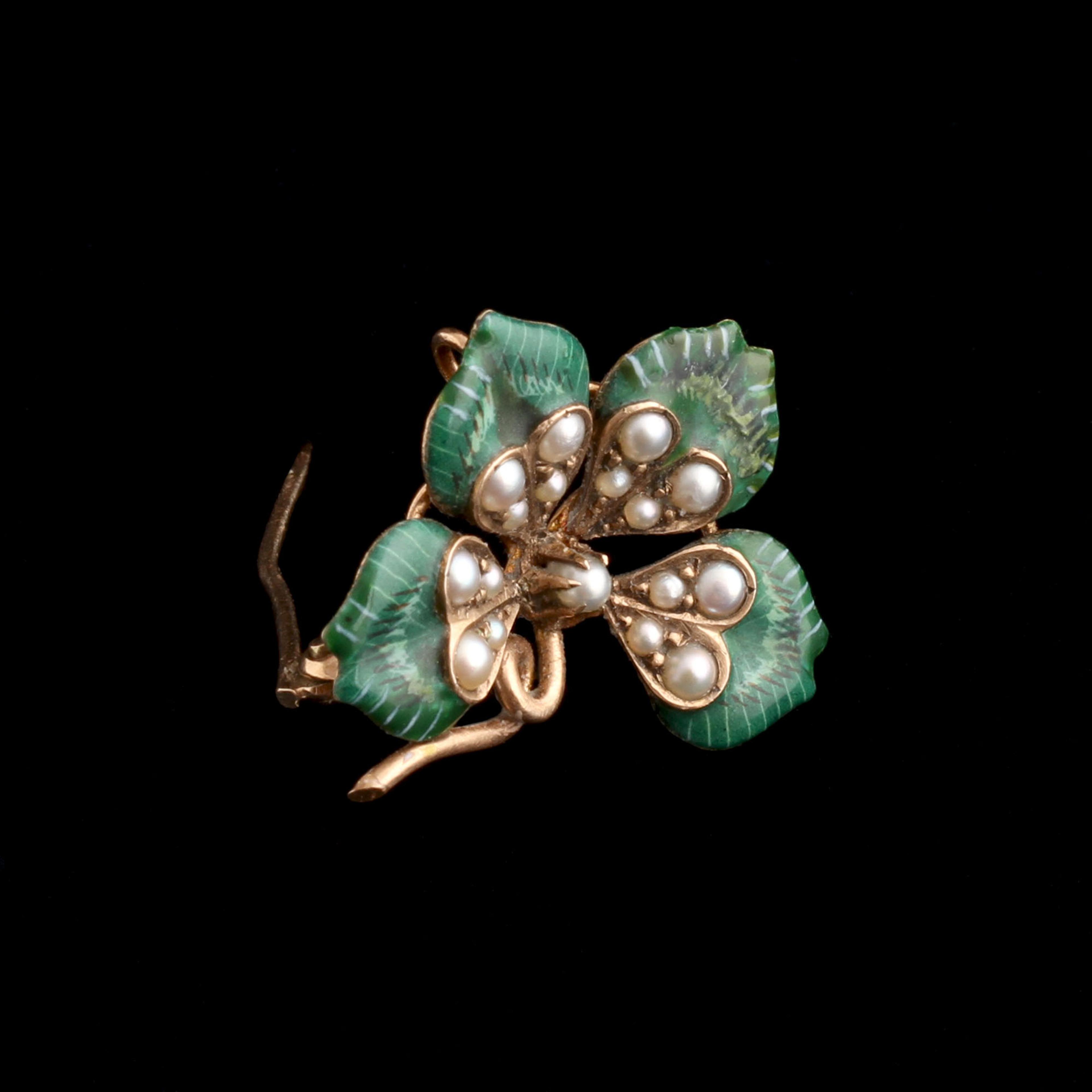 A four leaf clover pendant/brooch dating to the later Victorian era. This lucky charm is artfully enameled in varied hues of green and set with seed pearls (note the heart shapes on the leaves!).