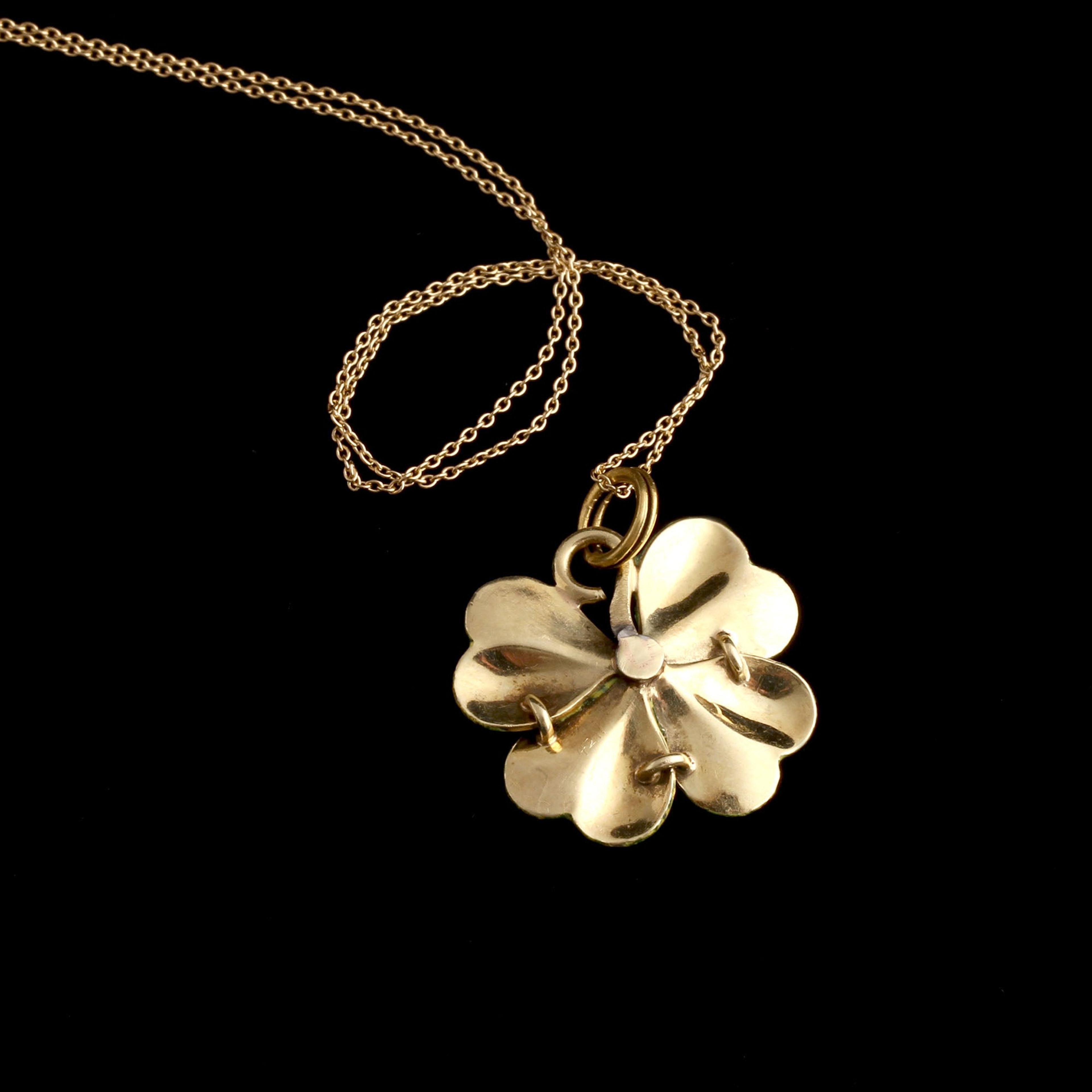 Good luck! This late 19th century four leaf clover is enameled with thoughtful veined details.