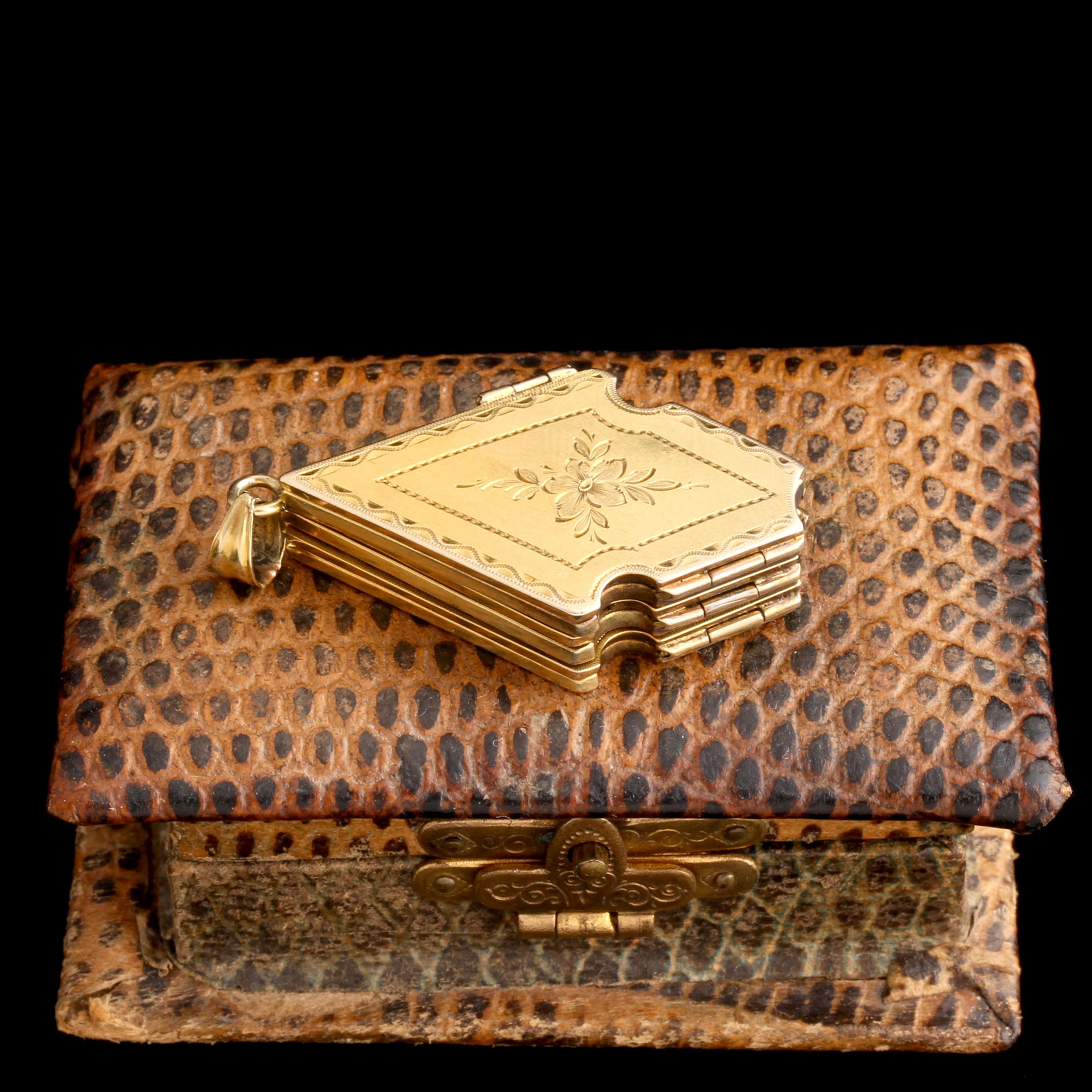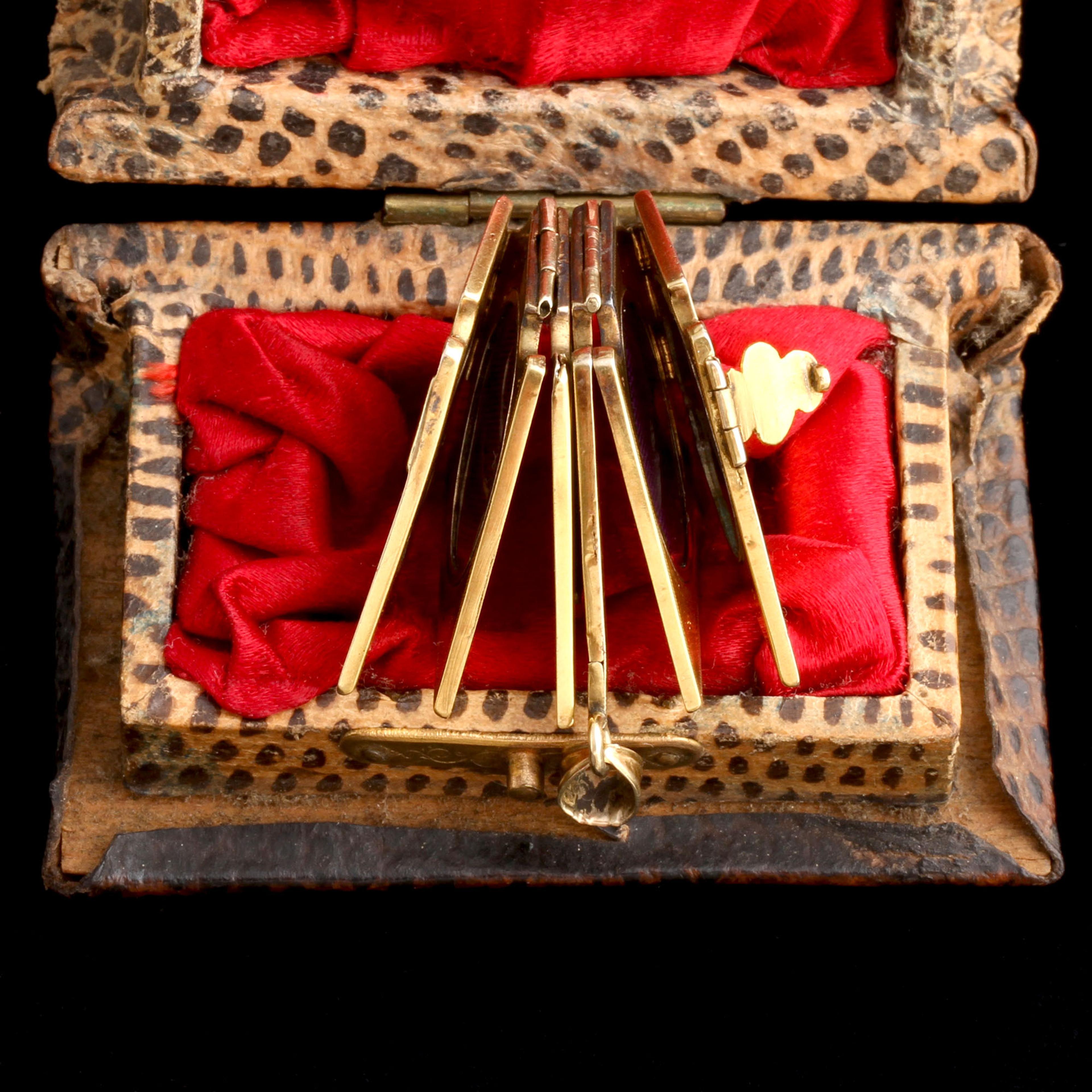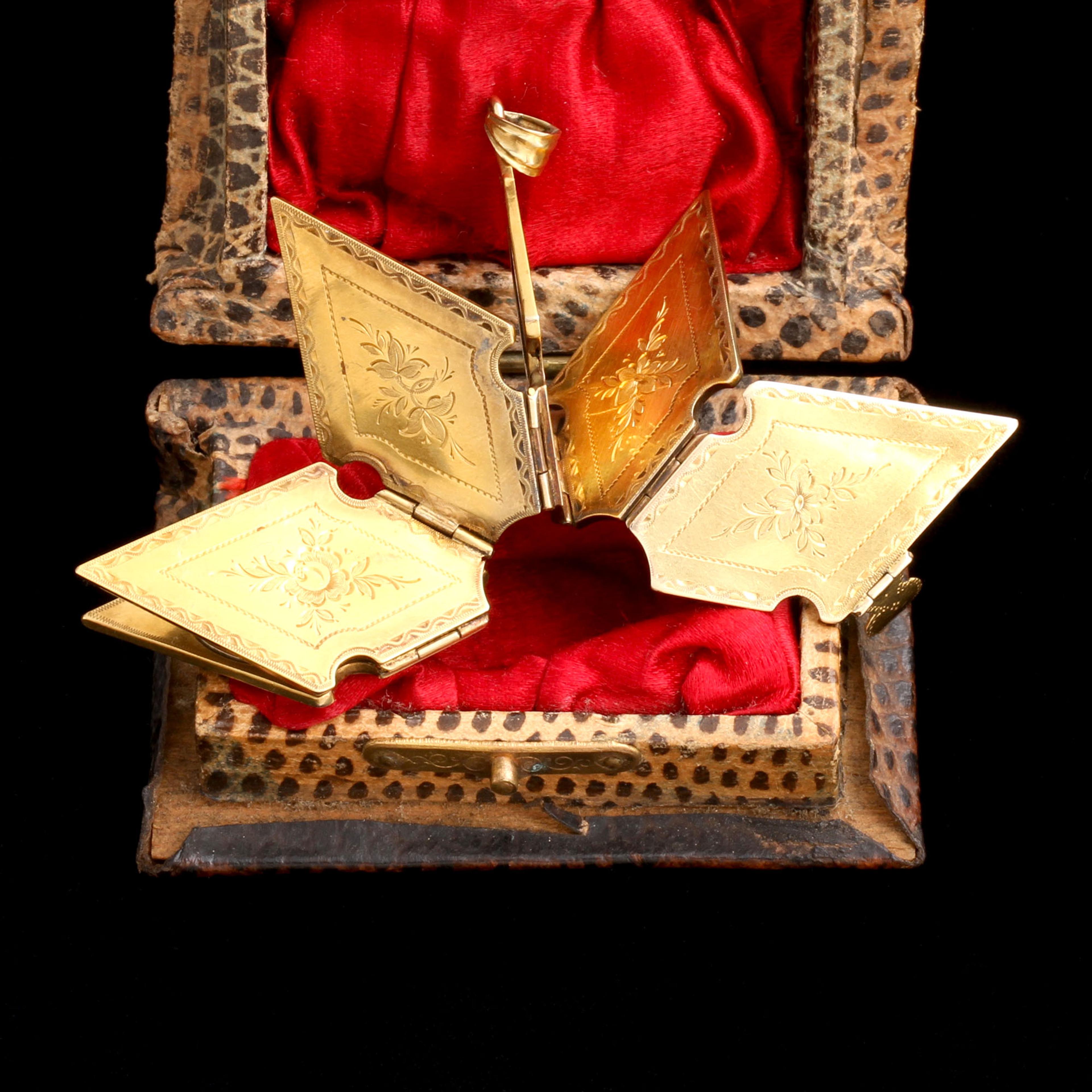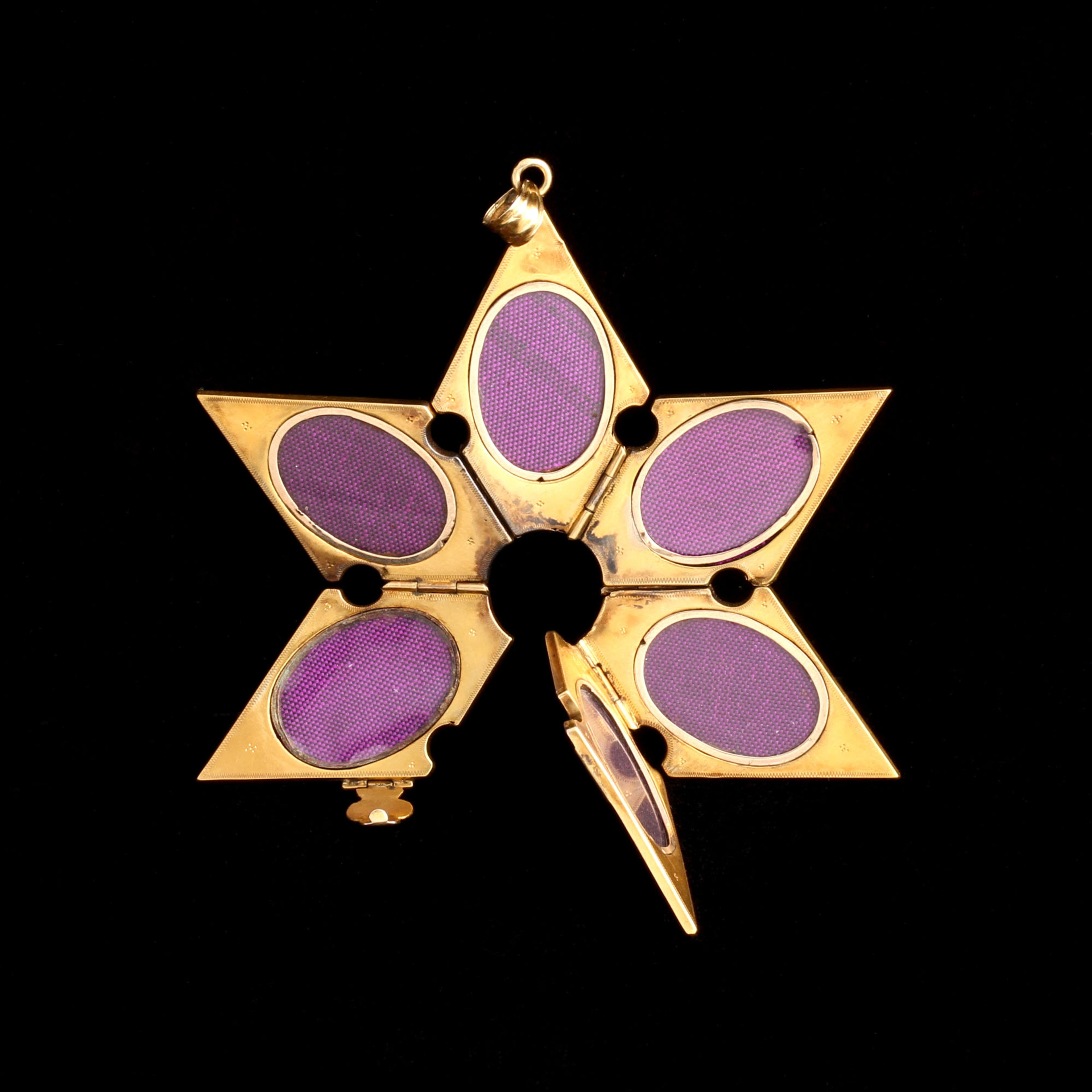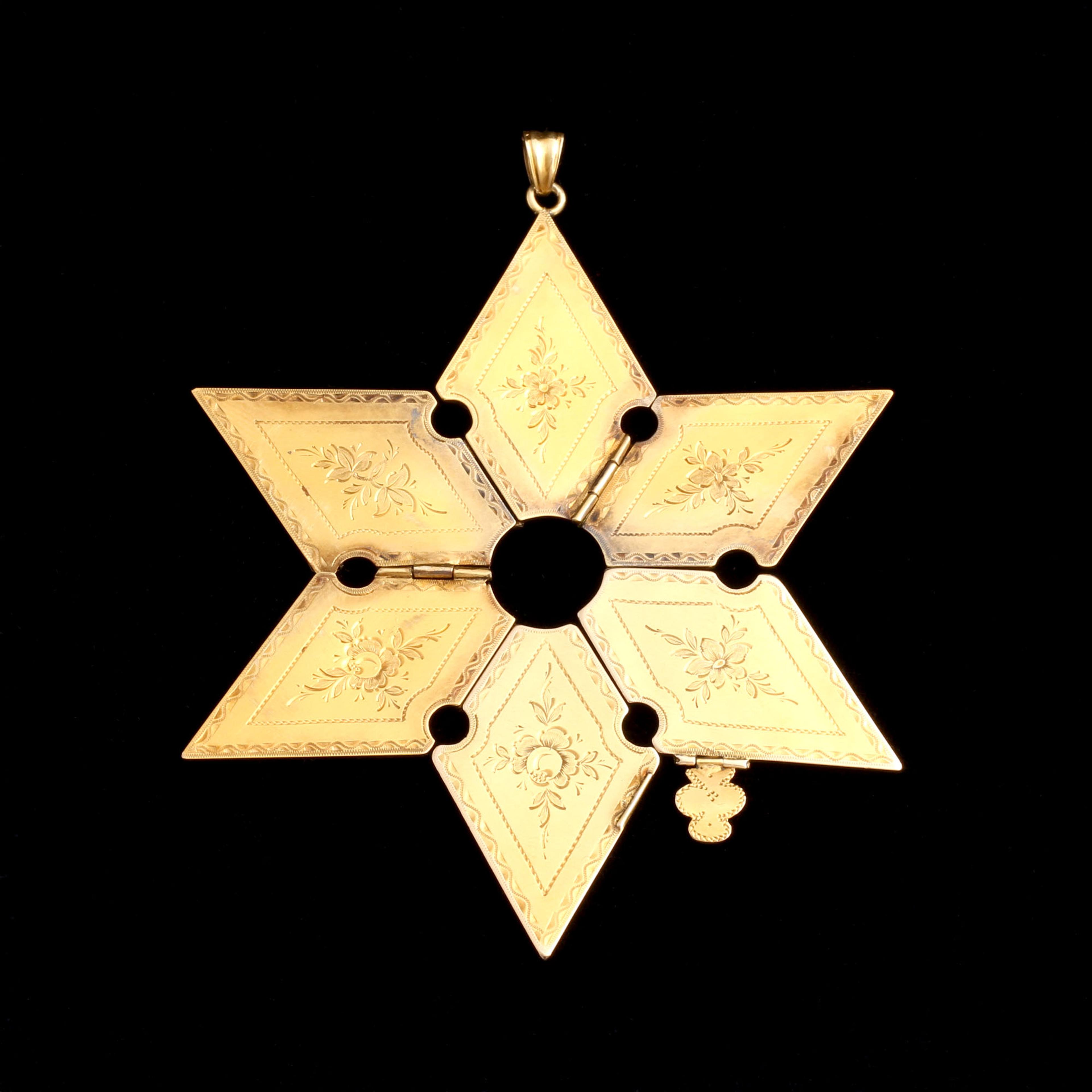 What mechanical genius developed this complex folding locket around the year 1870? Six panels fold out to create a six-pointed star when open. Heavy, ornately engraved, and BIG, it's 3 inches long when fully expanded. Ready for the addition of your family's pics.