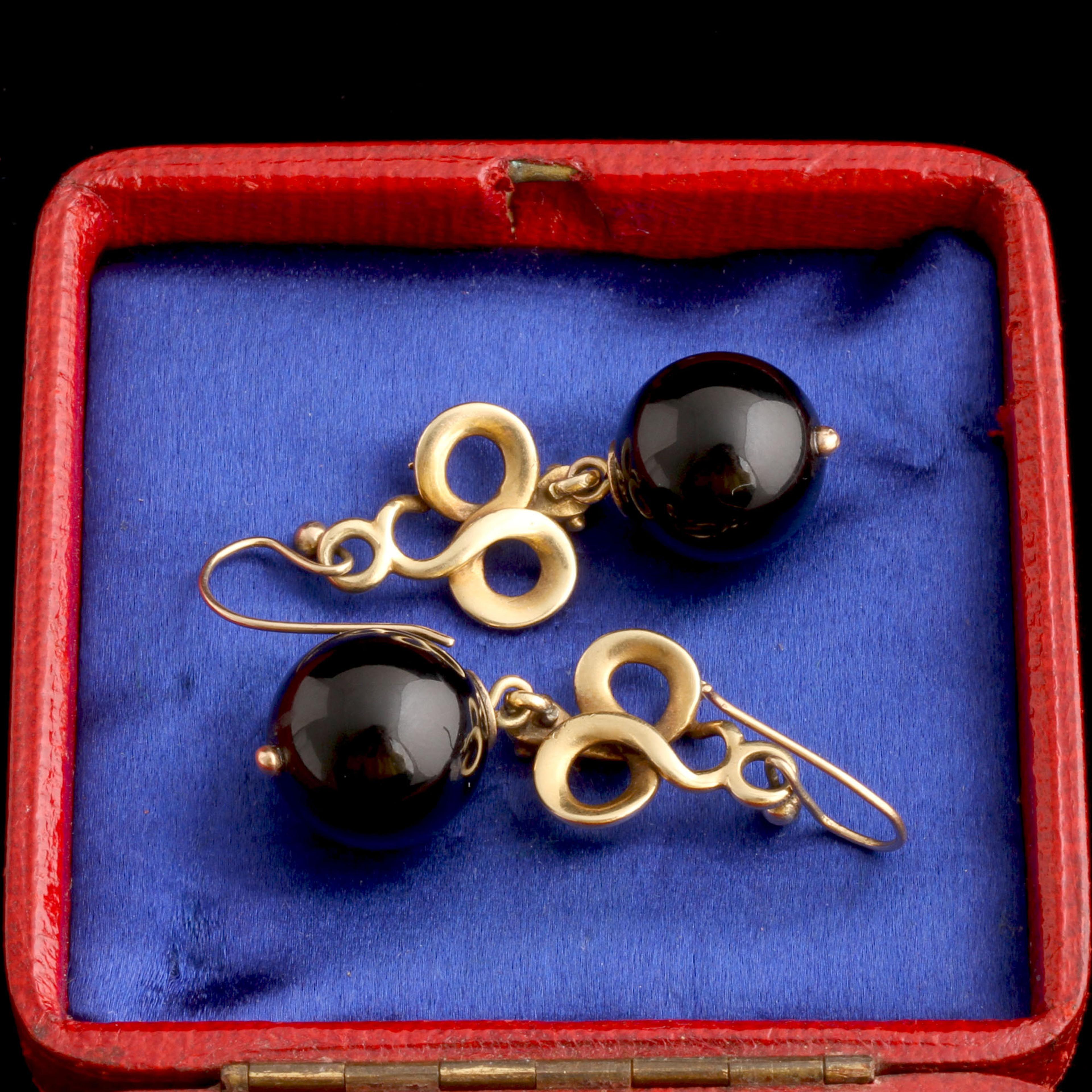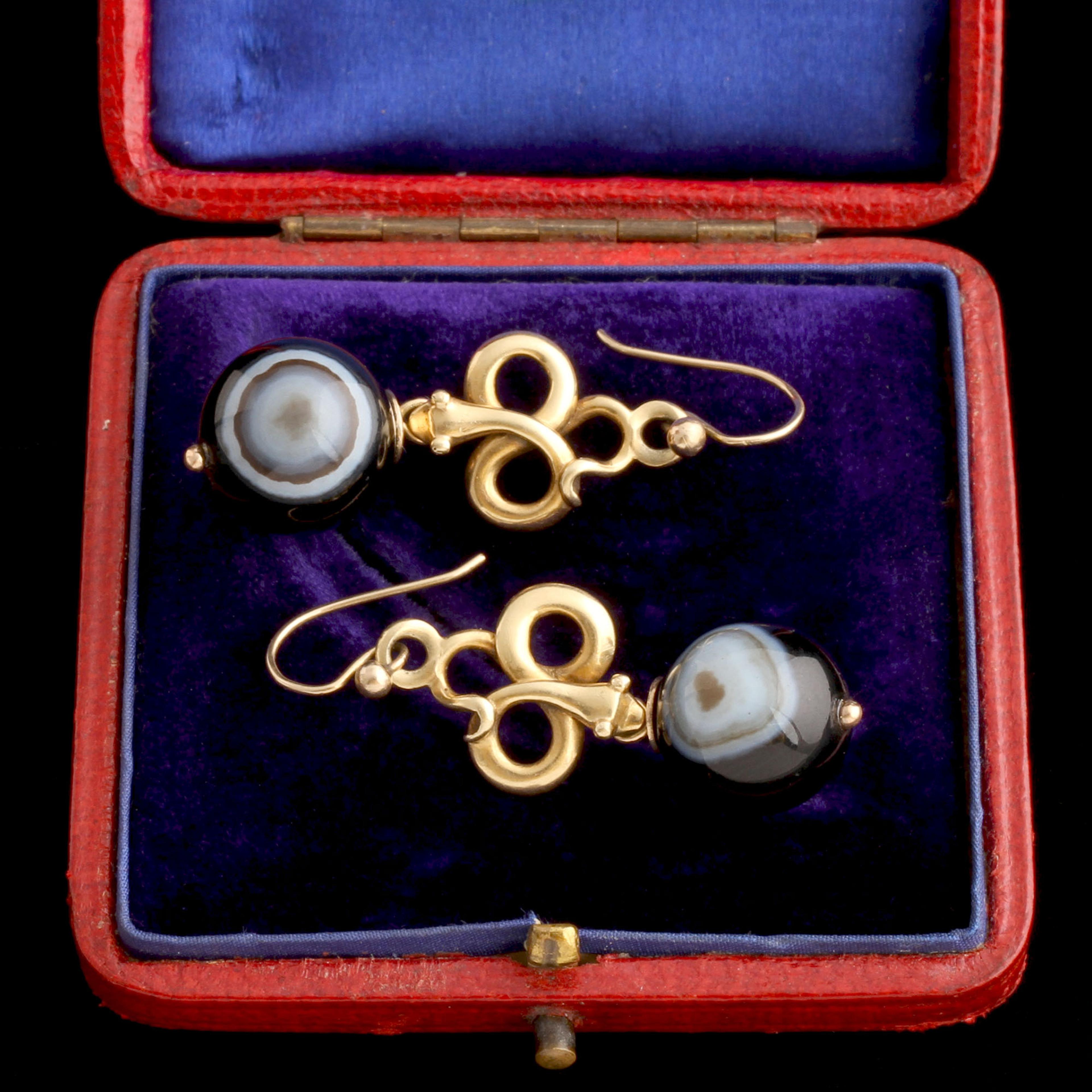 Infinity-shaped snakes dangle banded agate orbs from their mouths. This black and white striped stone looks like a bullseye - and resembles an evil-repelling eye talisman - when carved into a sphere. The spermy look (delightful!) was an 1850s thing.