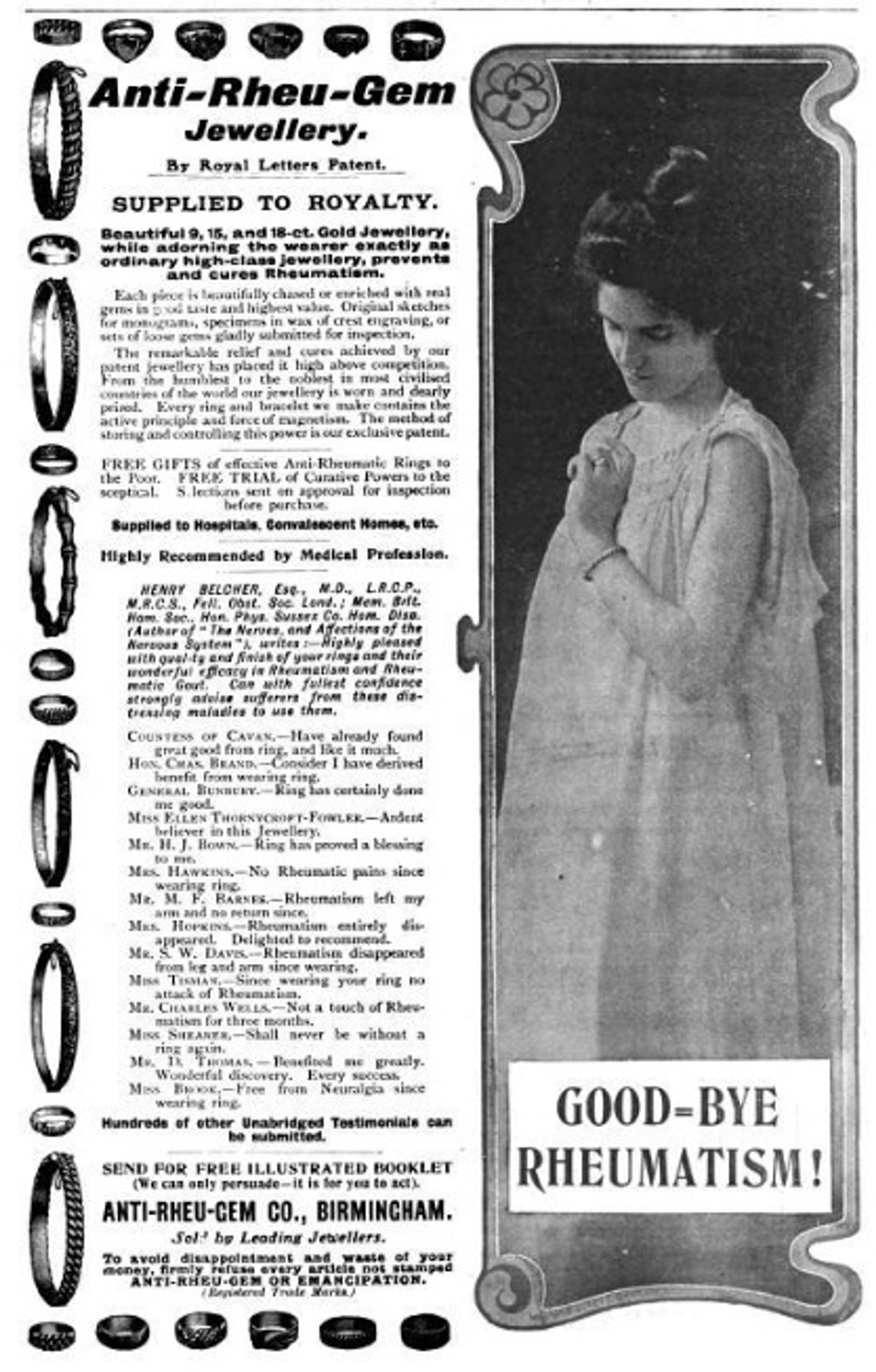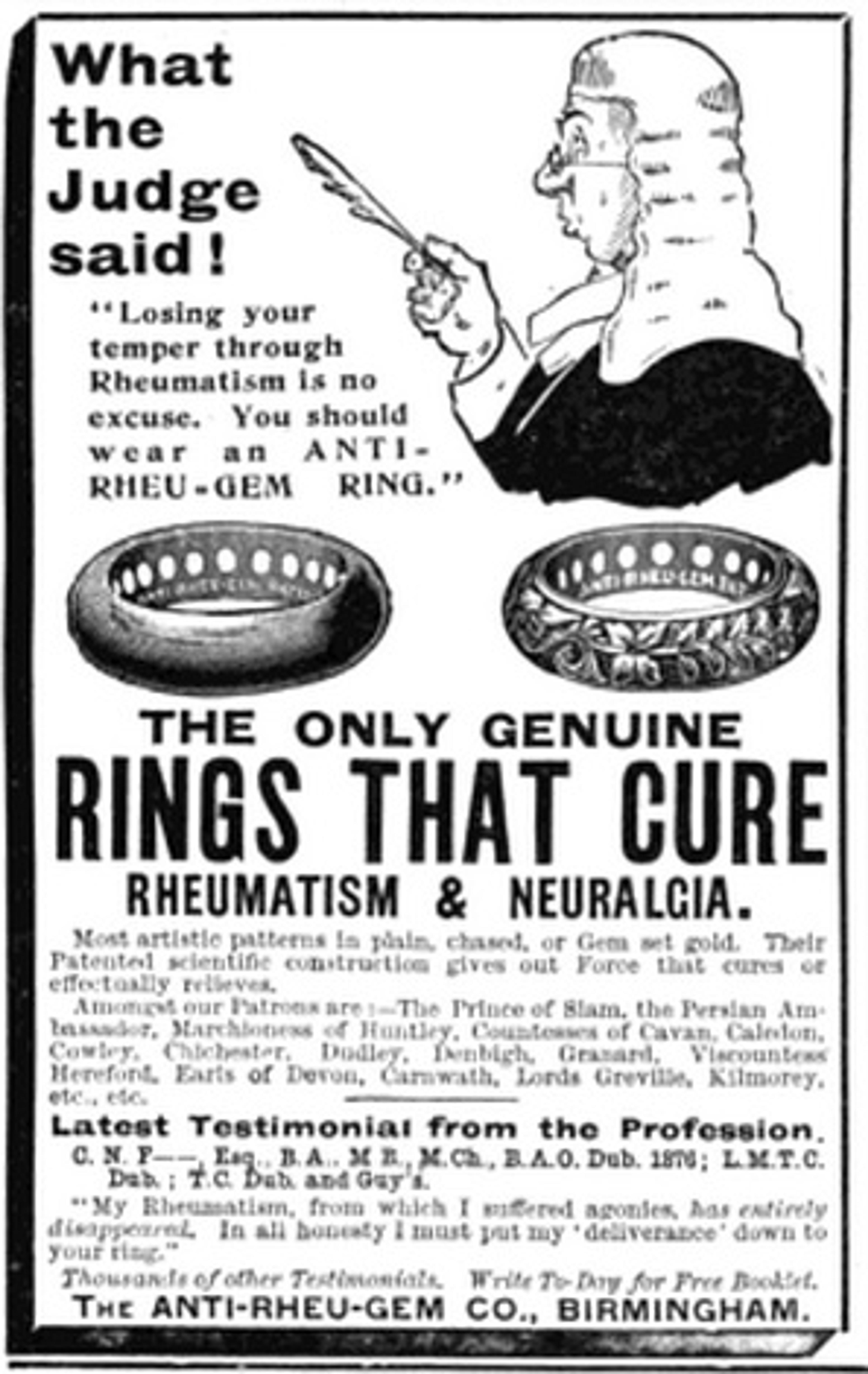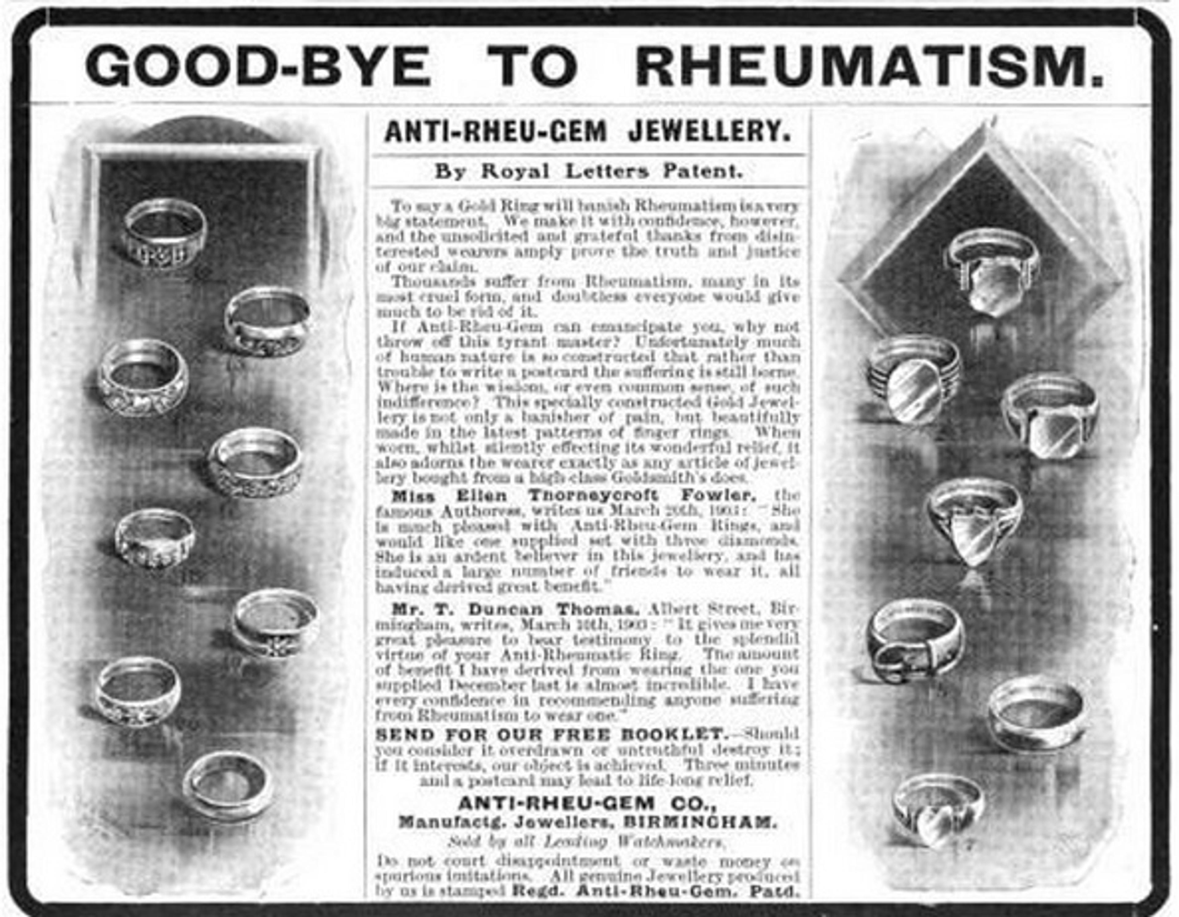 Since the discovery of copper in the blood, many people hoped that rheumatism - aka arthritis - could be relieved by wearing a magnet on your skin. It's not true, but people were desperate for relief and Victorian snake oil salesmen were desperate for business. Patents always made dubious products seem legit, so this "anti rheumatism" ring is stamped with the official-looking details ANTI RHEU GEM PAT. Advertisements exist from 1903 and 1905 for this product, and in them we can see many marketing tactics in their infancy. "Worn by the King of Siam". (Celeb endorsements!) Testimonials include the Countess of Cavan, whose ring made her "experience an absence of neuralgia". The manufacturer - so charitable! - claims to have given "free gifts of anti-rheumatic rings to the poor." But in the end, the company was also dialed in to trends. Although "fern madness" was dying down by the Edwardian era, the motif remained popular "as a fond symbol of pleasurable pursuits".