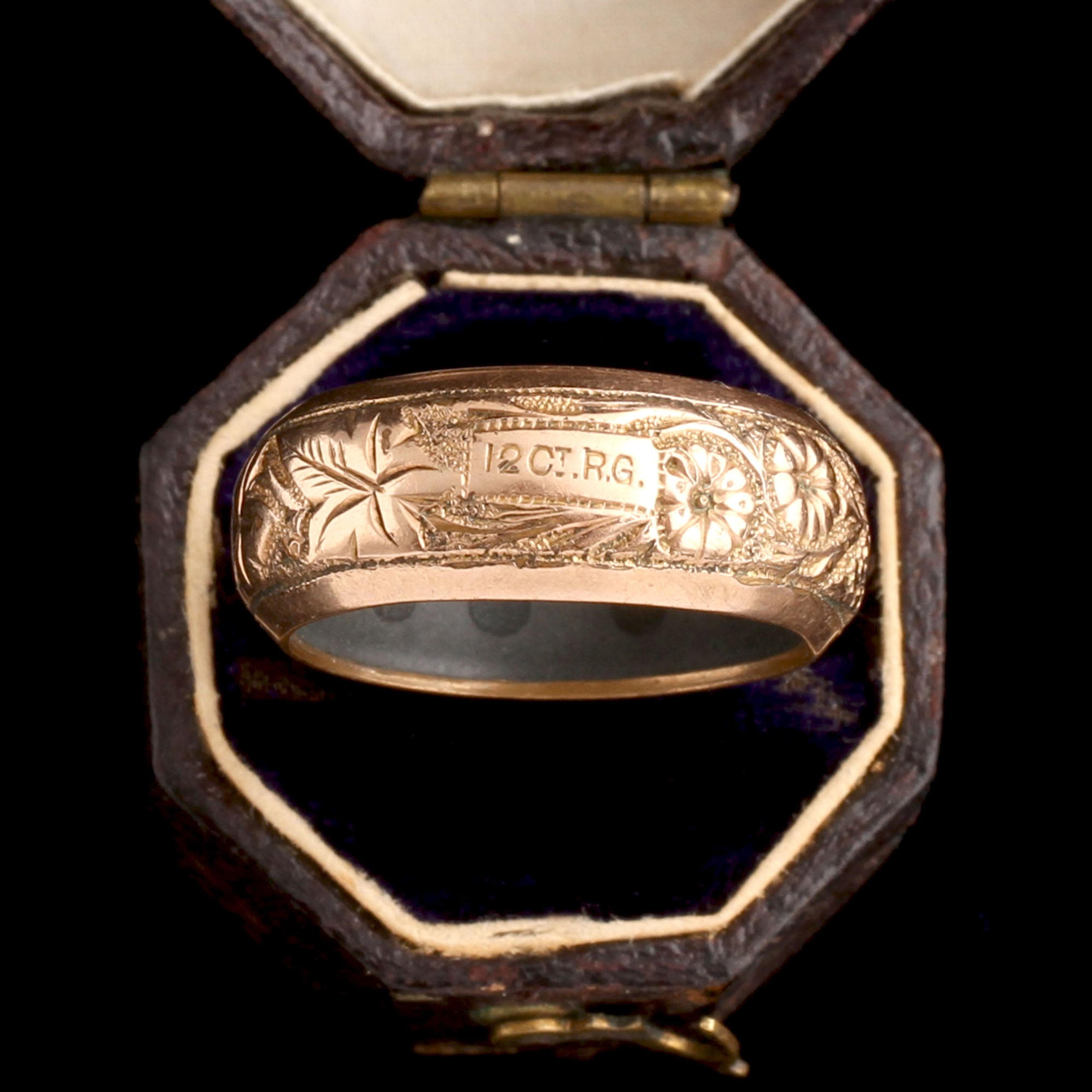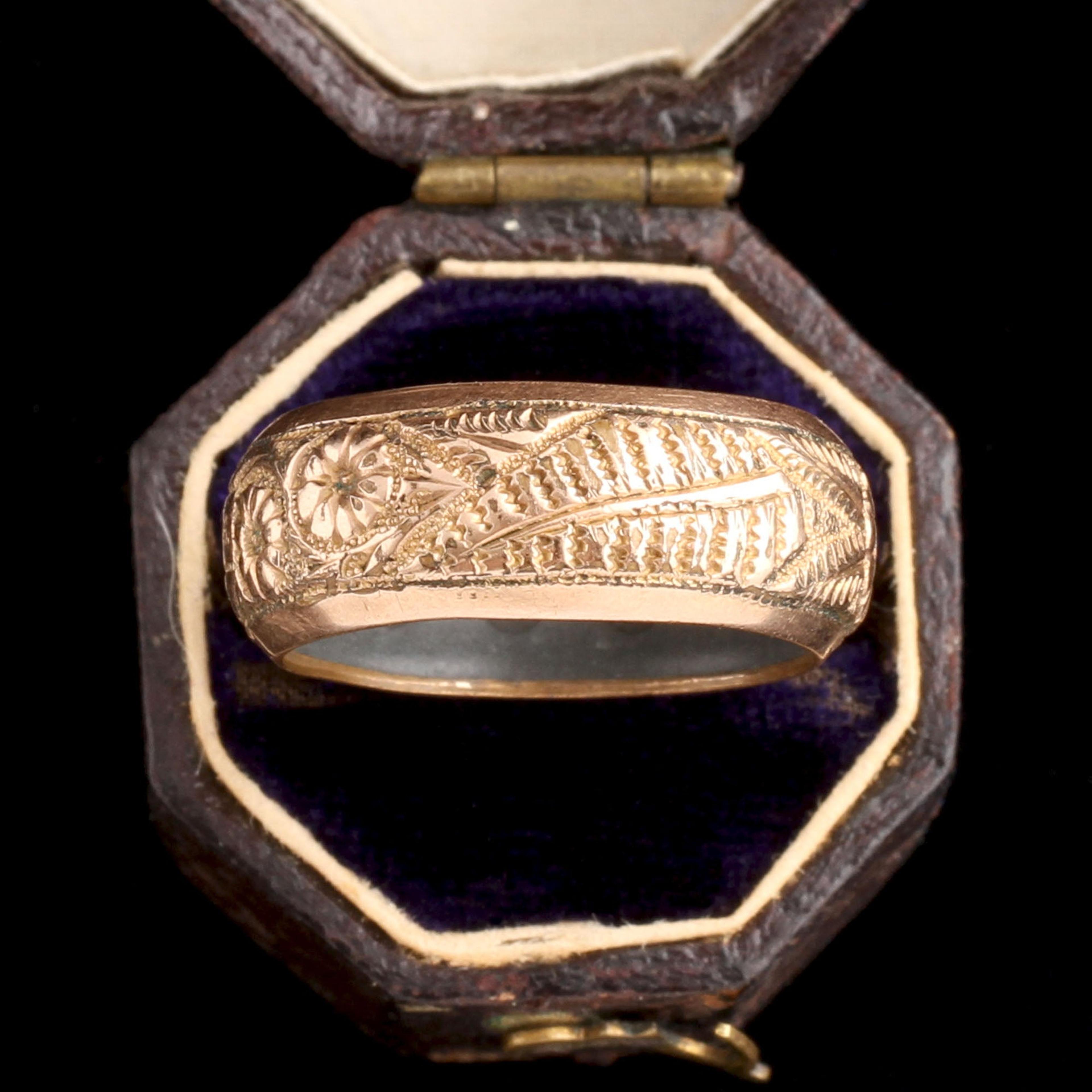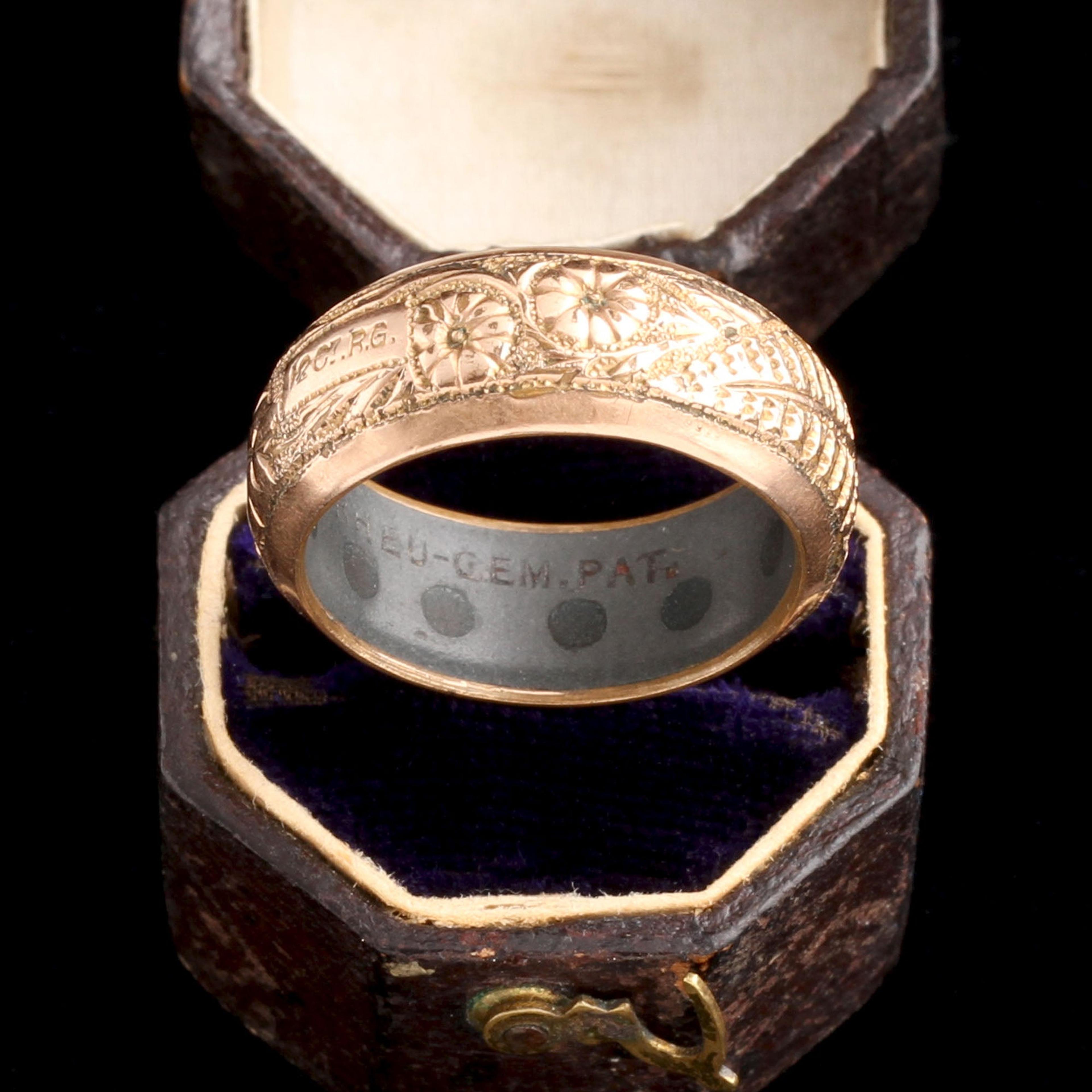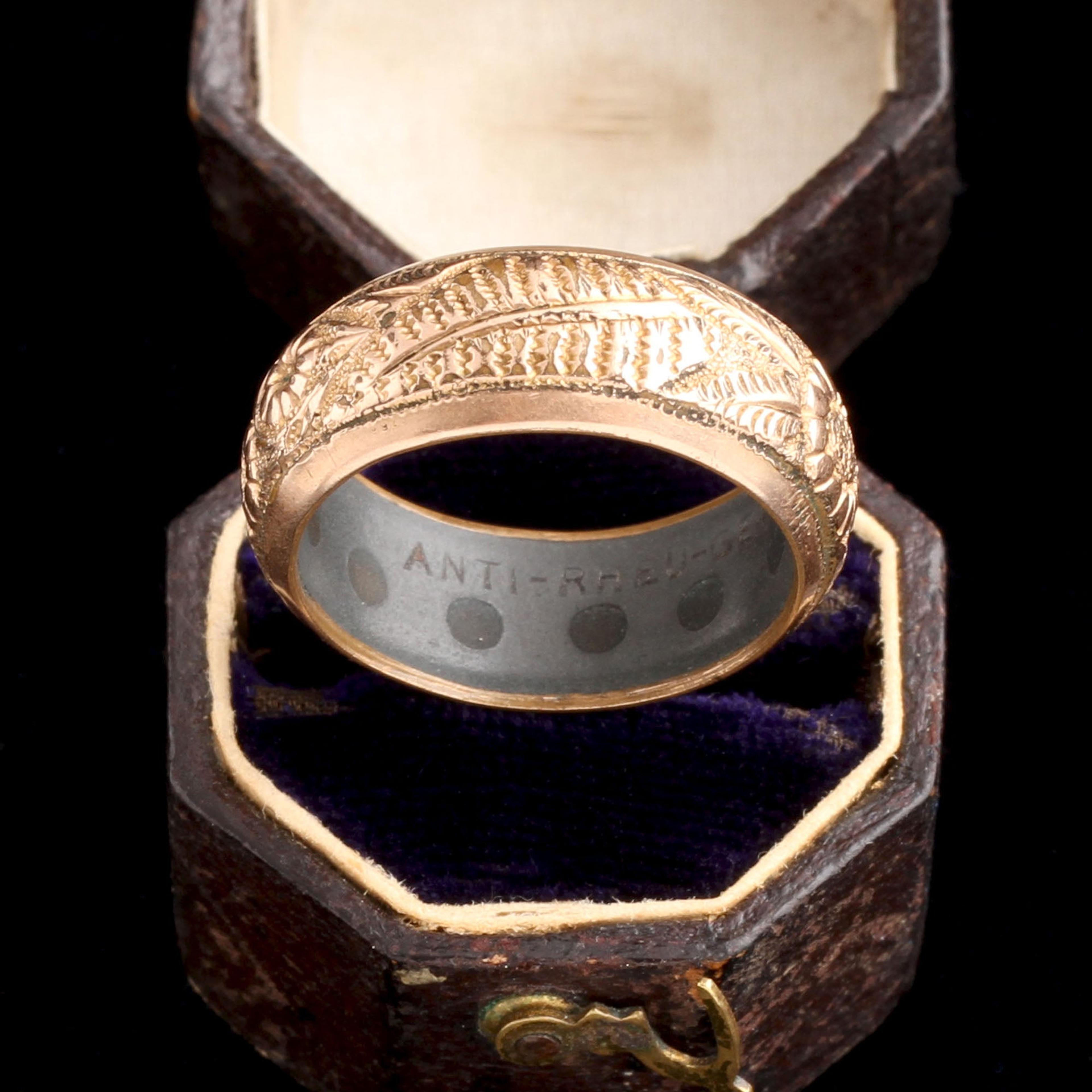 Since the discovery of copper in the blood, many people hoped that rheumatism - aka arthritis - could be relieved by wearing a magnet on your skin. It's not true, but people were desperate for relief and Victorian snake oil salesmen were desperate for business. Patents always made dubious products seem legit, so this "anti rheumatism" ring is stamped with the official-looking details ANTI RHEU GEM PAT. Advertisements exist from 1903 and 1905 for this product, and in them we can see many marketing tactics in their infancy. "Worn by the King of Siam". (Celeb endorsements!) Testimonials include the Countess of Cavan, whose ring made her "experience an absence of neuralgia". The manufacturer - so charitable! - claims to have given "free gifts of anti-rheumatic rings to the poor." But in the end, the company was also dialed in to trends. Although "fern madness" was dying down by the Edwardian era, the motif remained popular "as a fond symbol of pleasurable pursuits".