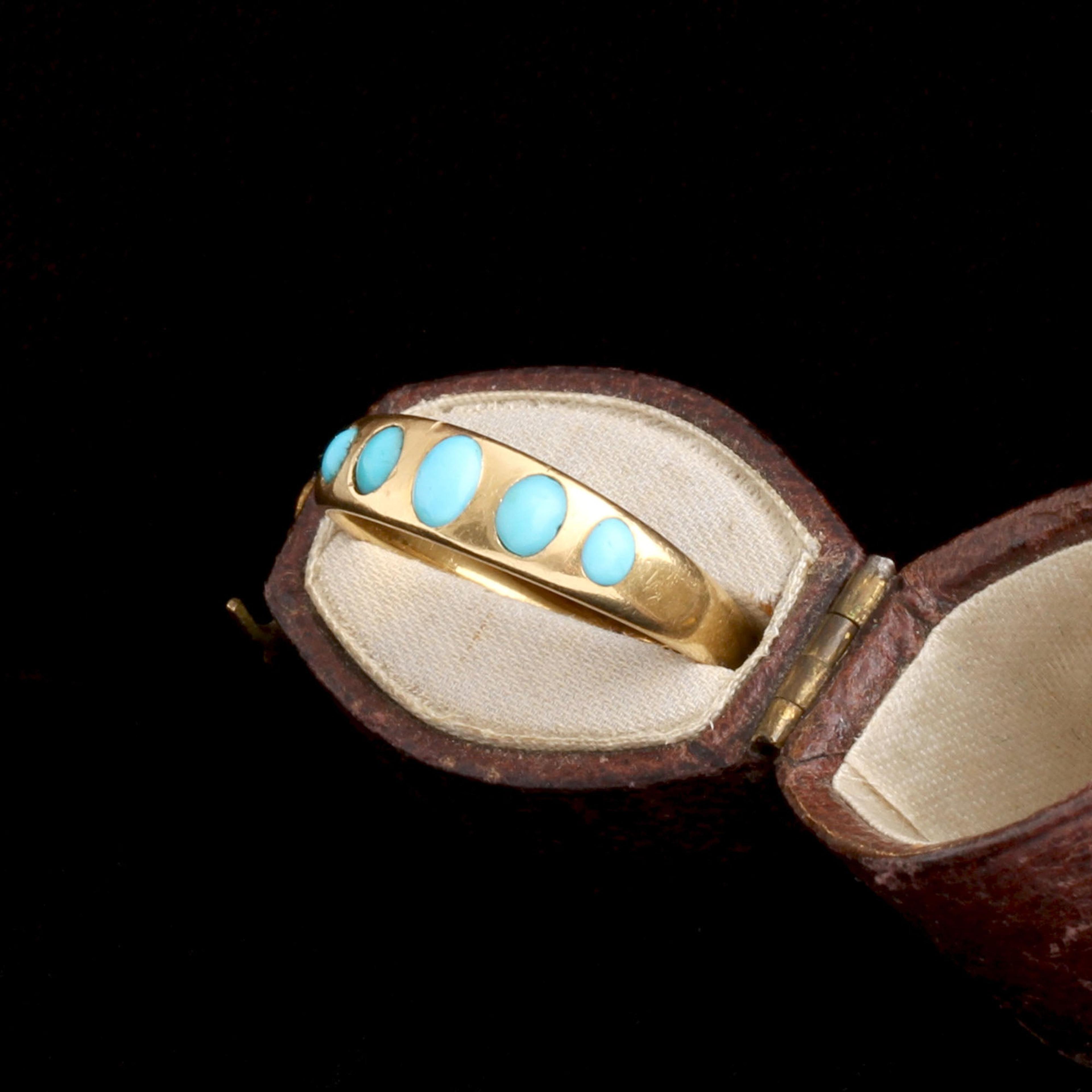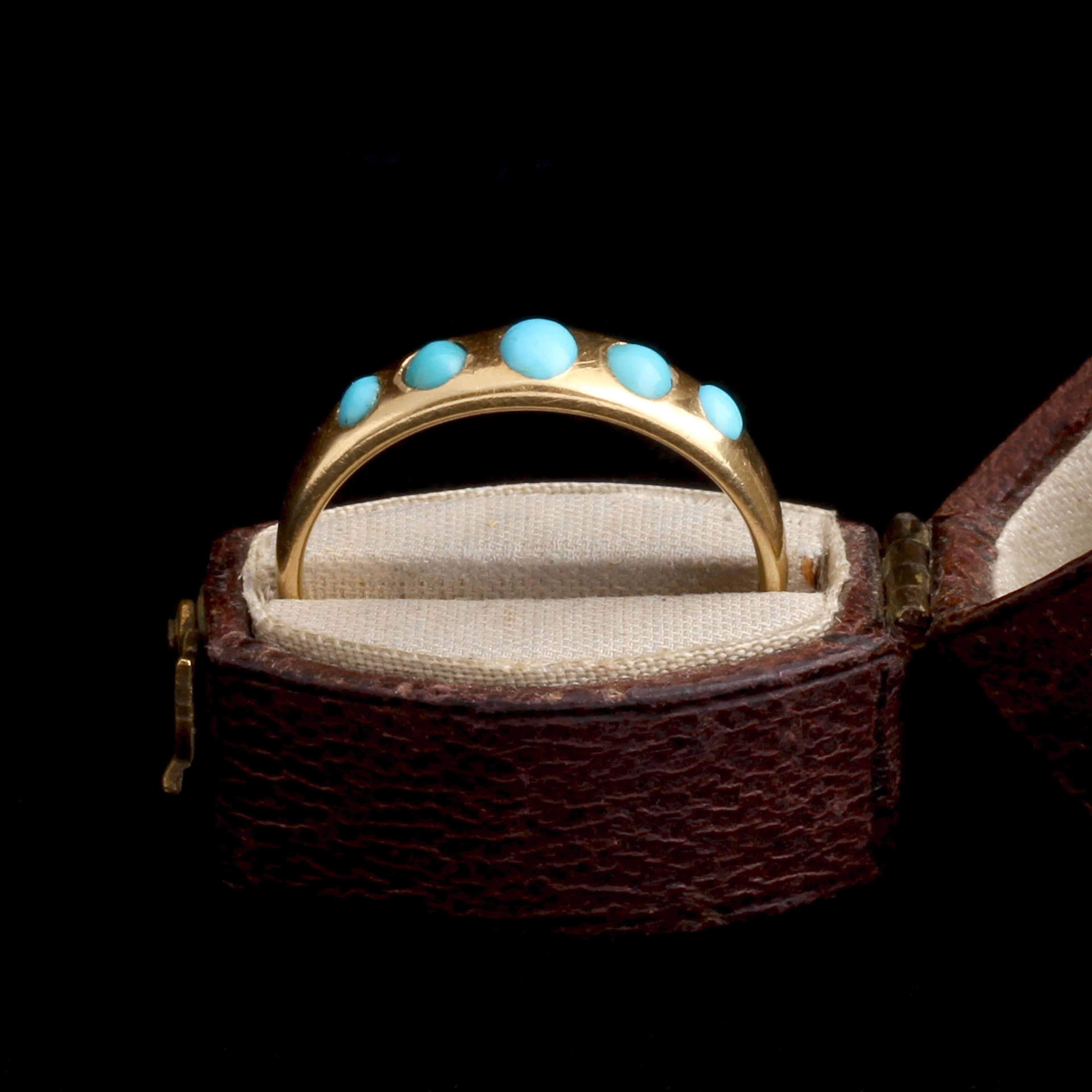 Queen Victoria was a great fan of turquoise. She reportedly gave each of her ladies-in-waiting a portrait ring framed with turquoise cabochons. Victorians were always eager to emulate the queen, so wearing gold with turquoise was considered almost a sartorial necessity during the era. This Victorian band is made in 18k yellow gold and set with five sky blue turquoise cabochons. The inside of the band is hallmarked for London - we estimate around 1880 - although the date letter has been sized out.